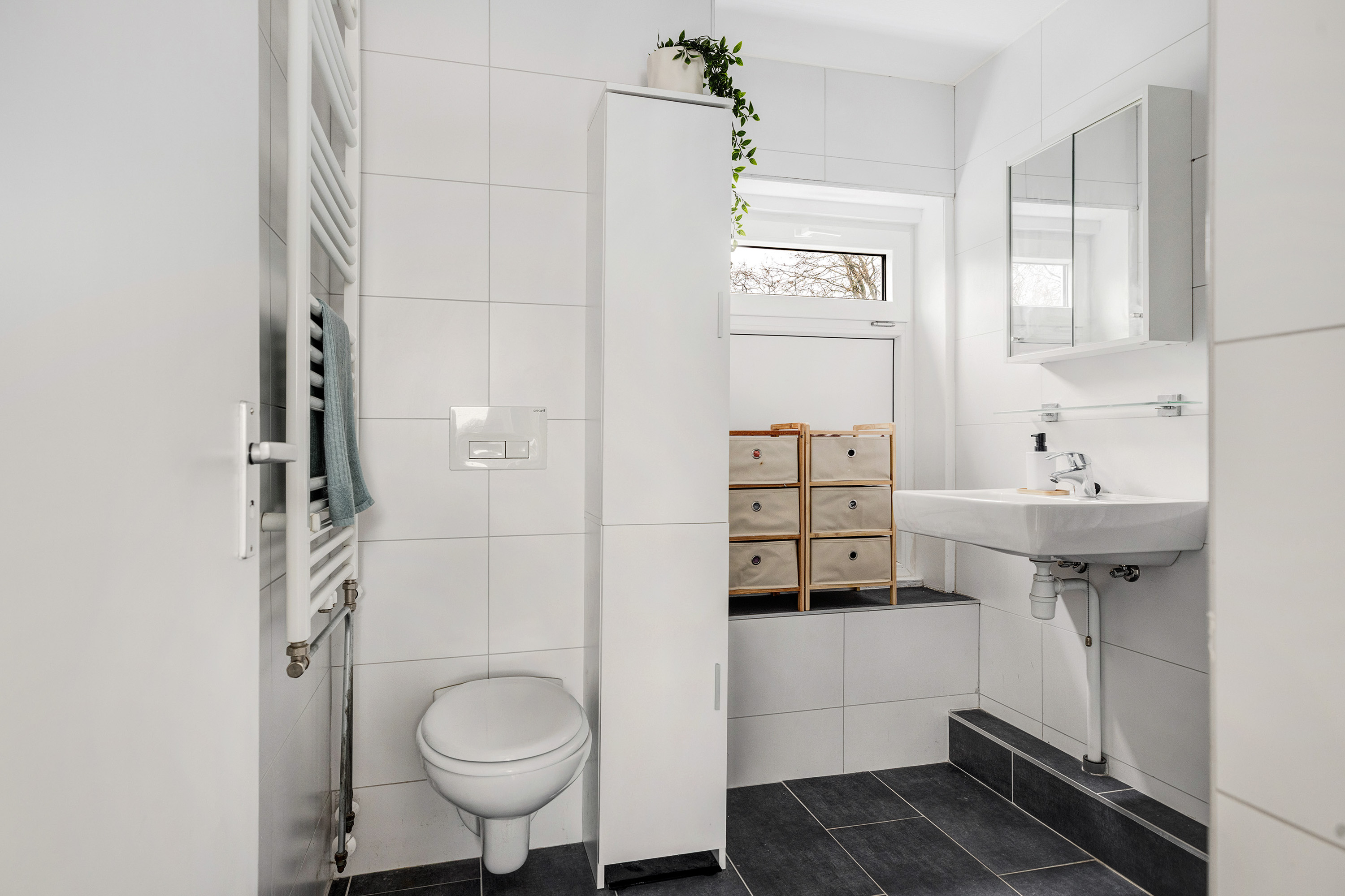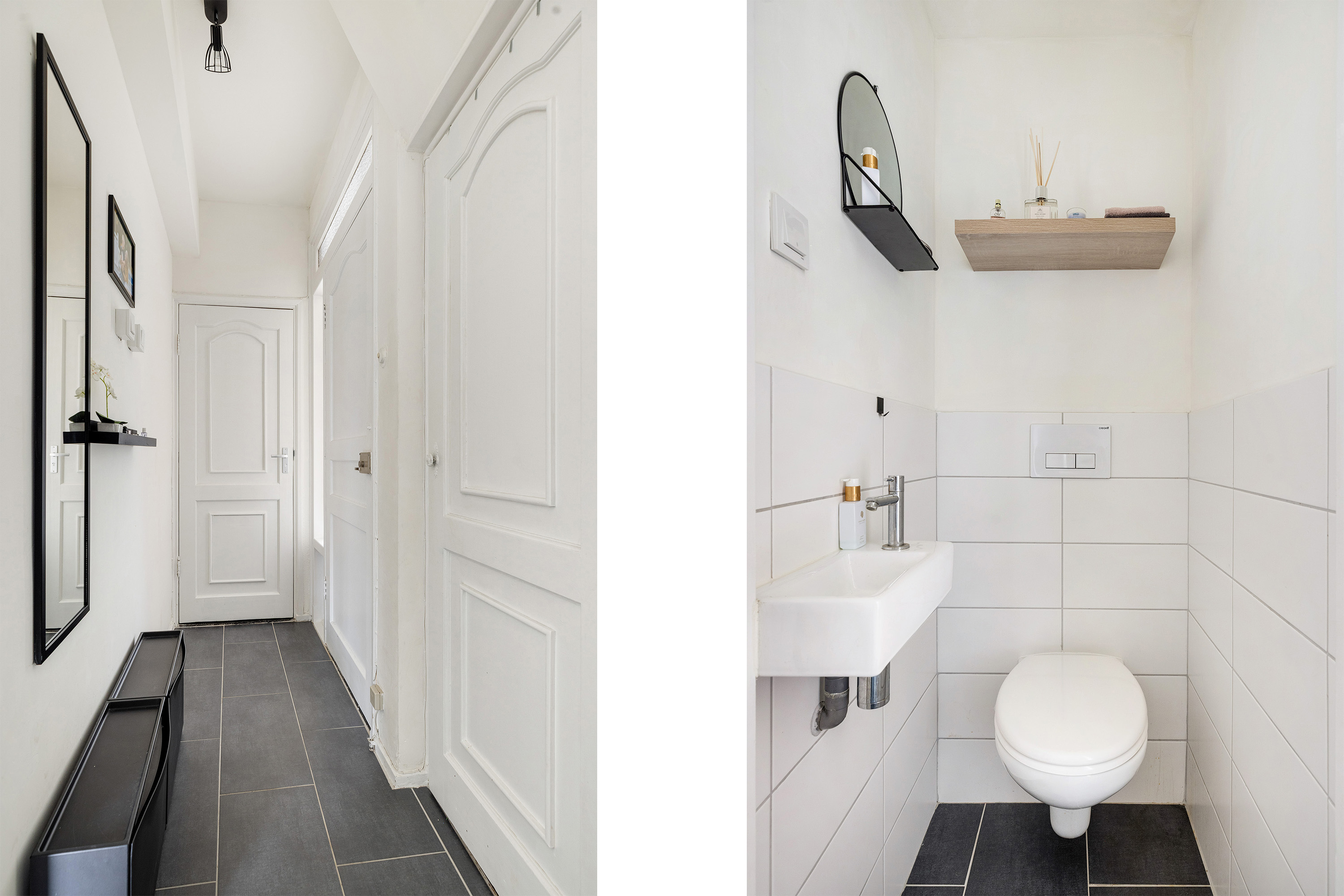 Entree in de hal met meterkast en de toiletruimte. Het toilet is uitgevoerd met een hangend closet en fonteintje en is gedeeltelijk betegeld met een witte wandtegel en een grijze vloertegel.
