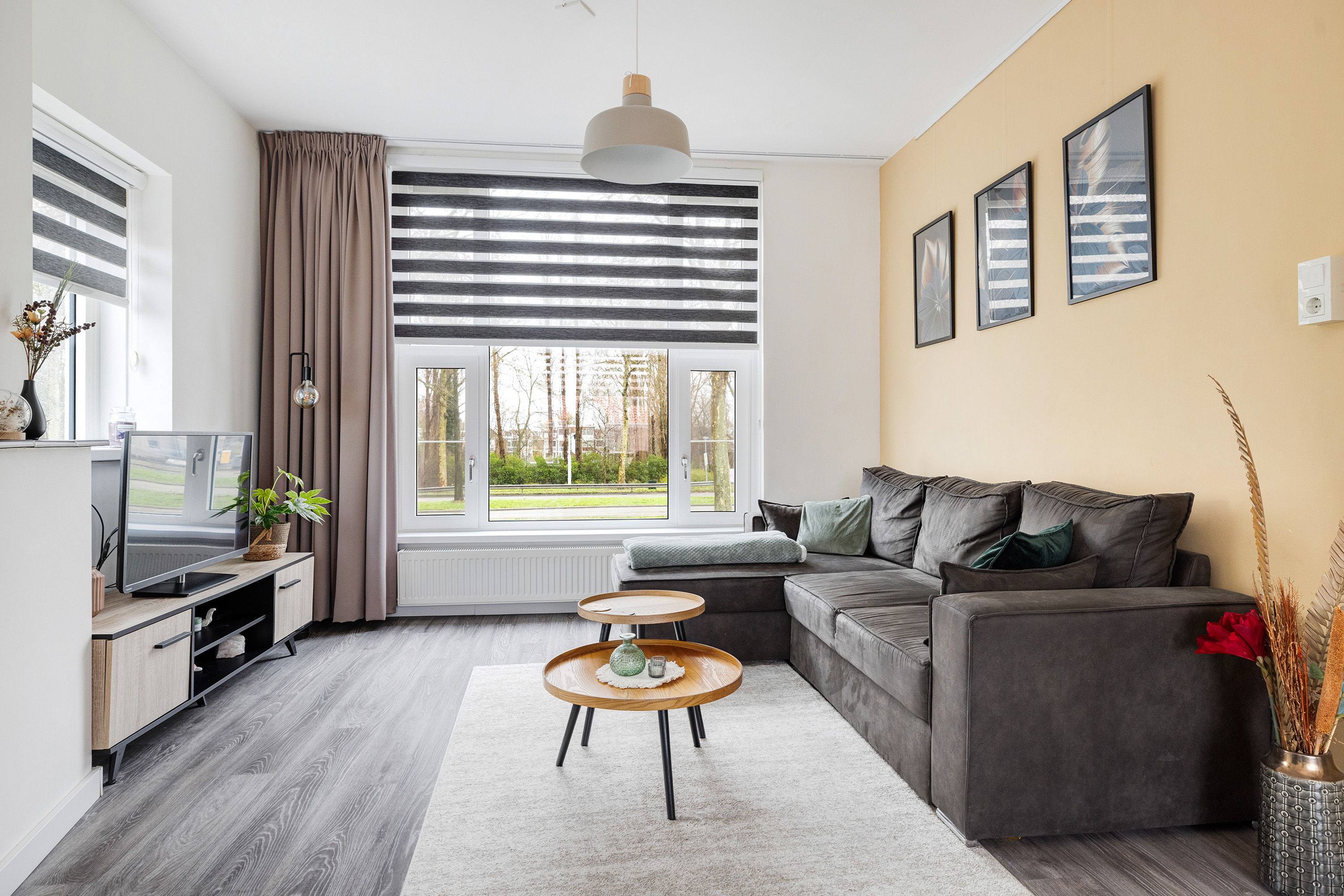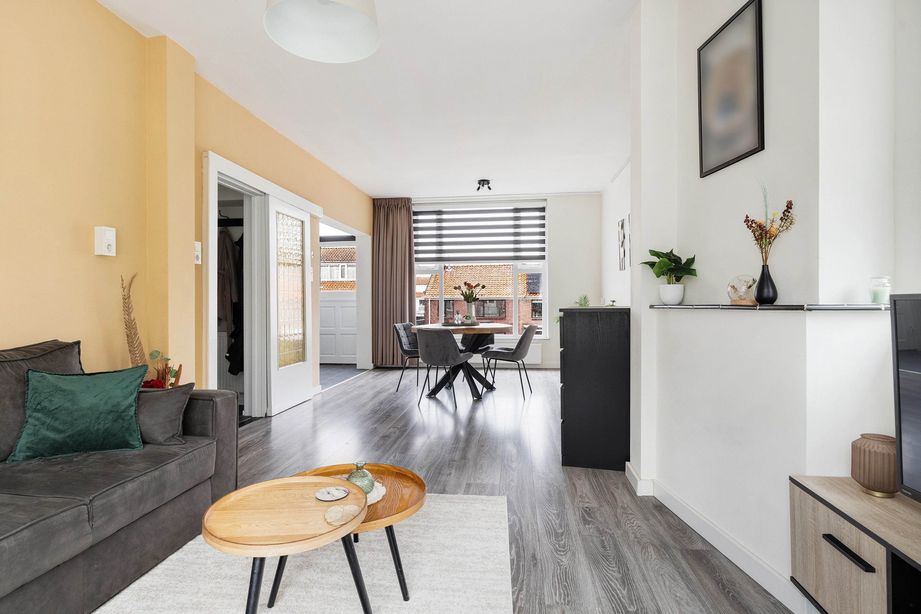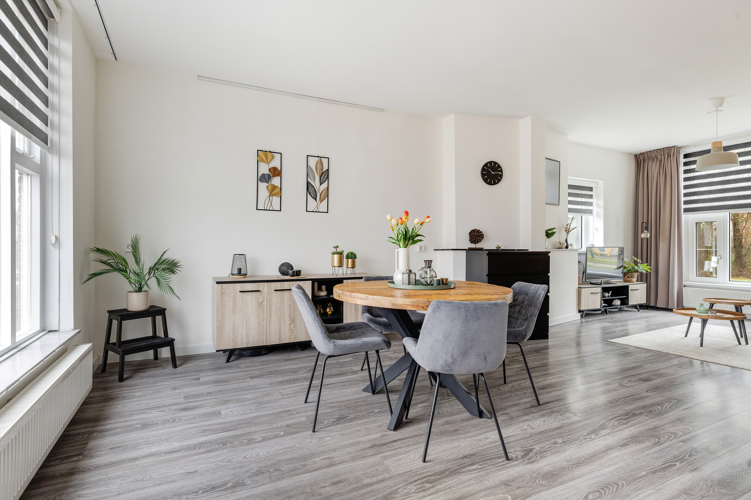 Vanuit de hal bereik je via een schuifdeur de woonkamer. De doorzon woonkamer is heerlijk licht dankzij de grote ramen aan zowel de voor- als achterzijde. De ruimte is netjes afgewerkt met een laminaatvloer en strak gestucte wanden en plafonds, wat zorgt voor een moderne en rustige basis voor ieder interieur.