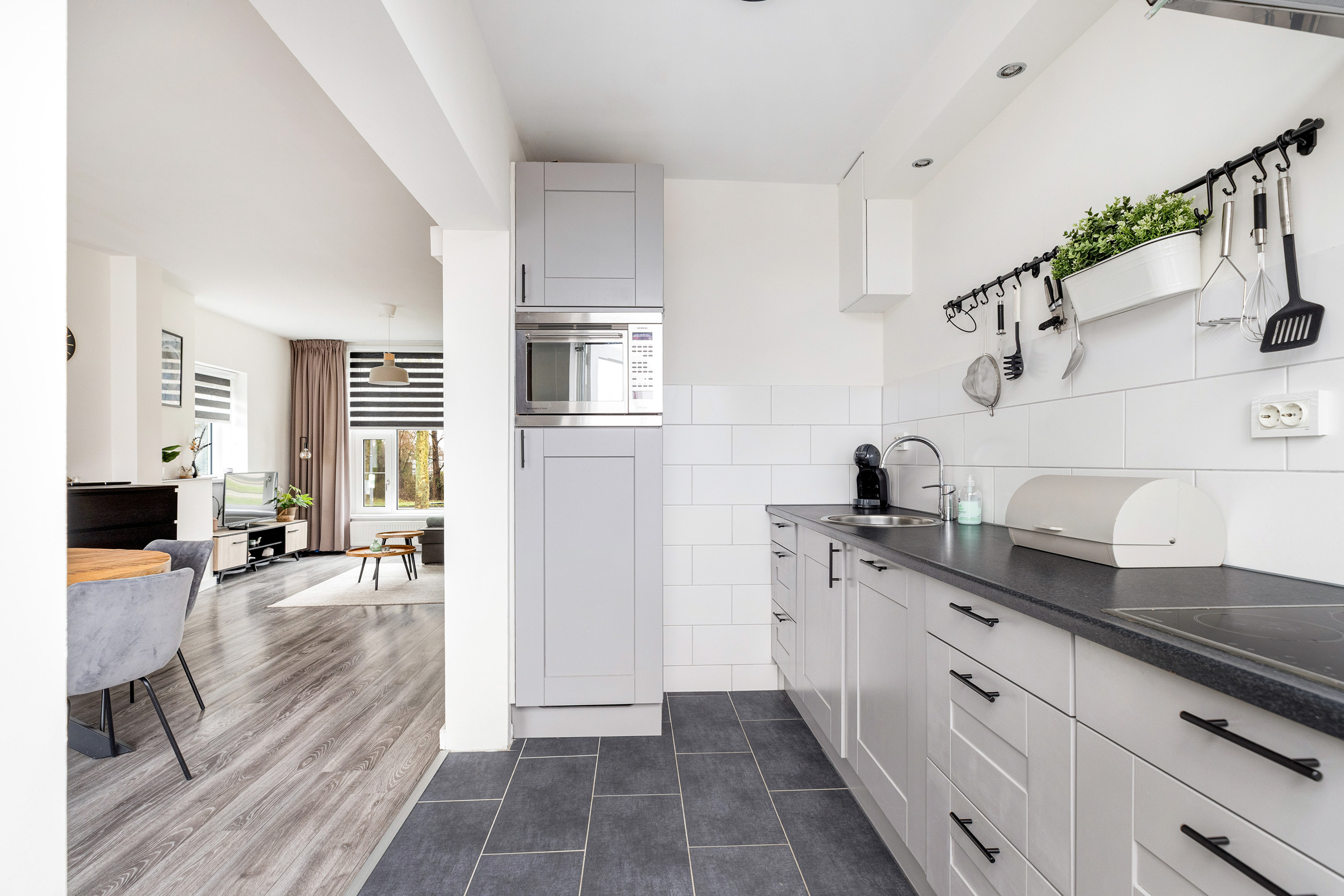 De open keuken bevindt zich aan de achterzijde en is uitgevoerd in een rechte opstelling met een extra vrijstaande kast waarin de koelkast en combi-oven zijn geplaatst. De keuken is voorzien van een vaatwasser, spoelbak en een 4-pits keramische kookplaat met afzuigkap. De grijze fronten in combinatie met het donkere werkblad geven de keuken een eigentijdse uitstraling.