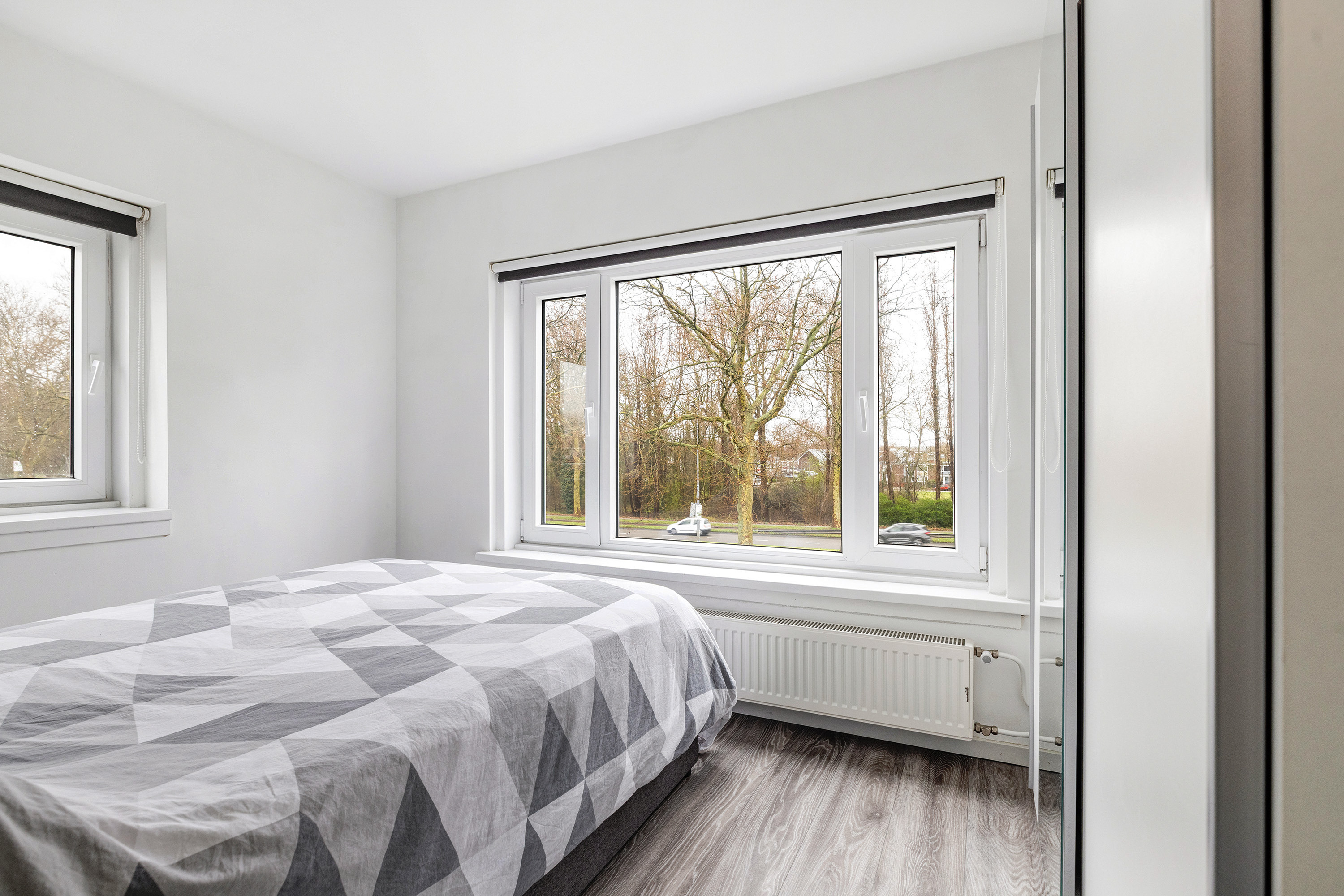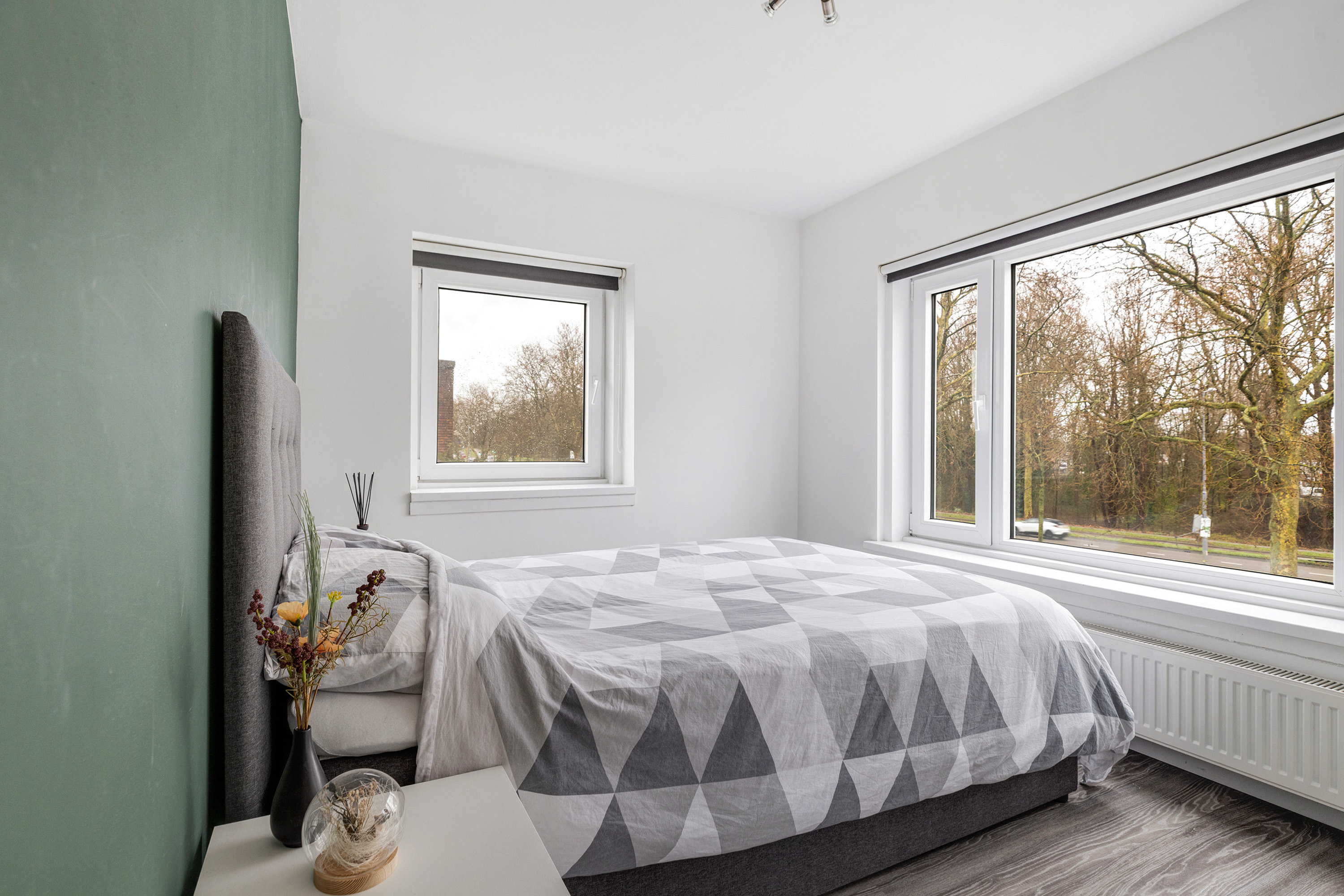 De tweede slaapkamer ligt aan de achterzijde en beschikt over grote ramen en een deur naar het ruime dakterras. Deze kamer is uitstekend te gebruiken als hoofdslaapkamer, maar kan ook perfect dienstdoen als kinder-, werk- of hobbykamer.
