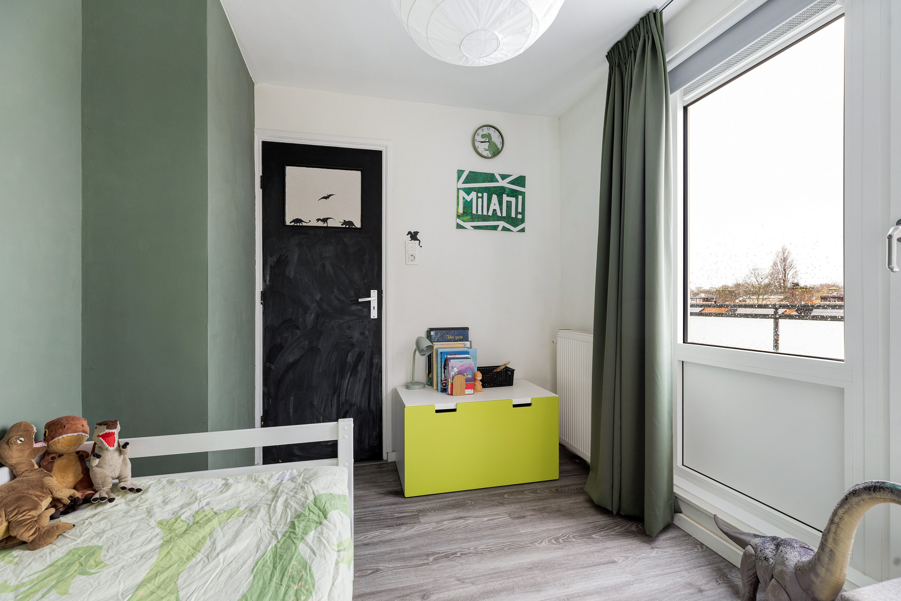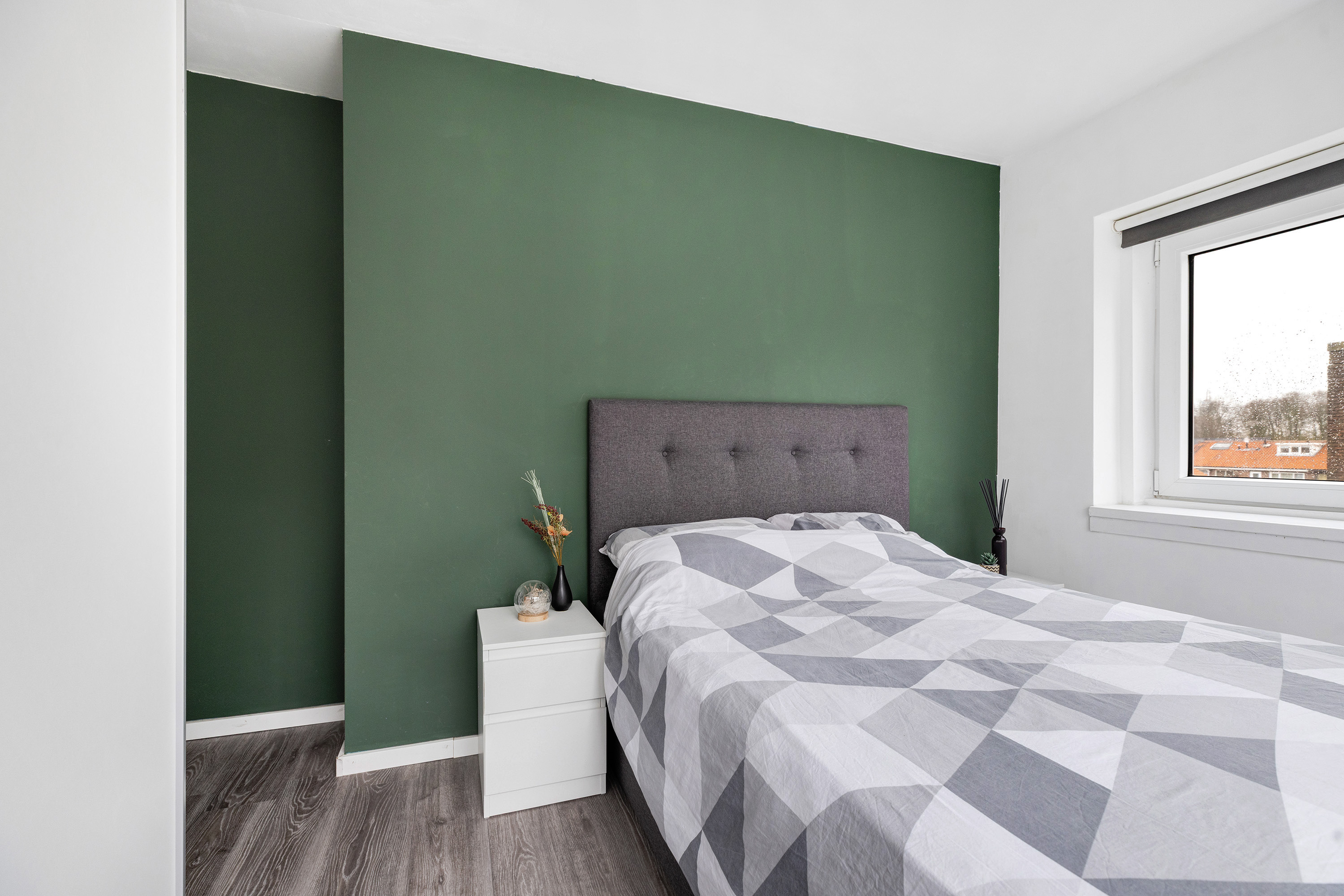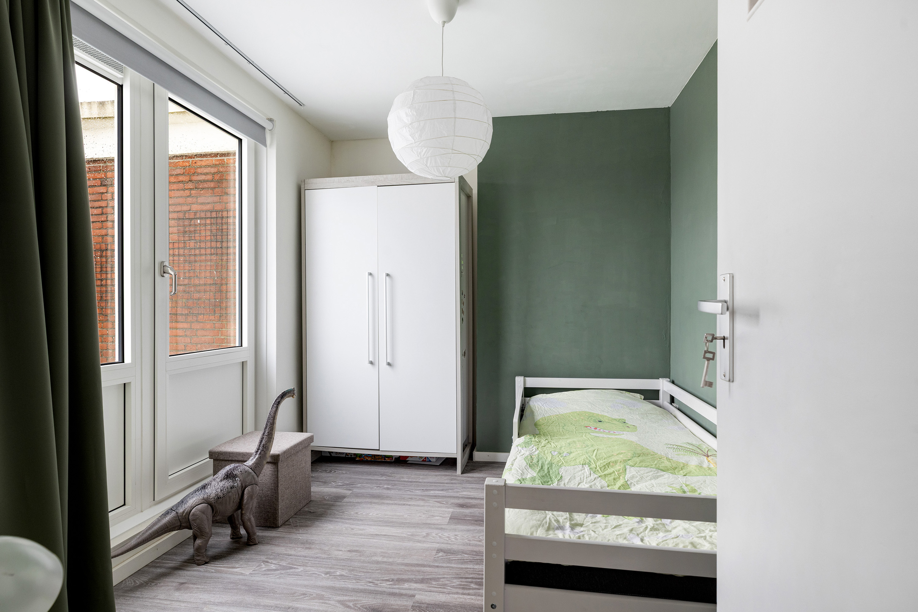 De eerste slaapkamer bevindt zich aan de voorzijde van de woning en profiteert van ramen aan zowel de voor- als zijkant, wat zorgt voor veel daglicht. Ook hier zijn laminaatvloeren en glad gestucte wanden en plafonds toegepast.