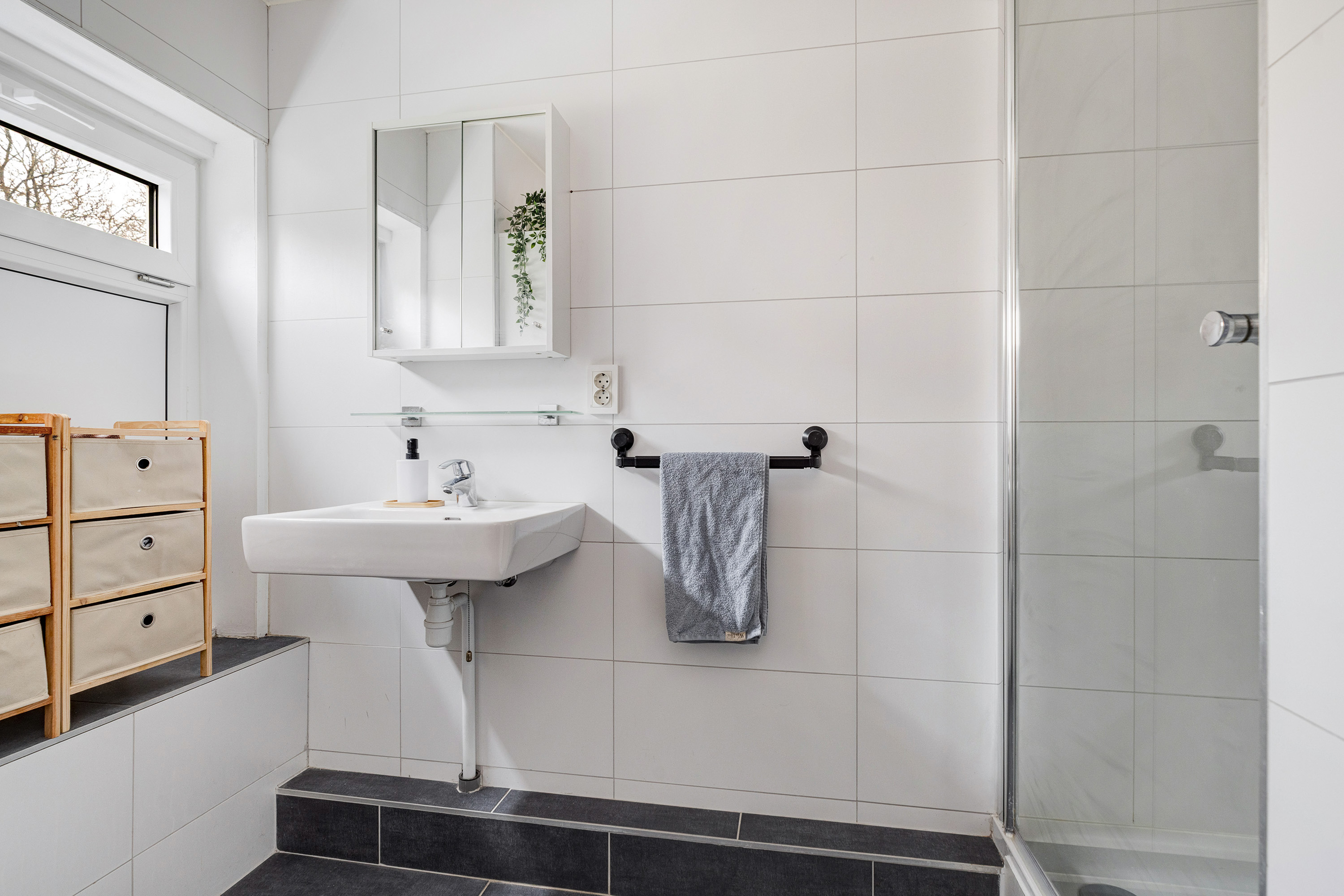 De badkamer is ruim opgezet en volledig betegeld met een witte wandtegel en een grijze vloertegel. De ruimte is uitgerust met een douchecabine, een wastafel met spiegelkast en een tweede hangend toilet.