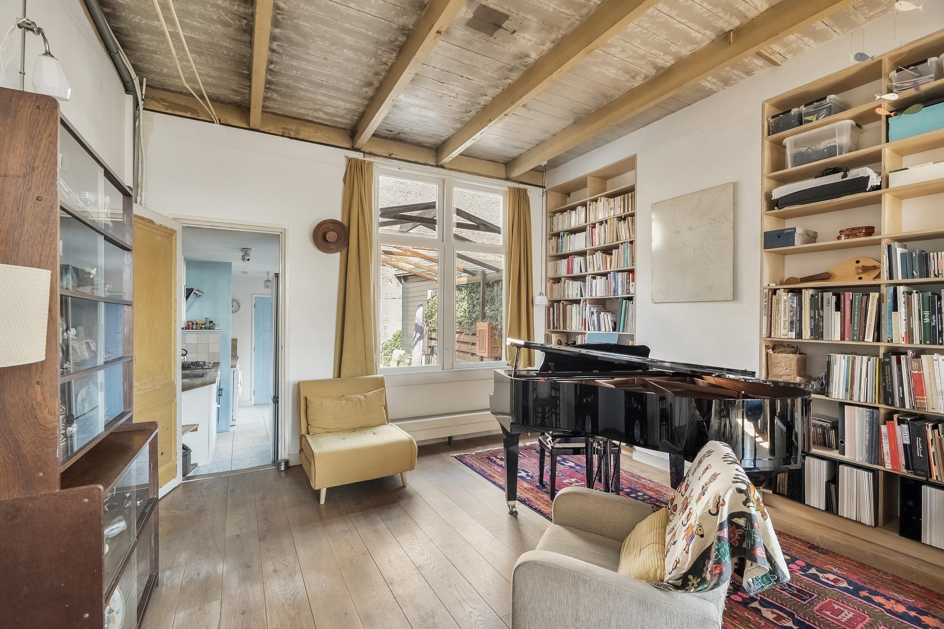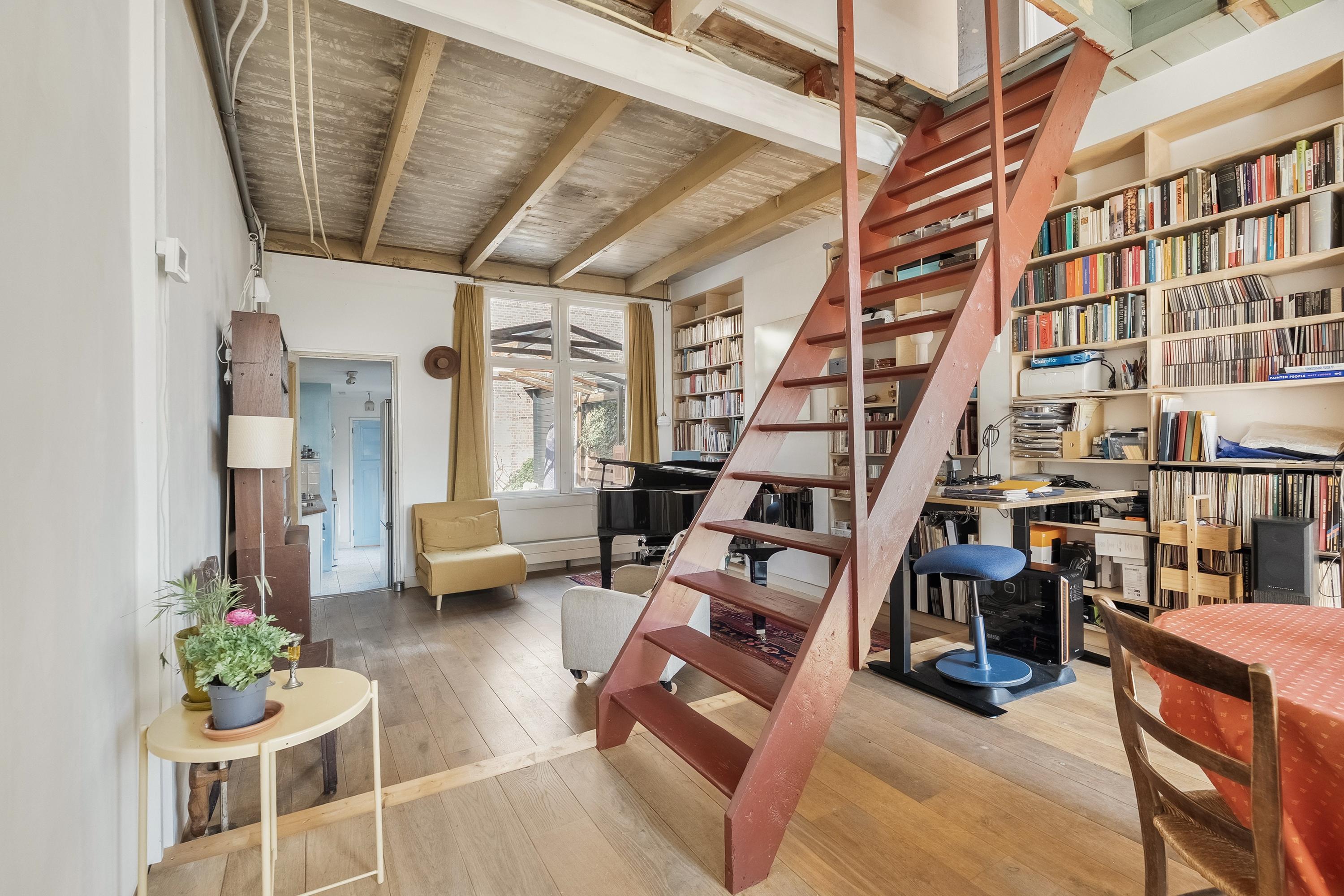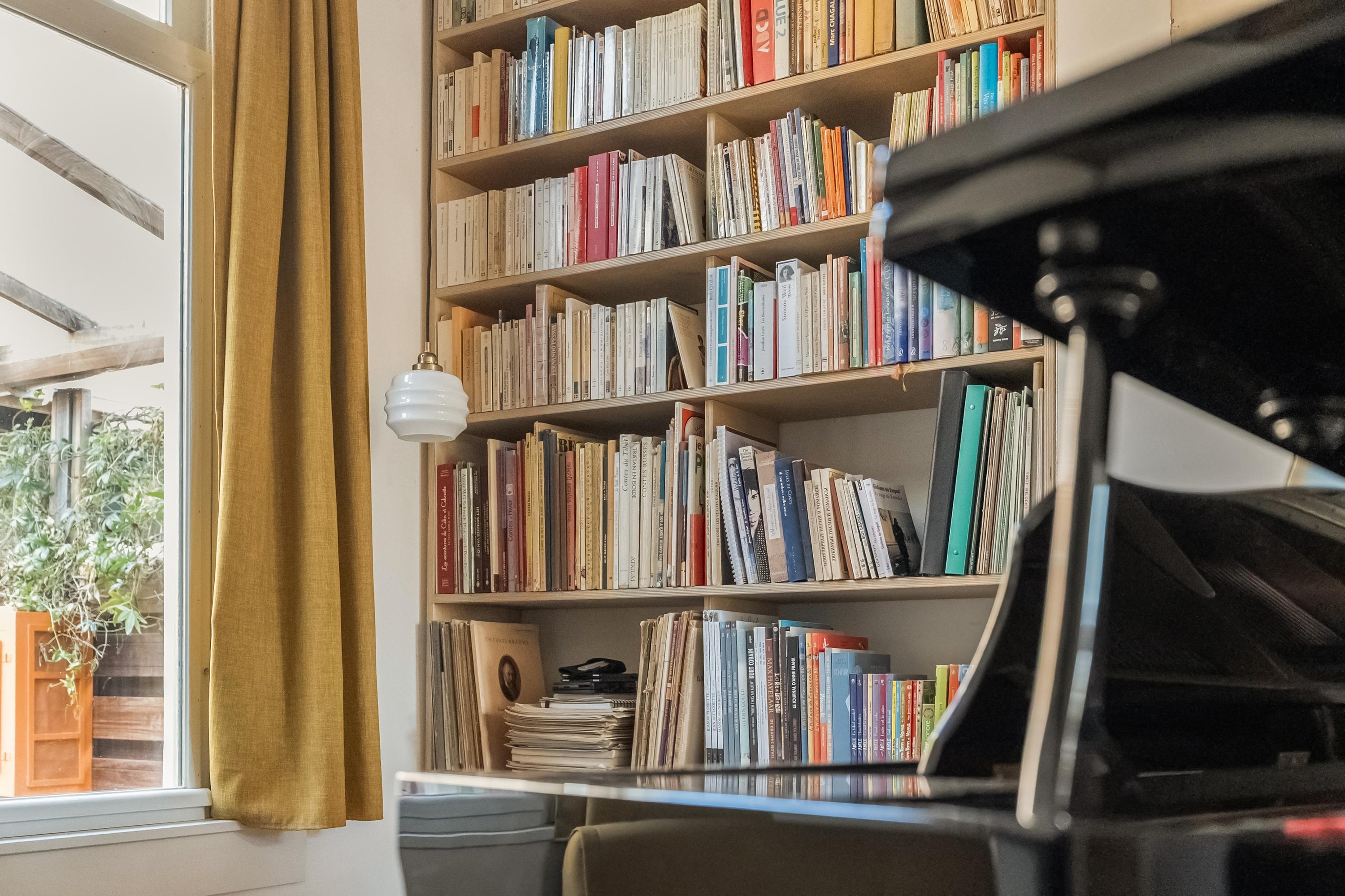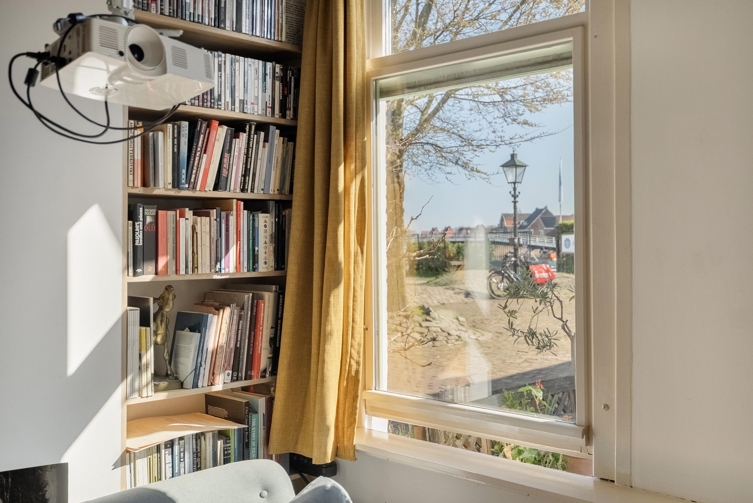 De op maat ingebouwde boekenkast is van berkenmultiplex en over de hele wand geplaatst. De schouw aan de tuinkant is opgeheven en de schouw aan de straatkant is behouden. Een detail dat meteen vertelt dat hier met oog voor detail is verbouwd.