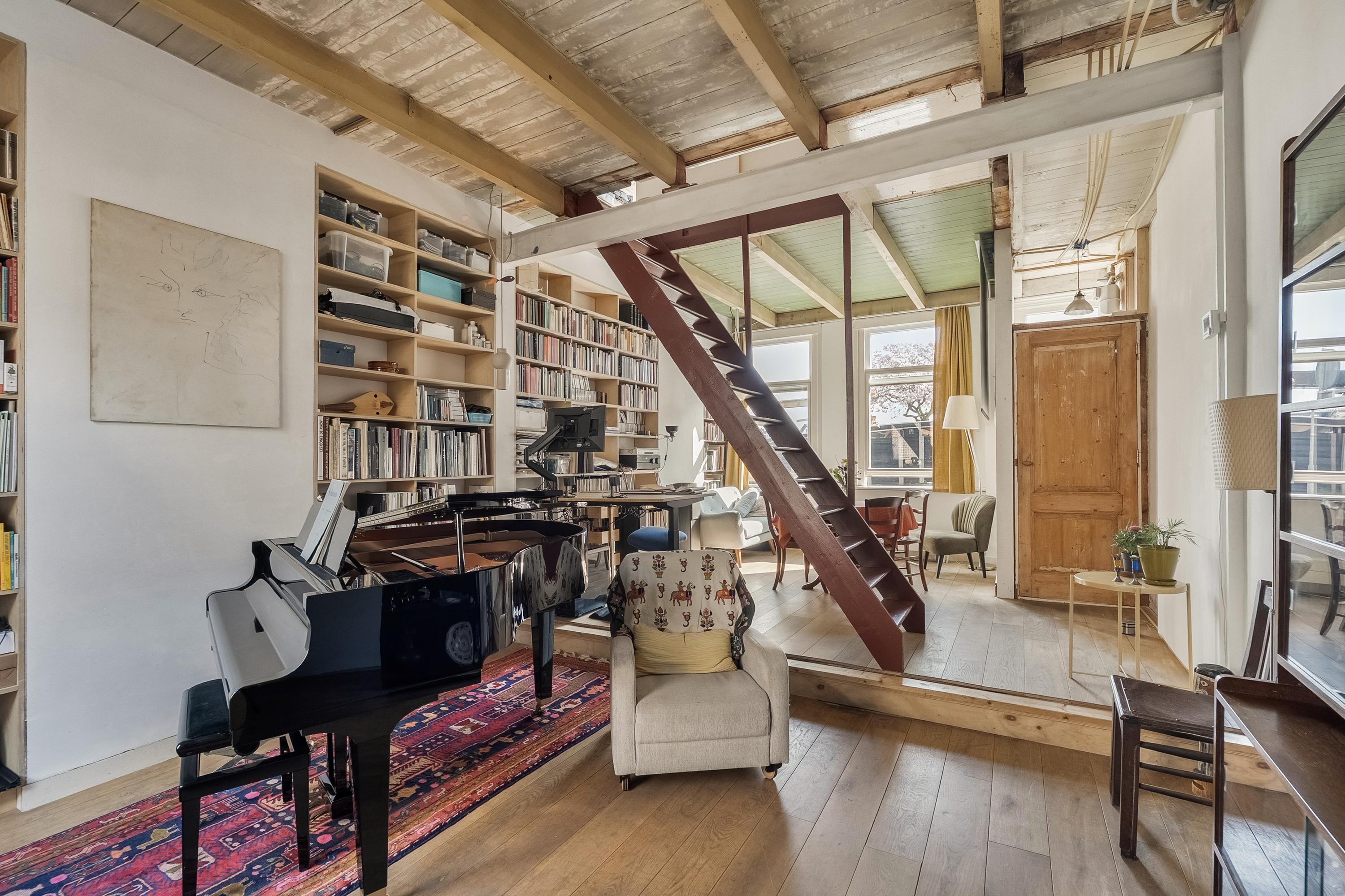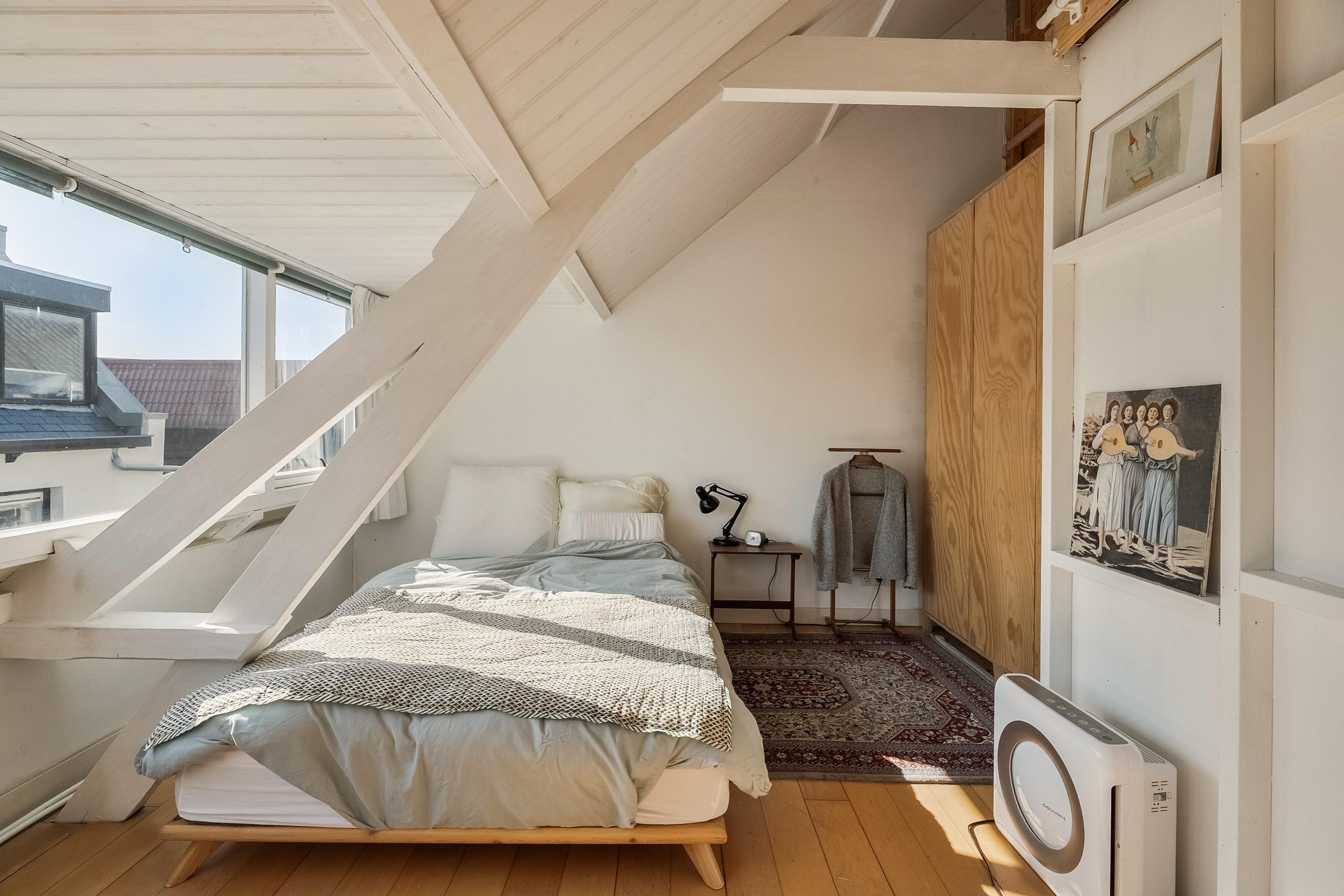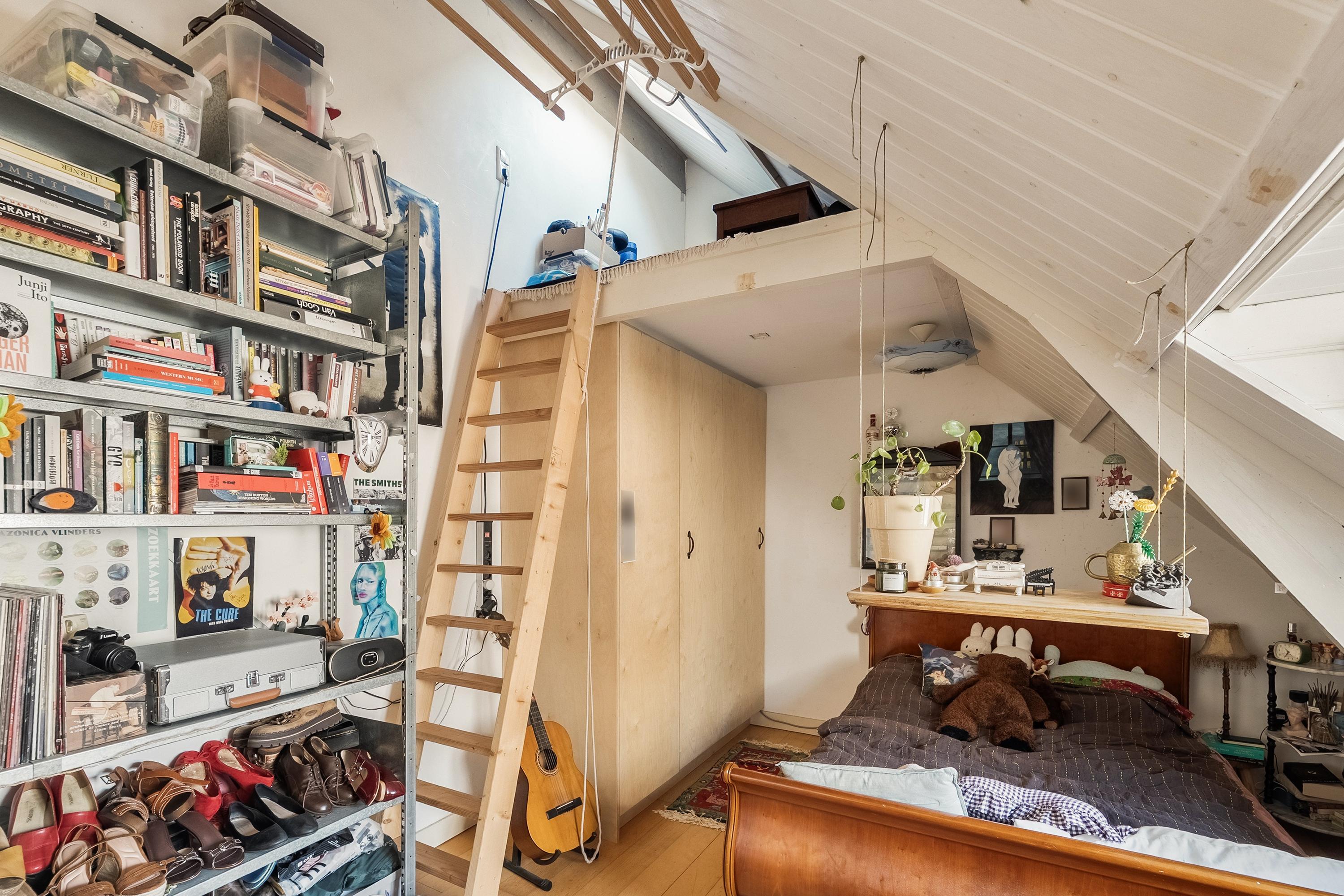 Via de vaste trap lopen we naar de eerste verdieping, waar we twee slaapkamers treffen. Hier zit het echte karakter van de woning: de originele balken nog in het zicht, en in beide kamers is een speelse vide gecreëerd. De twee voormalige dakkapellen zijn vervangen door een grote dakkapel met zonwerend glas, wat niet alleen extra ruimte heeft opgeleverd maar ook een bijzonder uitzicht: over de Rotte en een stukje verder over het bruggetje over het water.