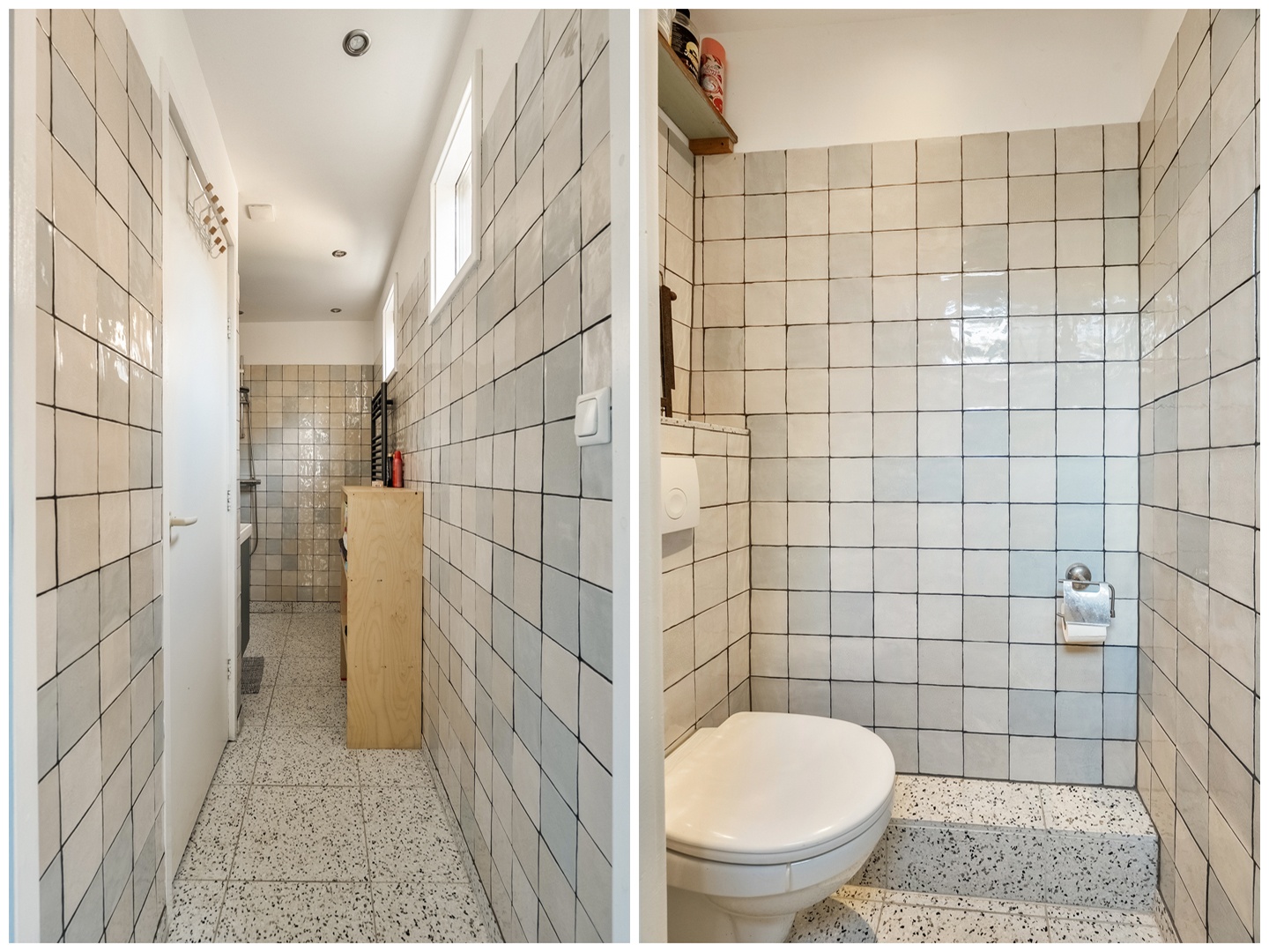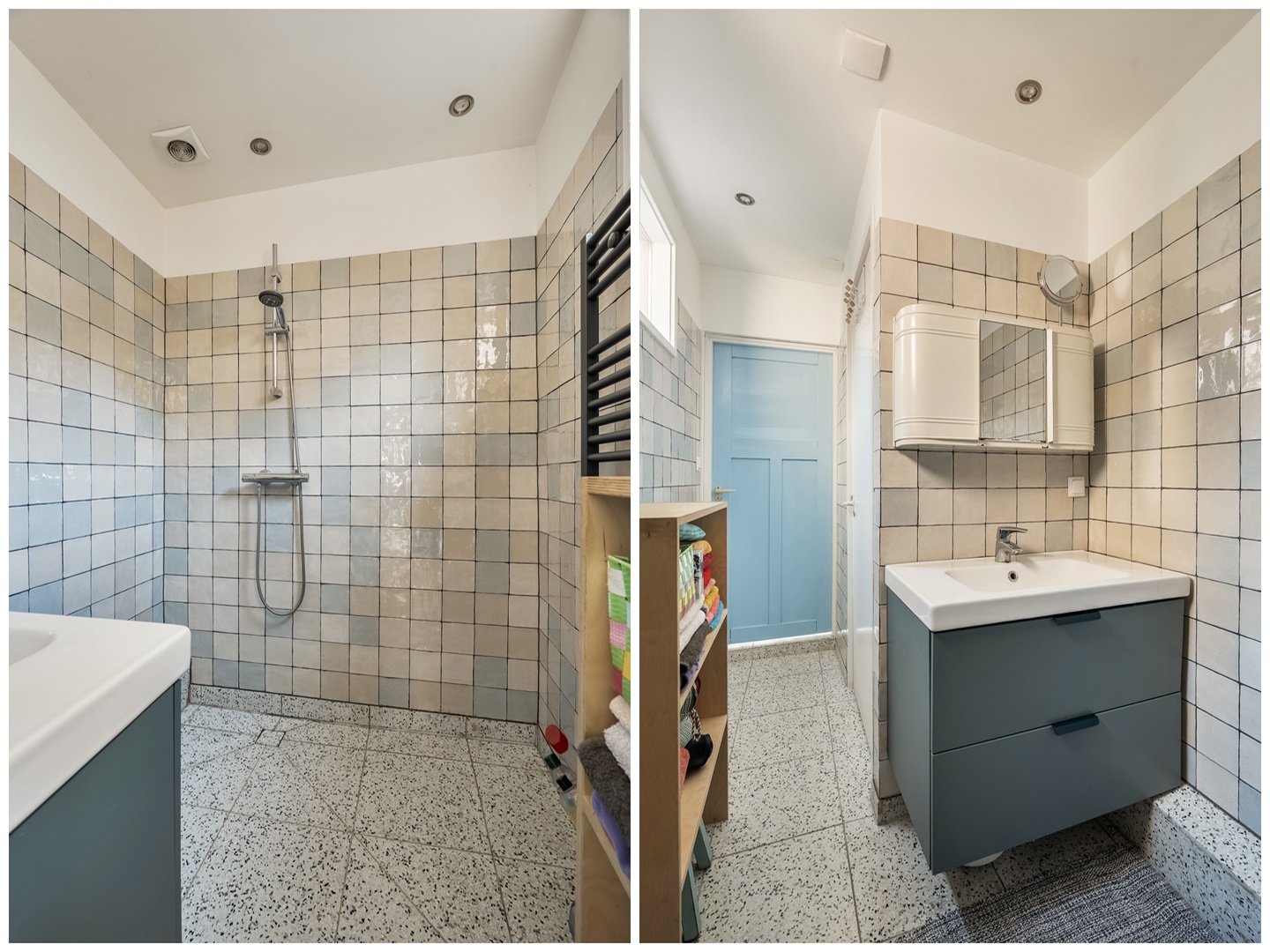 Achter de keuken bevindt zich de badkamer, volledig betegeld en voorzien van een inloopdouche en een wastafelmeubel in een frisse kleurstelling. De ventilatie loopt automatisch door nadat het licht is uitgedaan — een slim detail dat vocht effectief afvoert. In de badkamer treffen we ook het apart afgesloten toilet. Tussen de keuken en de badkamer treffen we een mooie hoek met de aansluitingen voor wasmachine en droger. Hier is ook de CV-ketel opgesteld.