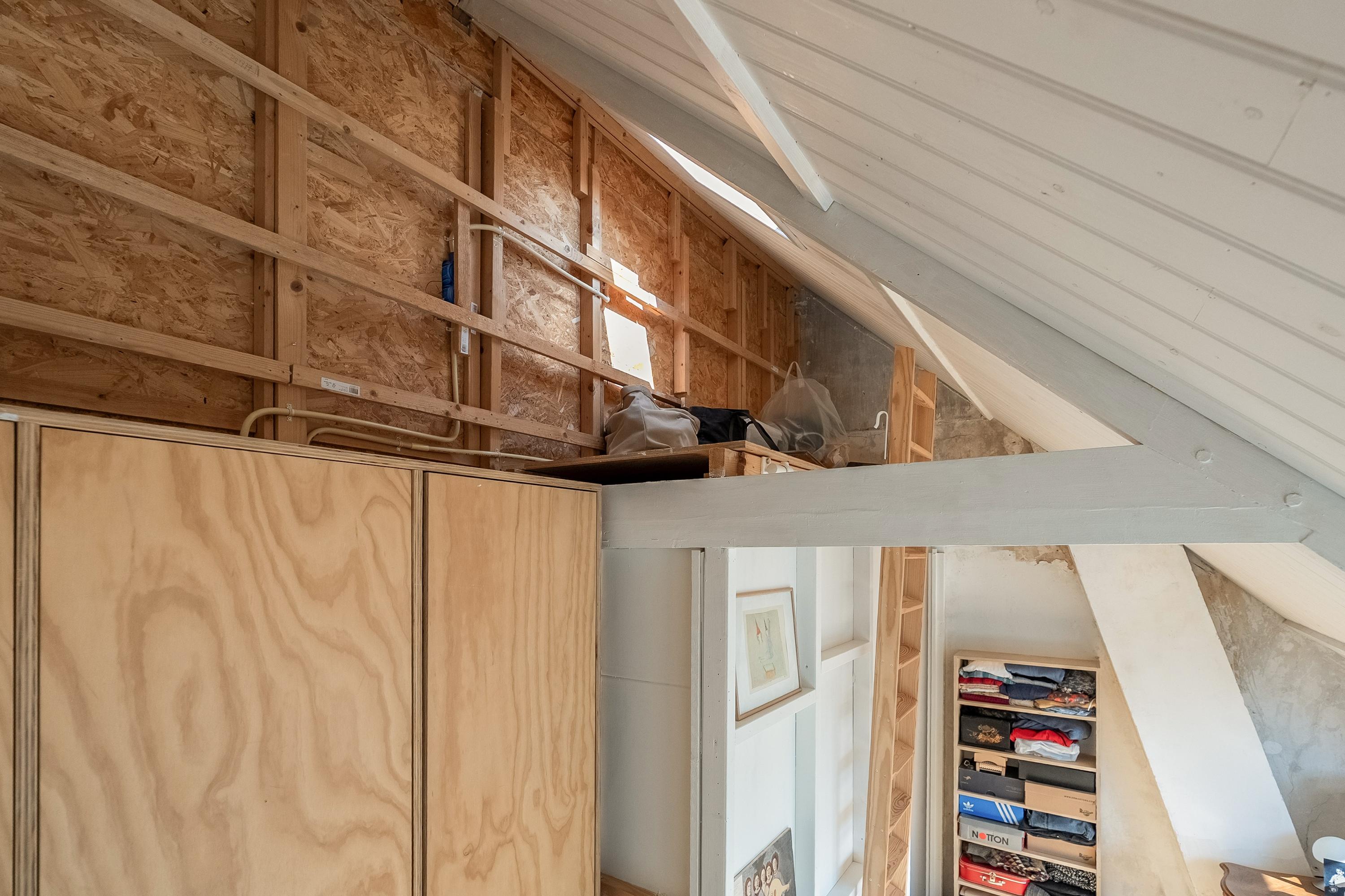 De slaapkamer aan de tuinkant is voor wie houdt van schaduw en koelte; de slaapkamer aan de straatkant vangt het ochtend- en avondlicht. In de slaapkamer aan de tuinkant is een inbouwkast van berkenmultiplex gemaakt met daarin een ingebouwde wastafel — een eigen kleine badhoek, discreet weggewerkt maar bijzonder praktisch.