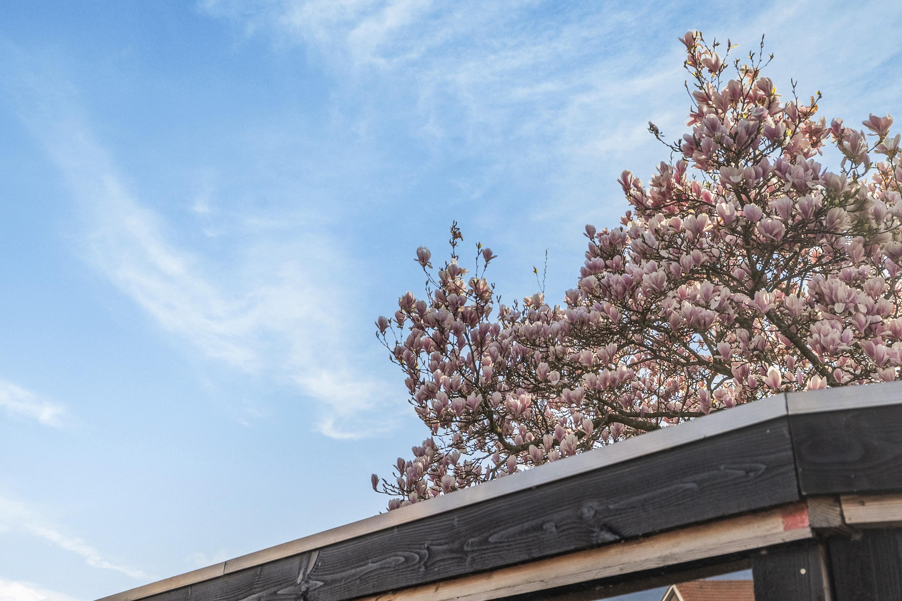We lopen door naar de keuken. De keuken is voorzien van een houten blad, een 3-pits gasfornuis, afzuigkap, oven, spoelbak en losse vaatwasser — compact maar goed ingedeeld. Vanuit de keuken stap je het terras op van Meranti-hout met glazen overkapping, voorzien van een houten schutting en opgaand groen. Beschut, maar niet afgesloten. Van hier loop je de tuin in, die helemaal opnieuw is aangelegd met basaltstenen randen en kleine tegels. Op een zomerse avond is dit dé plek.