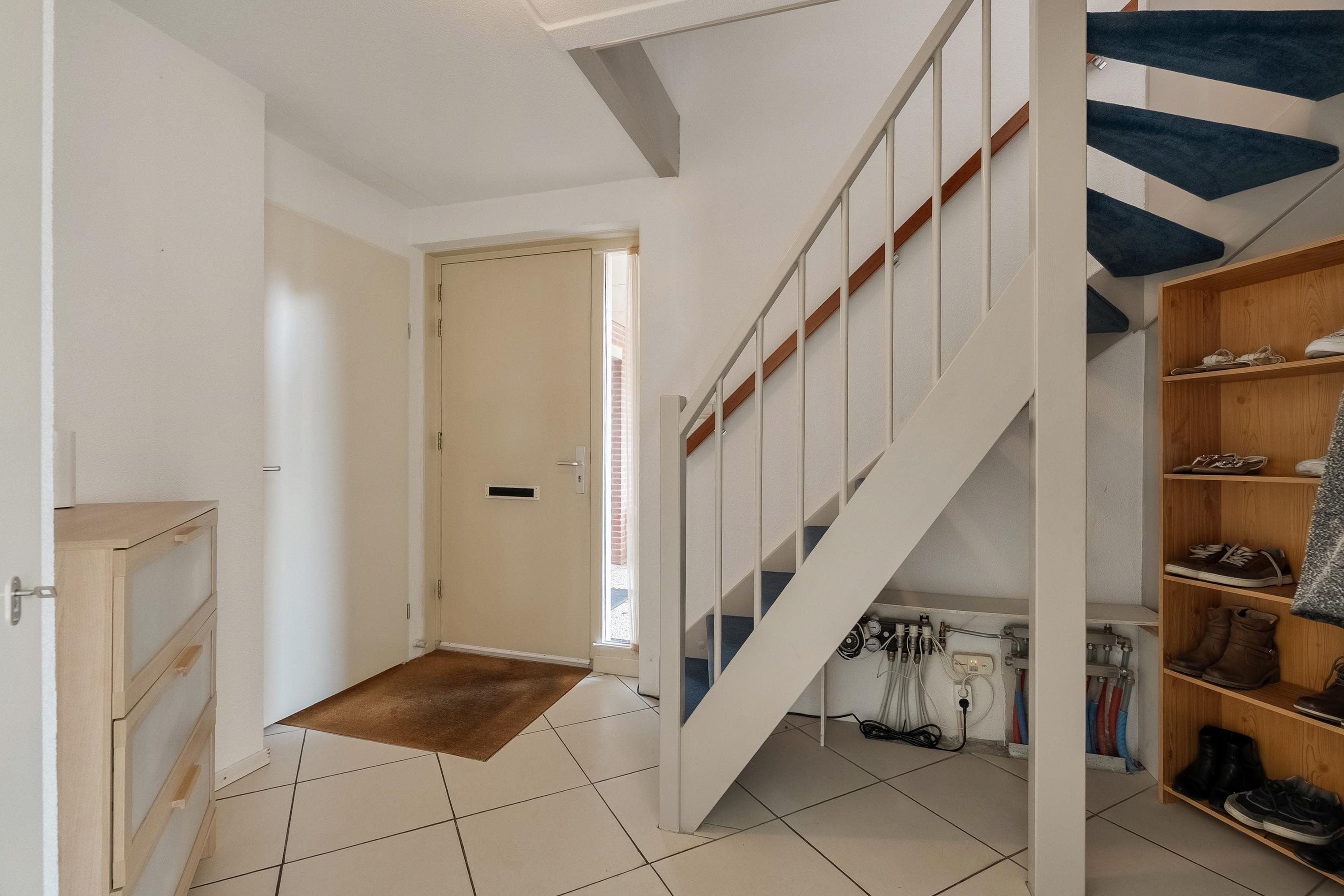 Ruime overloop met trap naar de 2e verdieping, toegang tot alle vertrekken, toiletruimte voorzien van een duoblok. De toiletruimte is geheel betegeld in een lichte kleurstelling.
