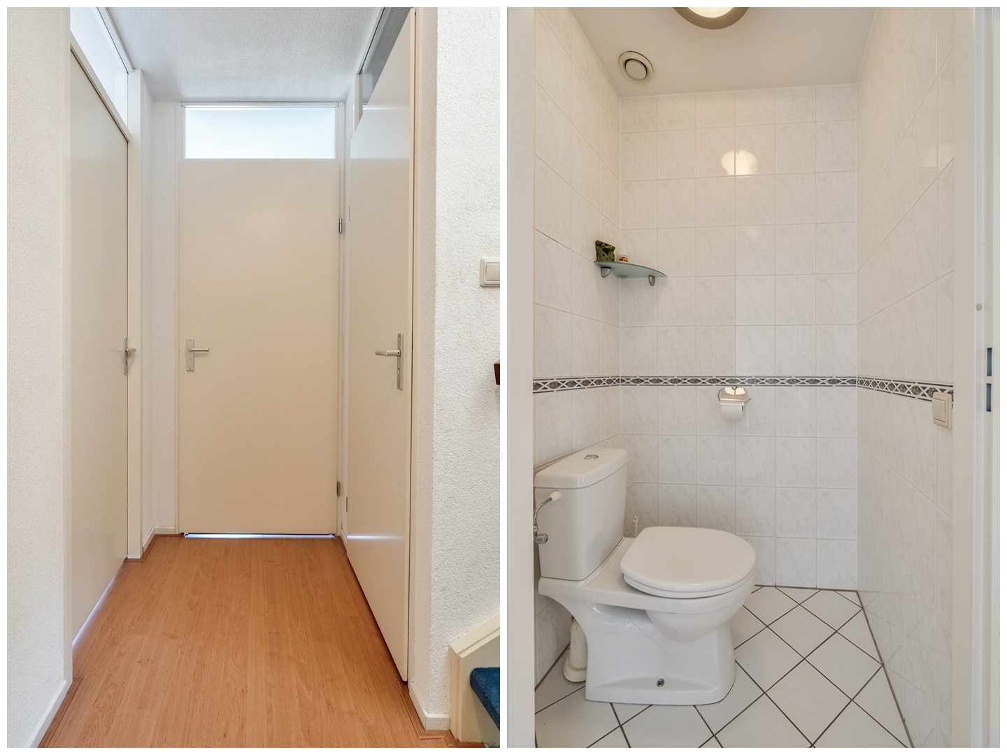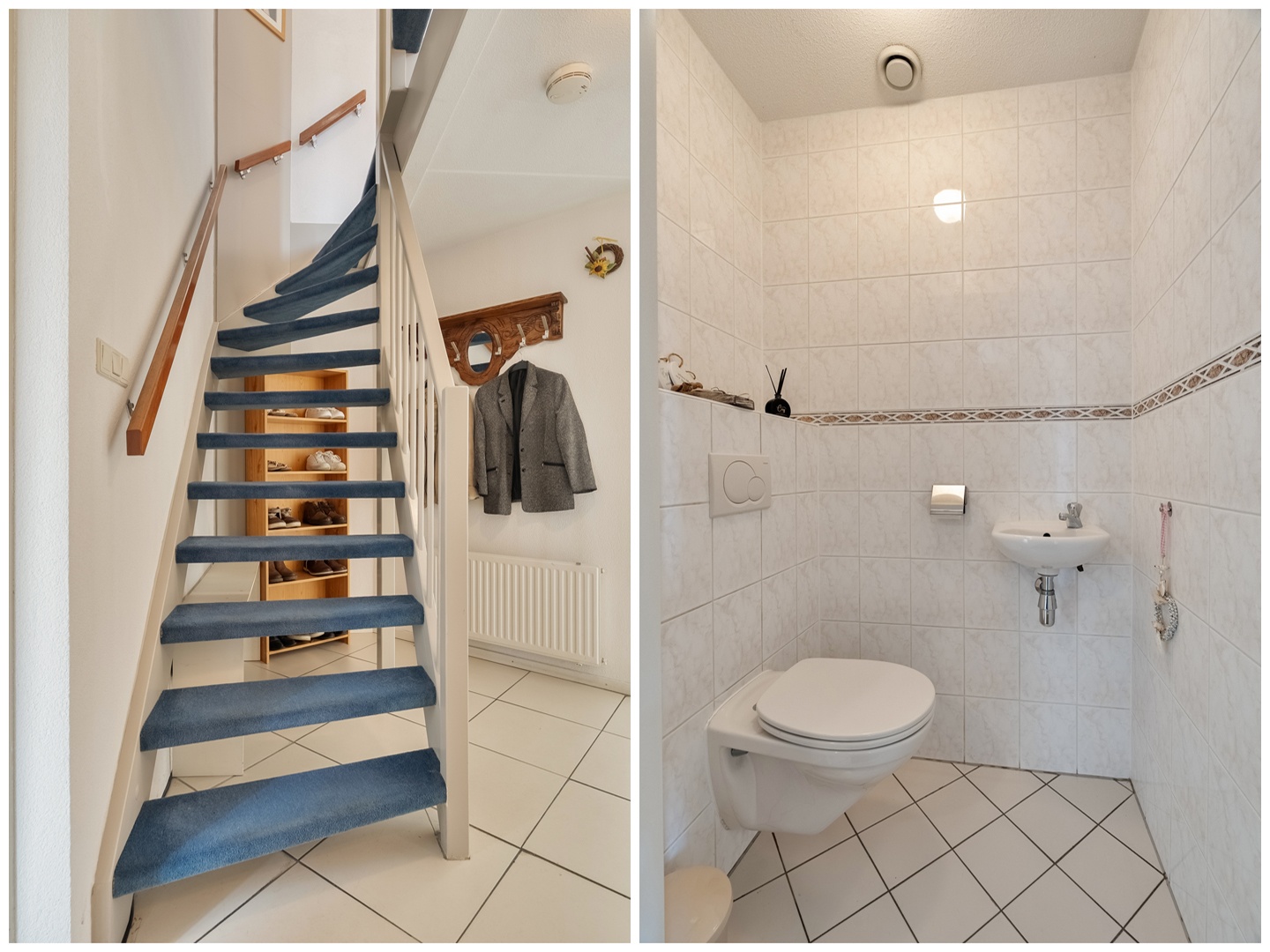Overdekte entree met verlichting, ruime hal met meterkast, trap naar de 1e verdieping, toiletruimte voorzien van een hangcloset en een fonteintje. De toiletruimte is geheel betegeld in een lichte kleurstelling.