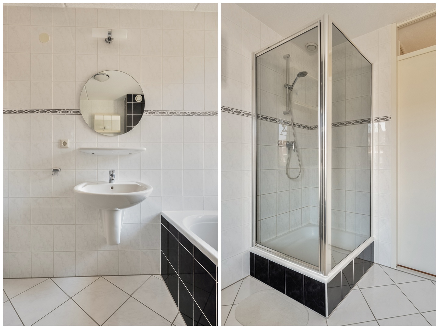 De badkamer (ca. 7 m2) beschikt over sanitaire voorzieningen zoals een wastafel, spiegel, verlichting, ligbad en een douchecabine. De badkamer is geheel betegeld en afgewerkt met vloerverwarming.