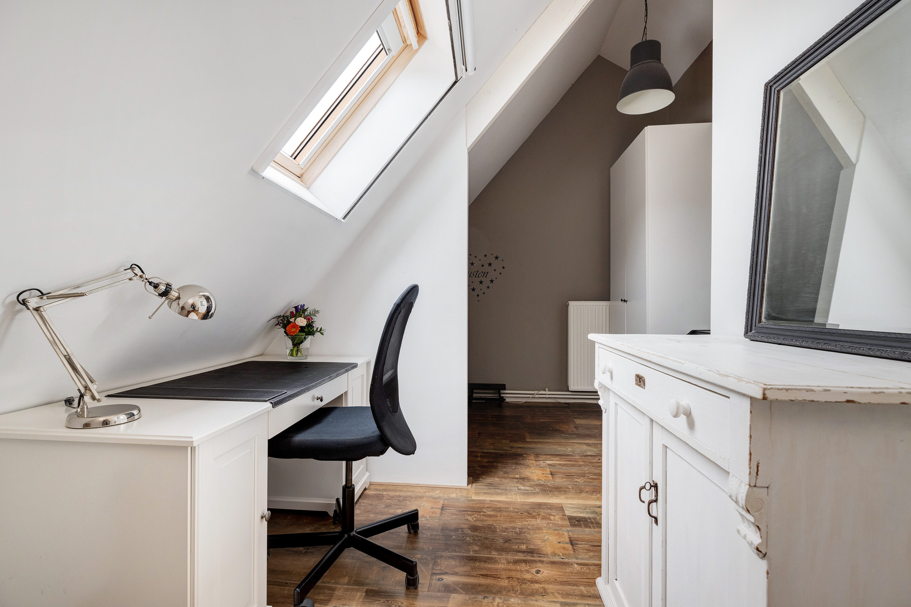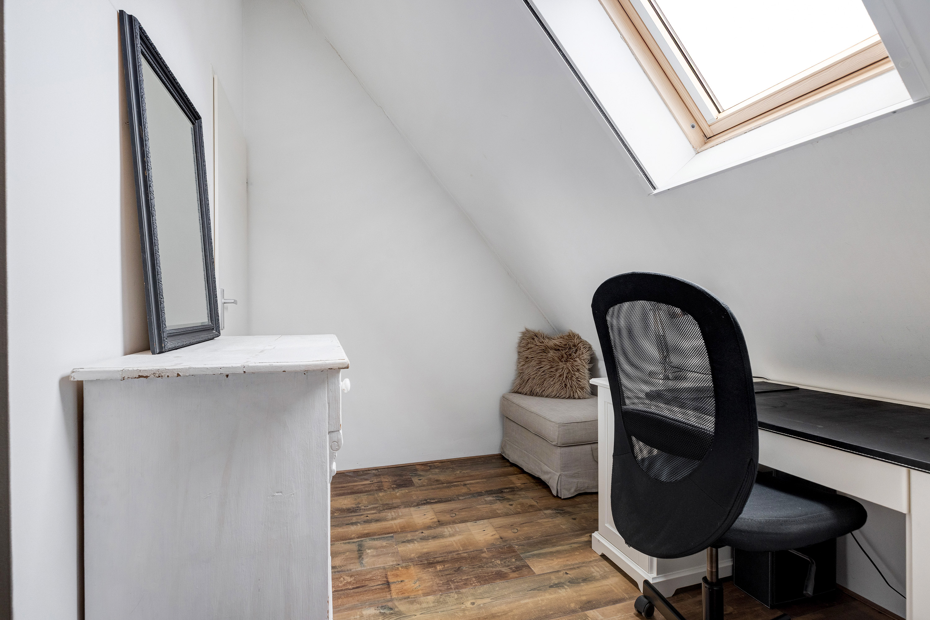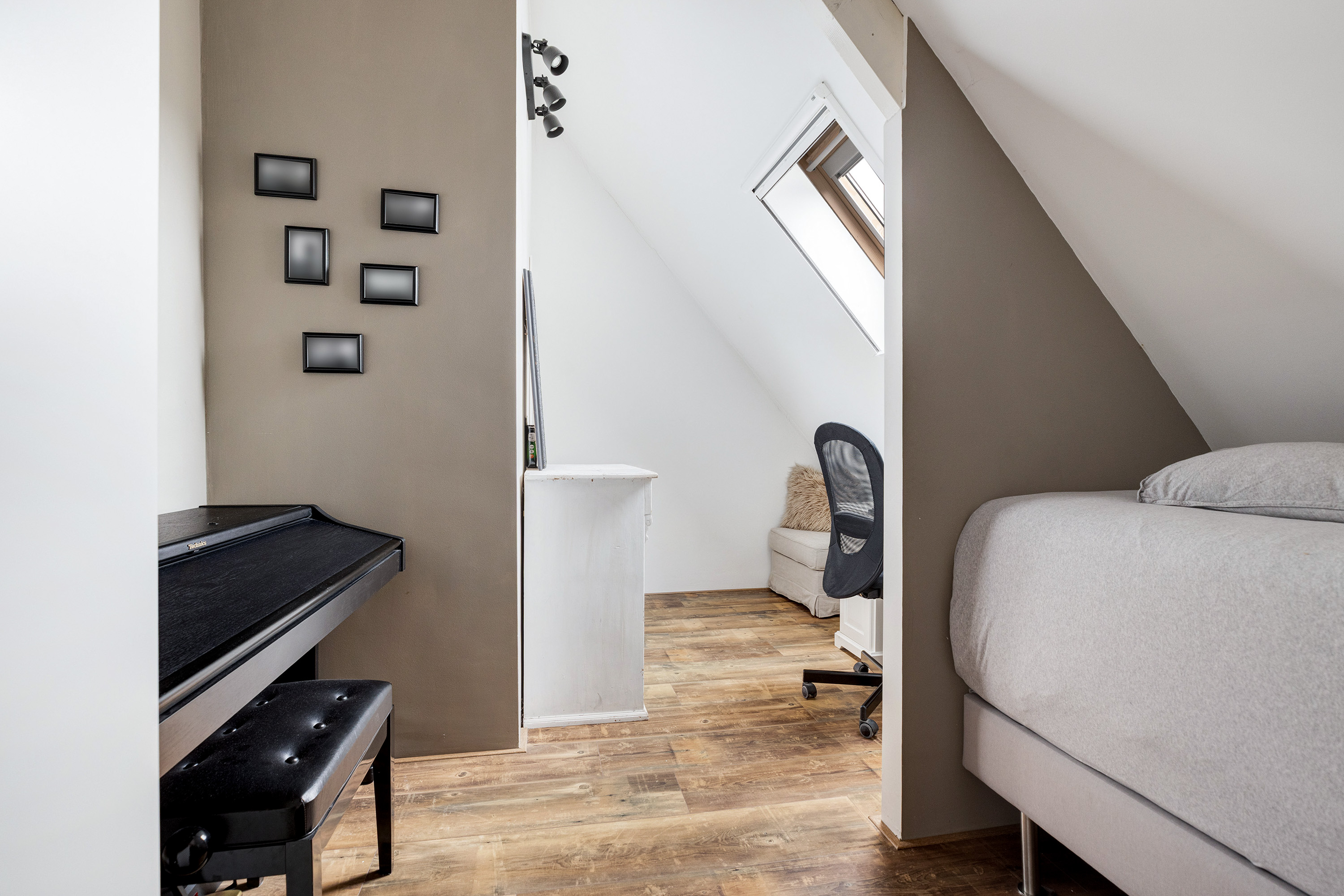 Aan de achterzijde is de vierde slaapkamer gerealiseerd, voorzien van een Velux dakraam met verduisterend gordijn en hor. Dankzij de hoge nok en de praktische indeling is dit een volwaardige slaapkamer met veel bergruimte. Indien gewenst is het mogelijk om op deze verdieping twee slaapkamers te realiseren.