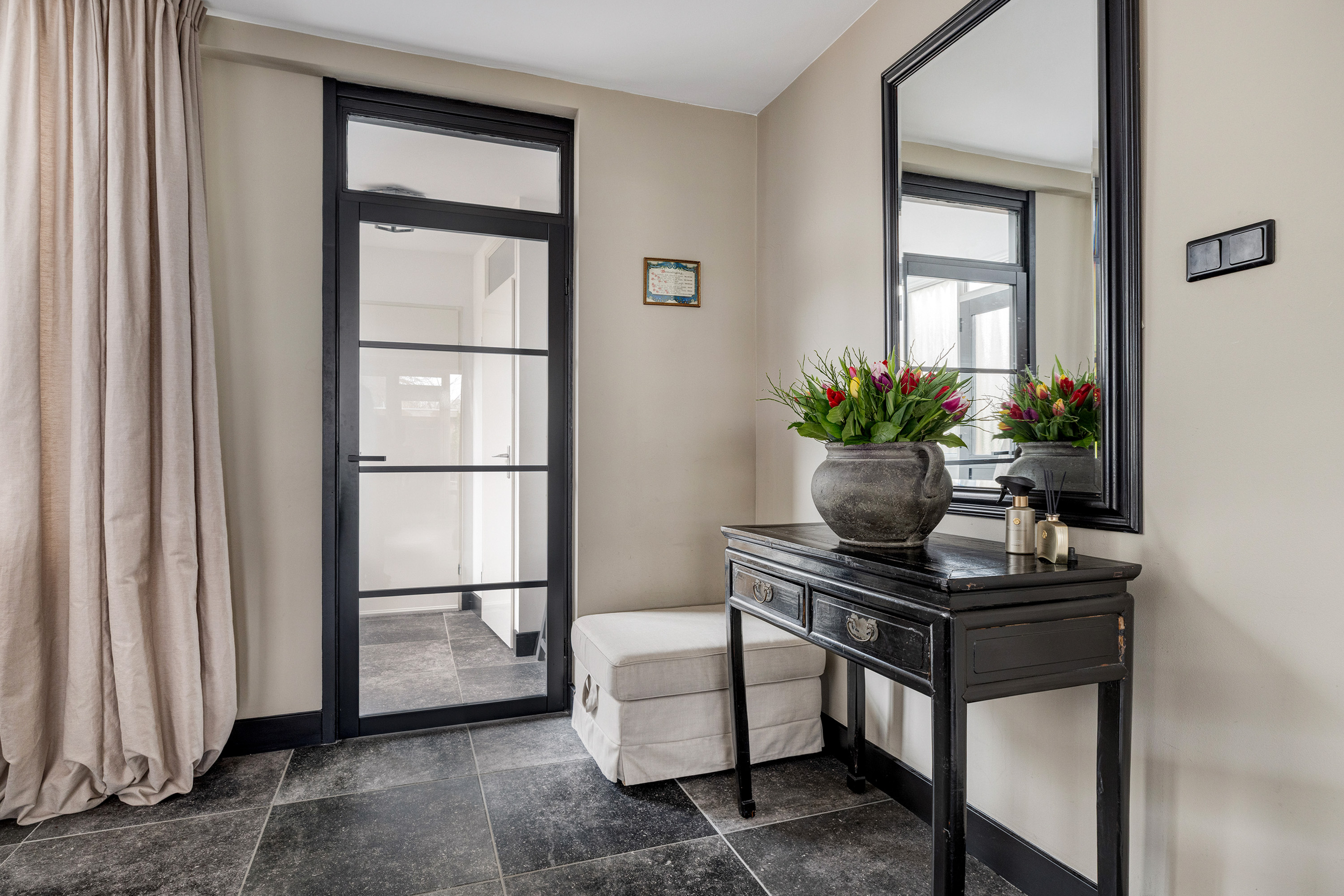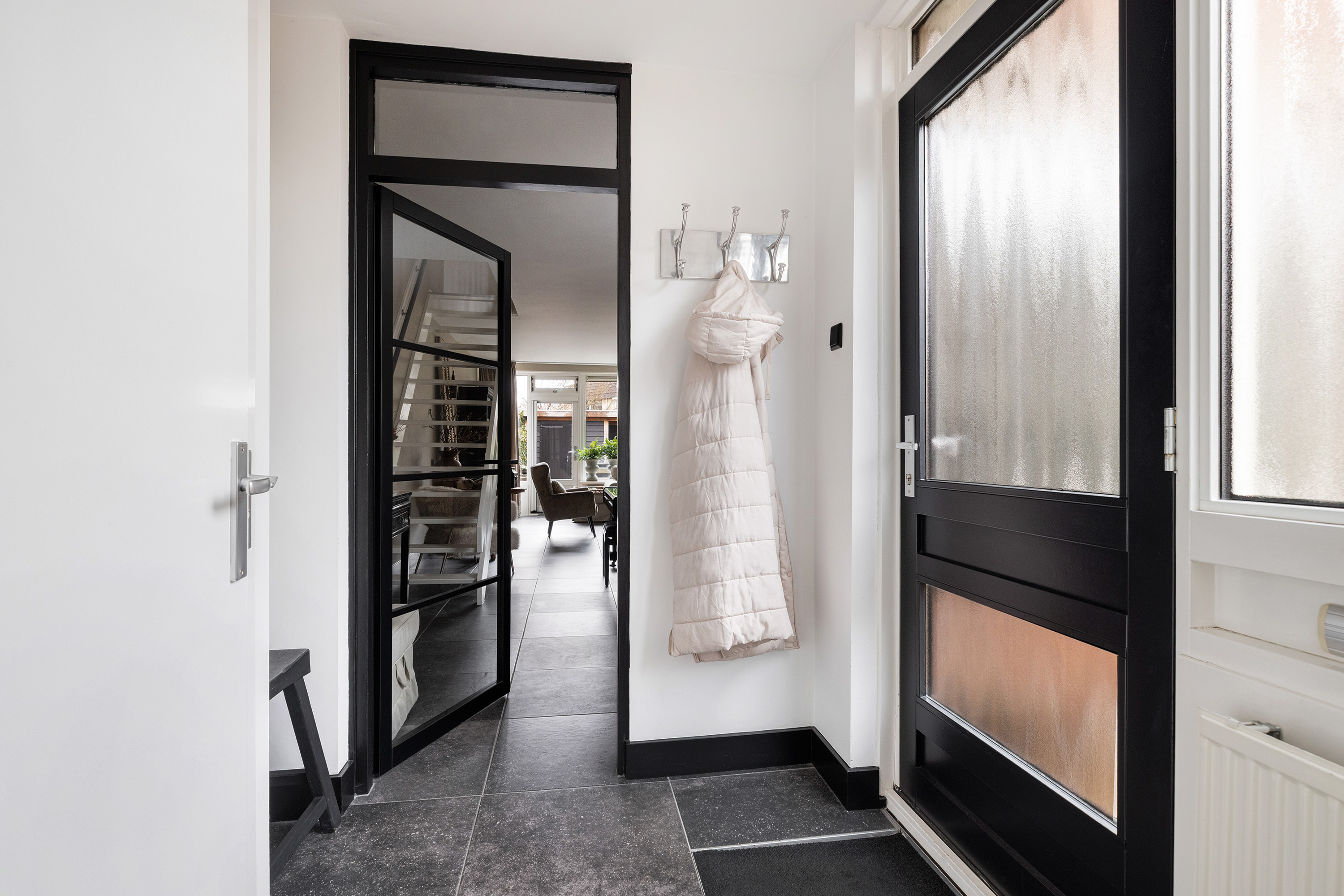 Via een stoere zwarte glazen paneeldeur betreed je de woonkamer, wat direct zorgt voor een stijlvolle en moderne uitstraling.