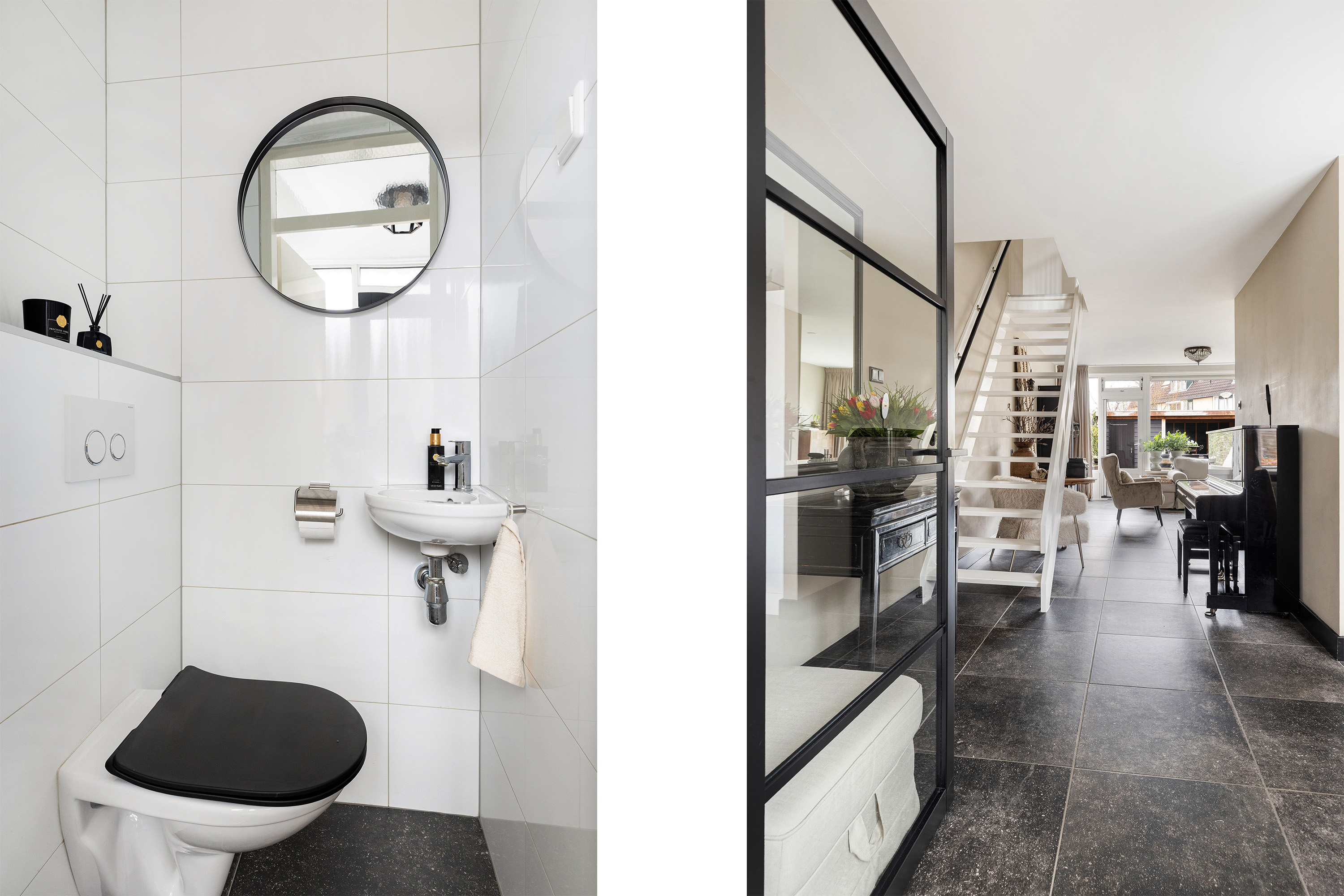 De toiletruimte is volledig betegeld in wit/grijs en voorzien van een hangend toilet en fonteintje. Vanuit de hal bereik je tevens de praktische berging met opstelling voor wasmachine en droger, de omvormer van de zonnepanelen en een vliering voor extra bergruimte. Deze berging is ook bereikbaar vanuit de voortuin, ideaal voor fietsen of extra opslag.