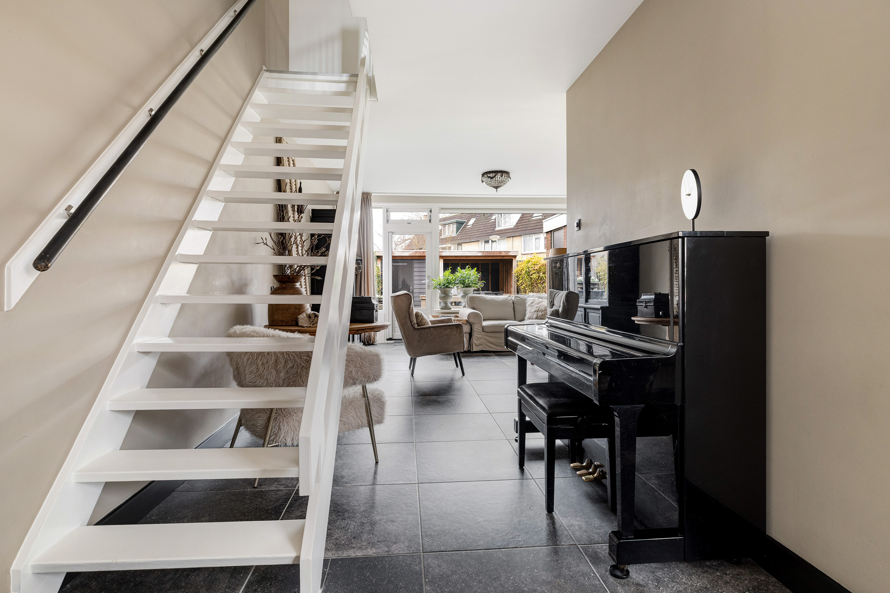 De tuingerichte woonkamer aan de achterzijde is heerlijk licht en biedt via een deur met schuifhor toegang tot de zonnige achtertuin. De begane grond is afgewerkt met glad gestucte wanden en plafonds en grijze plavuizen met comfortabele vloerverwarming. De open trap leidt naar de eerste verdieping.