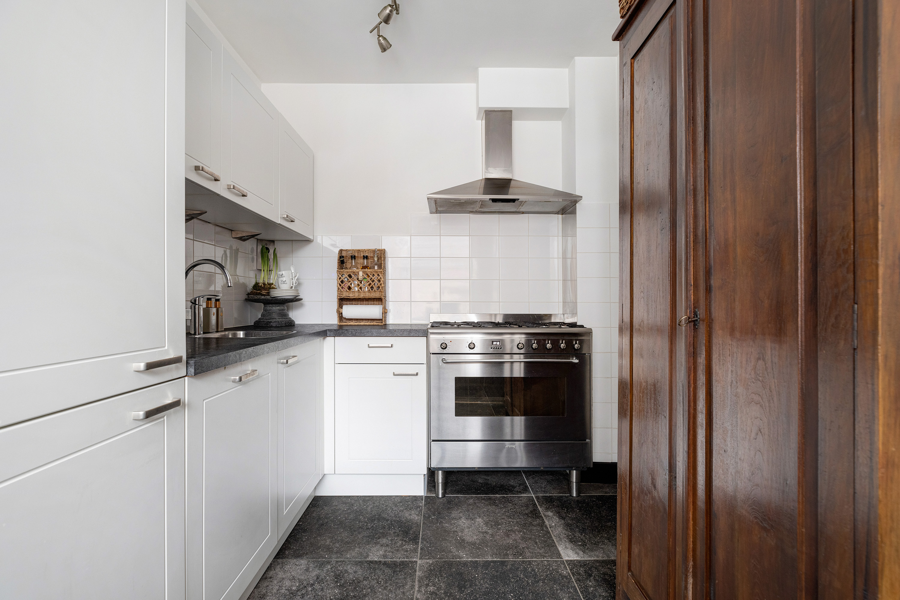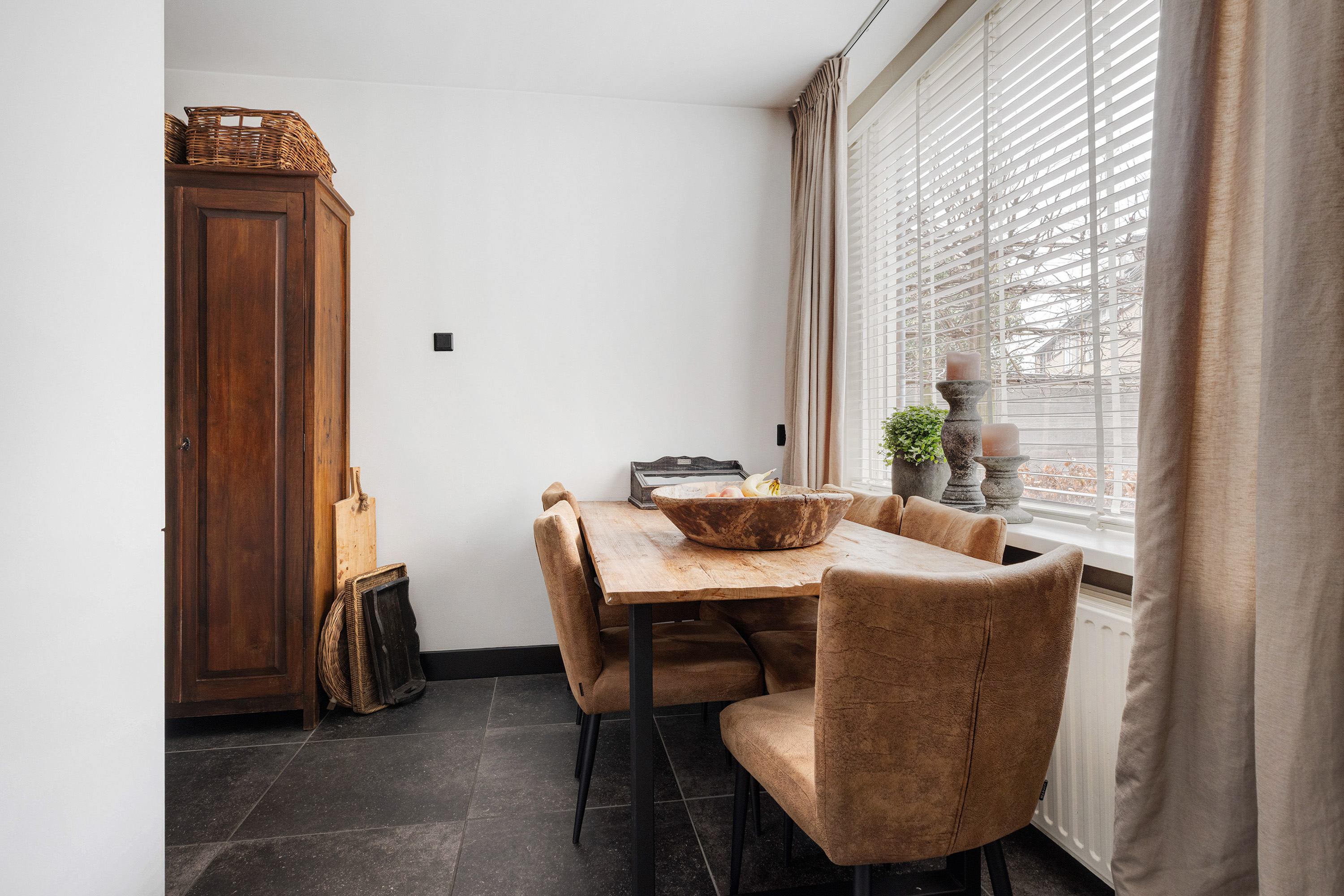 Aan de voorzijde van de woning bevindt zich de sfeervolle eetkeuken met ruimte voor een gezellige eethoek. De keuken is opgesteld in een hoekopstelling en uitgevoerd in crème met een grijs kunststof aanrechtblad. Voorzien van een 5-pits gasfornuis met brede oven, RVS afzuigkap, koelkast en vaatwasser, een fijne plek om uitgebreid te koken en tafelen.