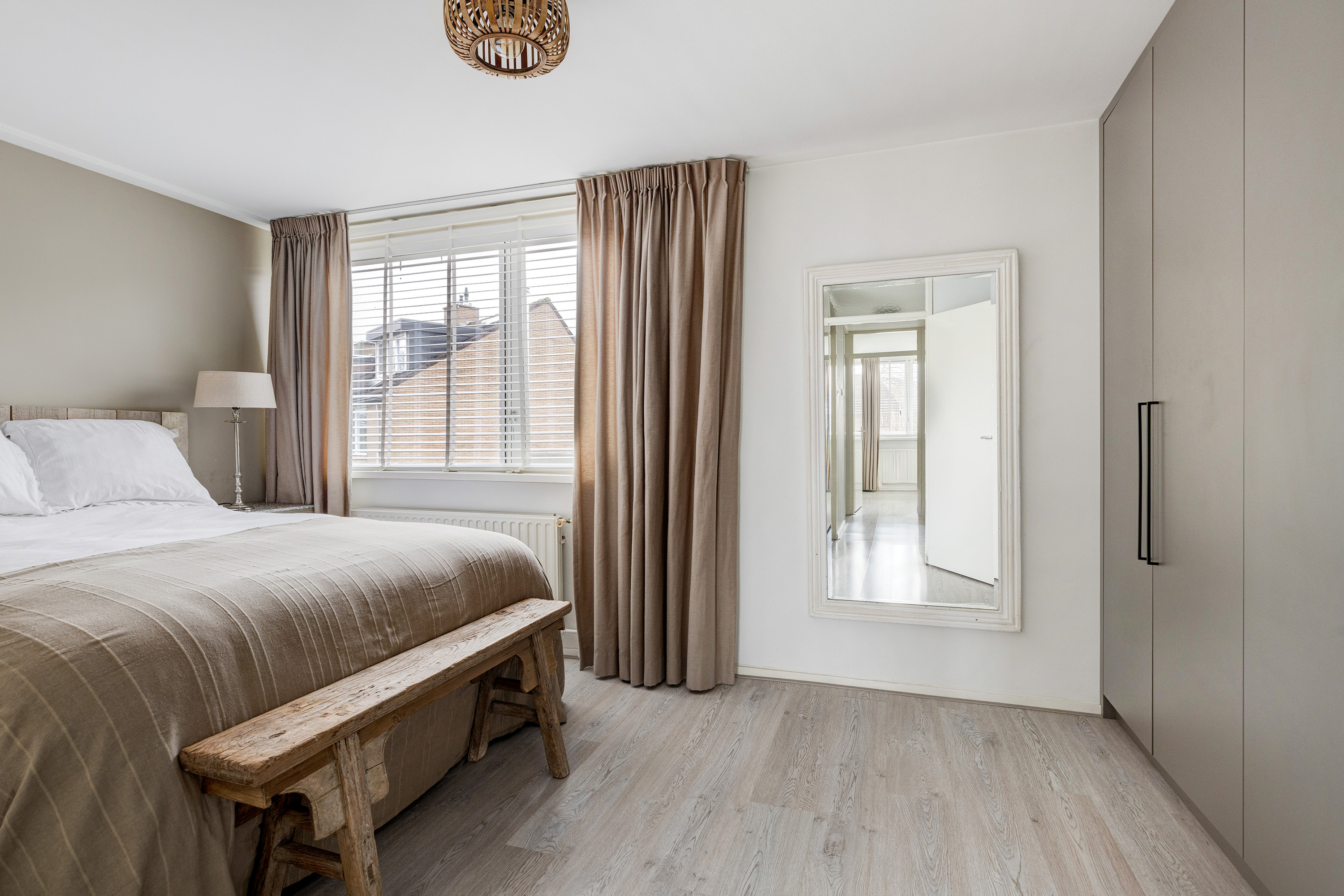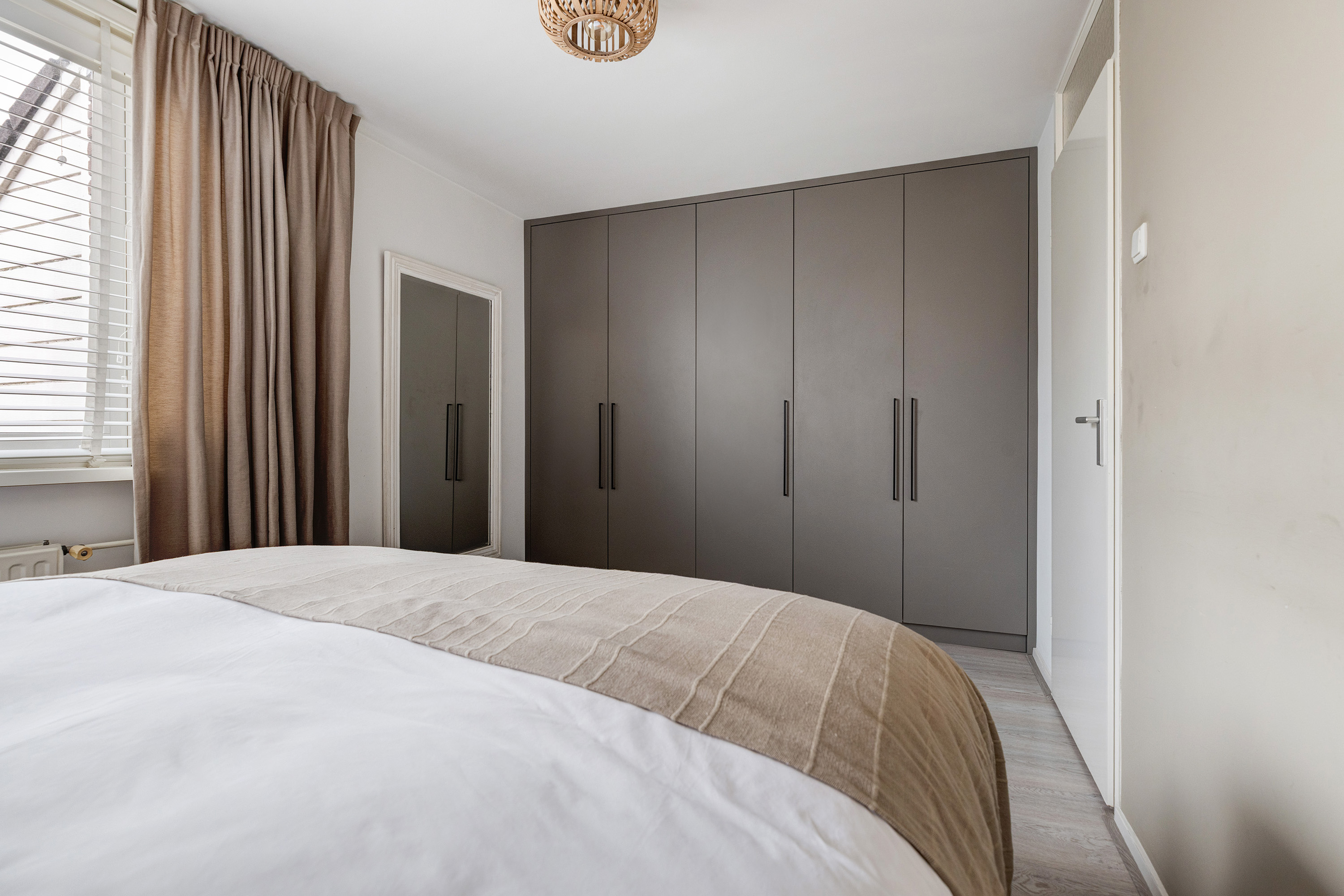 Slaapkamer 1 (voorzijde): royale kamer met een vaste kastenwand in taupe kleur.