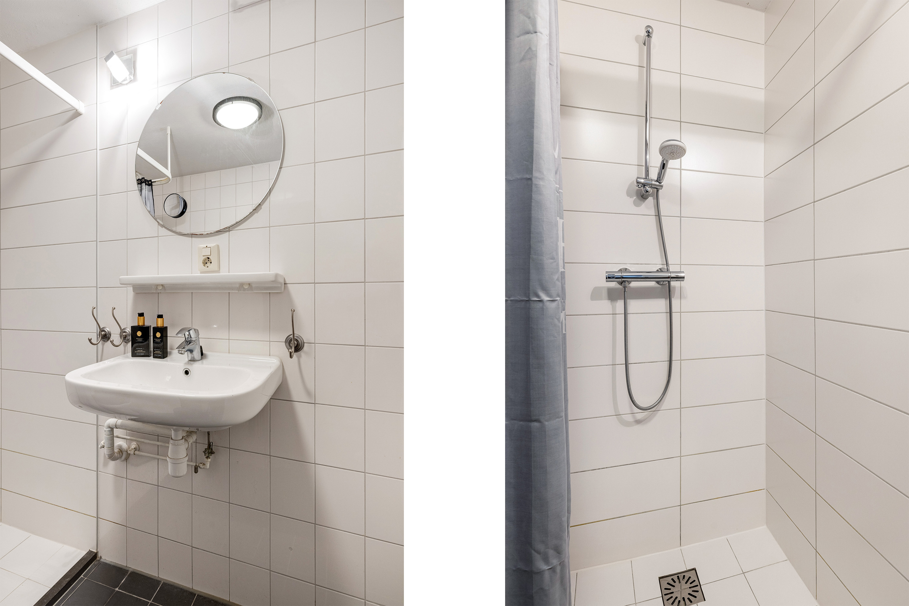 De badkamer is volledig betegeld met witte wandtegels en grijze vloertegels en beschikt over een inloopdouche, tweede toilet (duoblok) en vaste wastafel. Een nette, tijdloze en functionele ruimte.