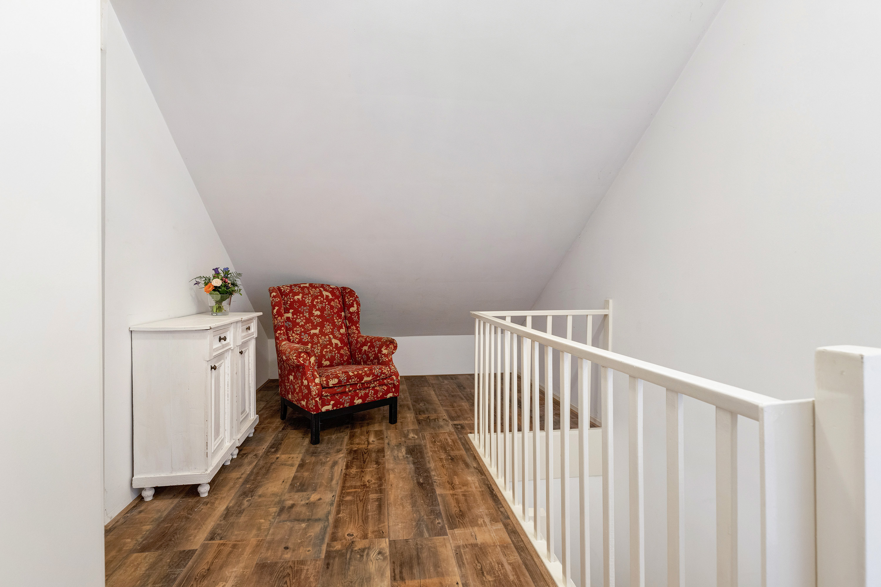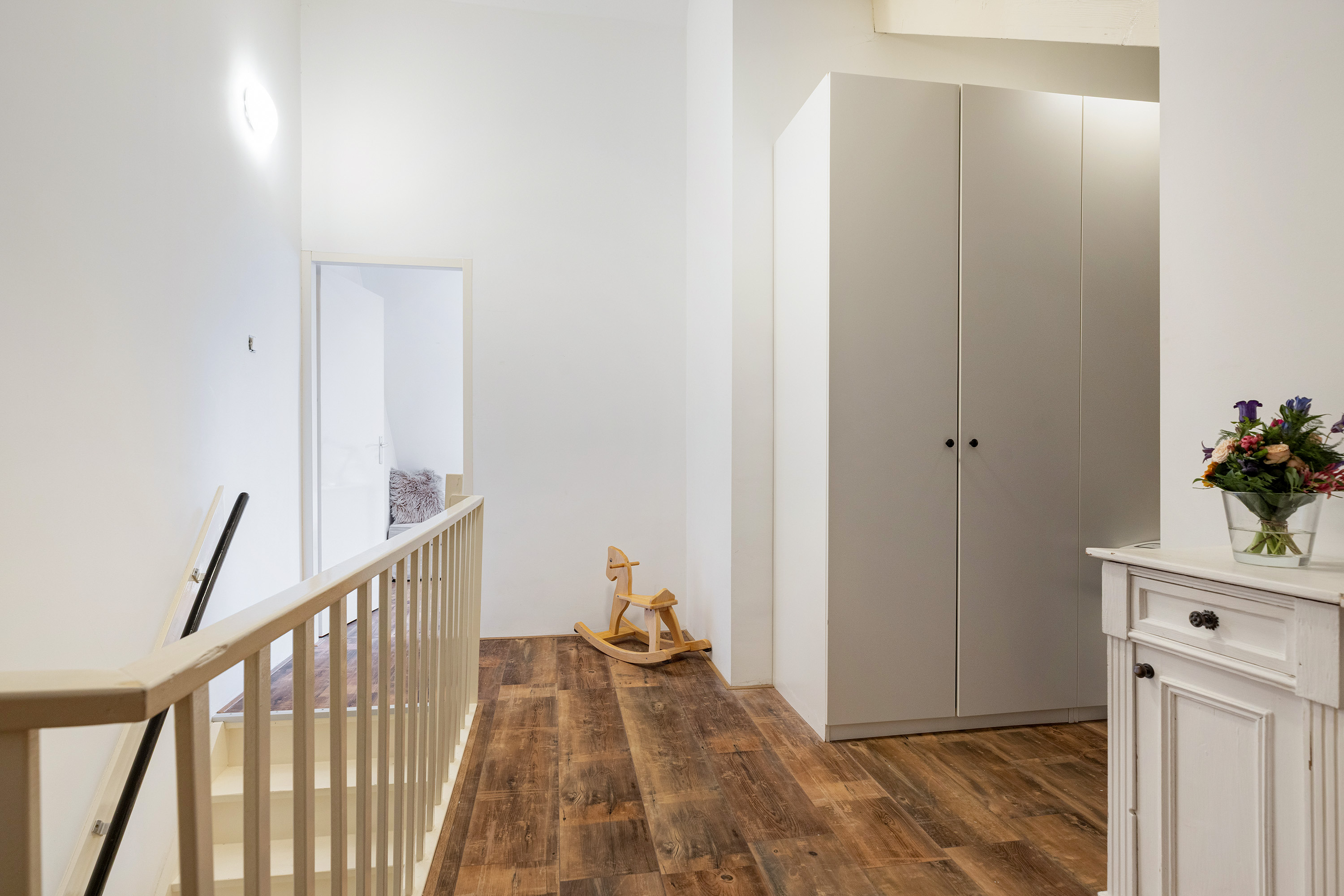 Via een vaste trap bereik je de tweede verdieping. Op de voorzolder bevindt zich de opstelplaats van de HR cv-combiketel (AWB, 2012), netjes weggewerkt in een aparte nis.
