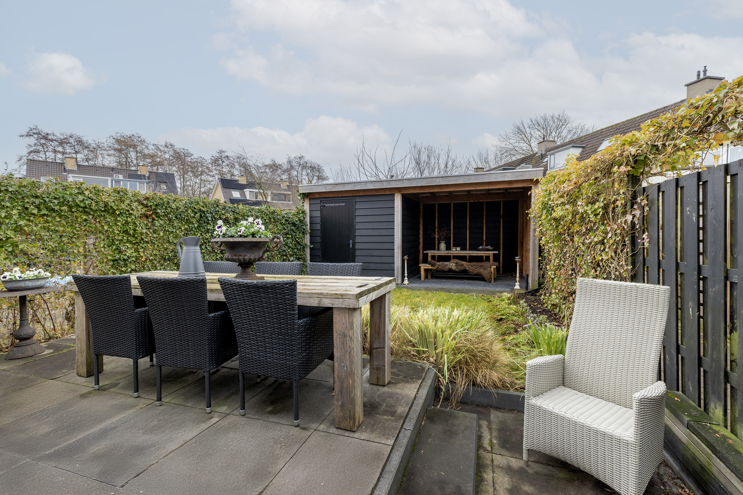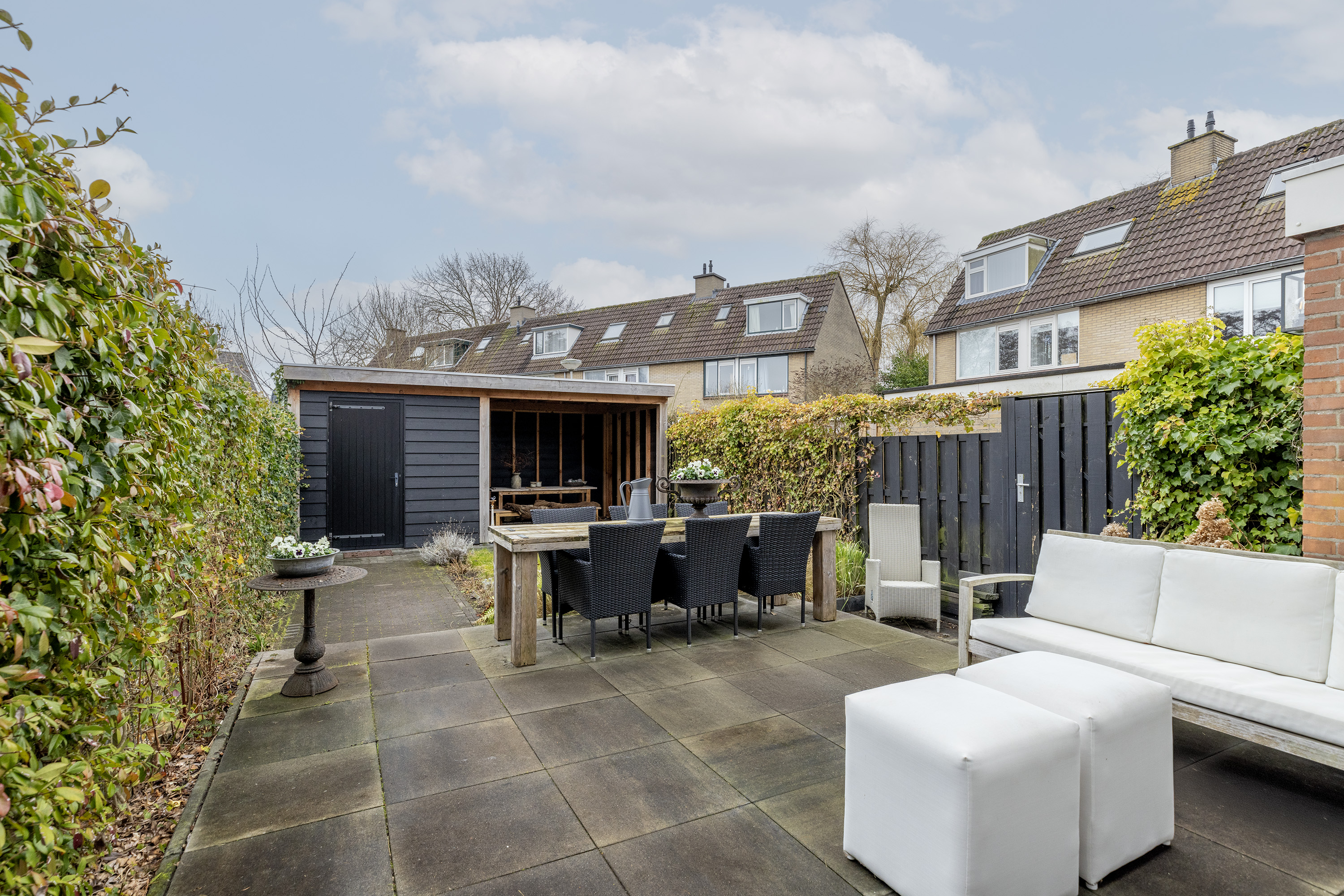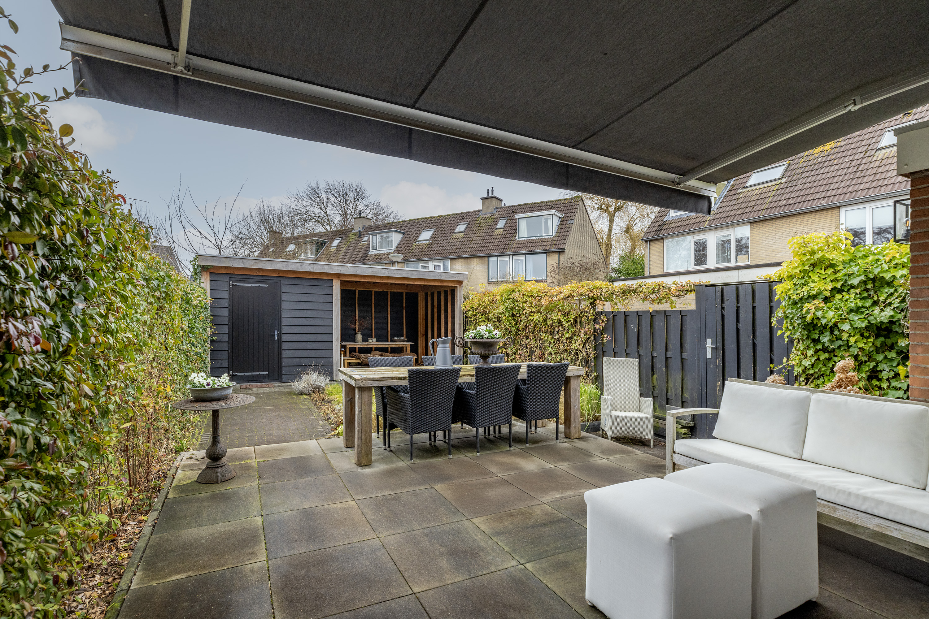De achtertuin is gelegen op het zuidoosten en biedt volop zon. De tuin is verzorgd aangelegd met sierbeplanting, gazon en een houten berging met aangebouwde veranda, uitgevoerd in Douglas hout met Zweeds rabat, een heerlijke plek om tot in de late uurtjes te genieten. Daarnaast is er een handmatig bedienbaar grijs zonnescherm aanwezig. Achter de woning bevindt zich nog een kleine aangebouwde stenen berging. De tuin is tevens bereikbaar via een zij-ingang en grenst aan een speelpleintje, ideaal voor gezinnen met kinderen.