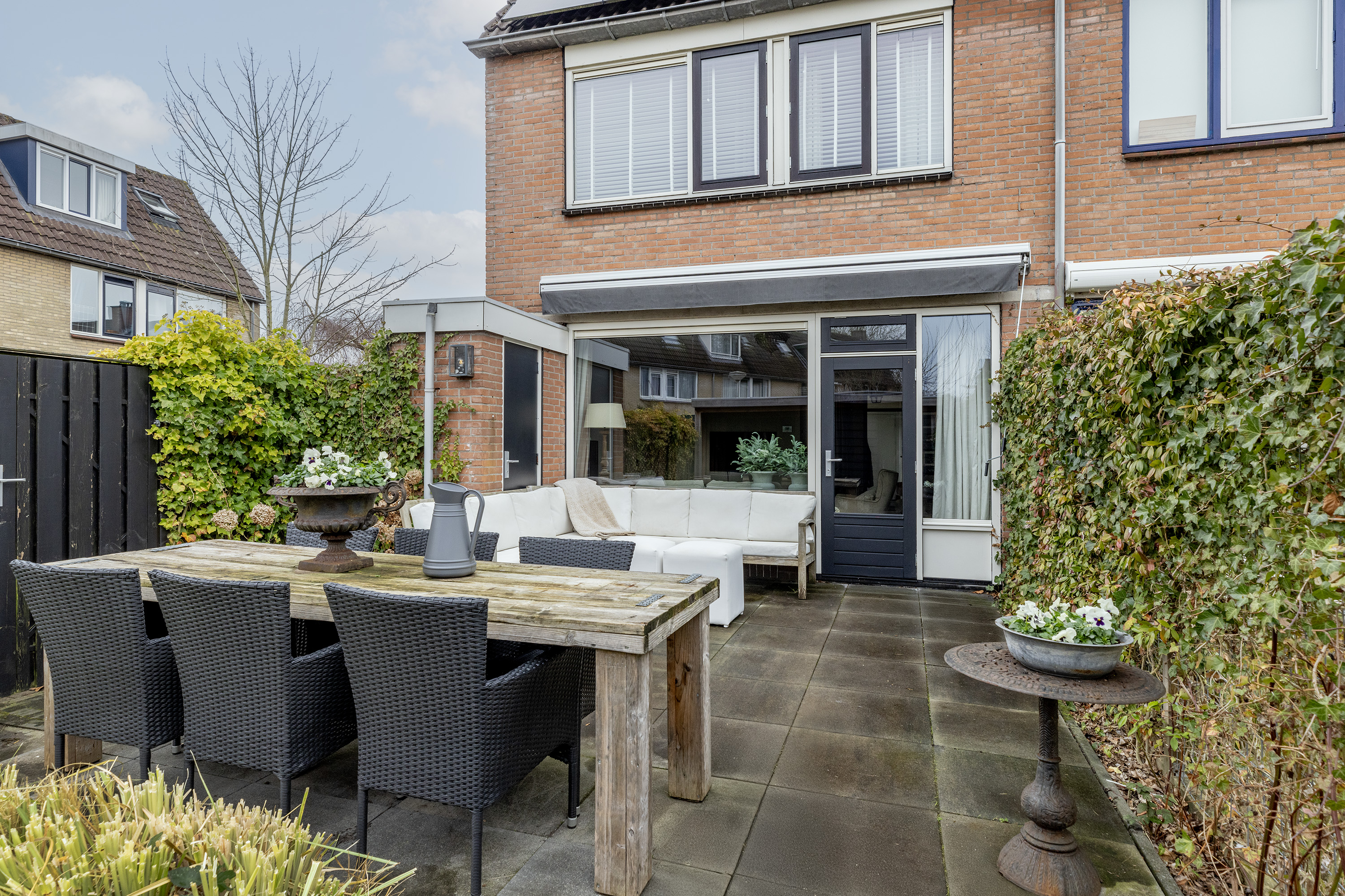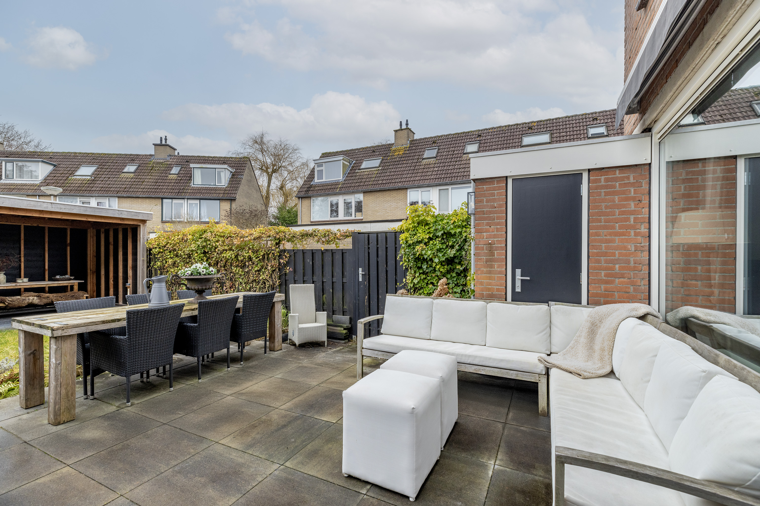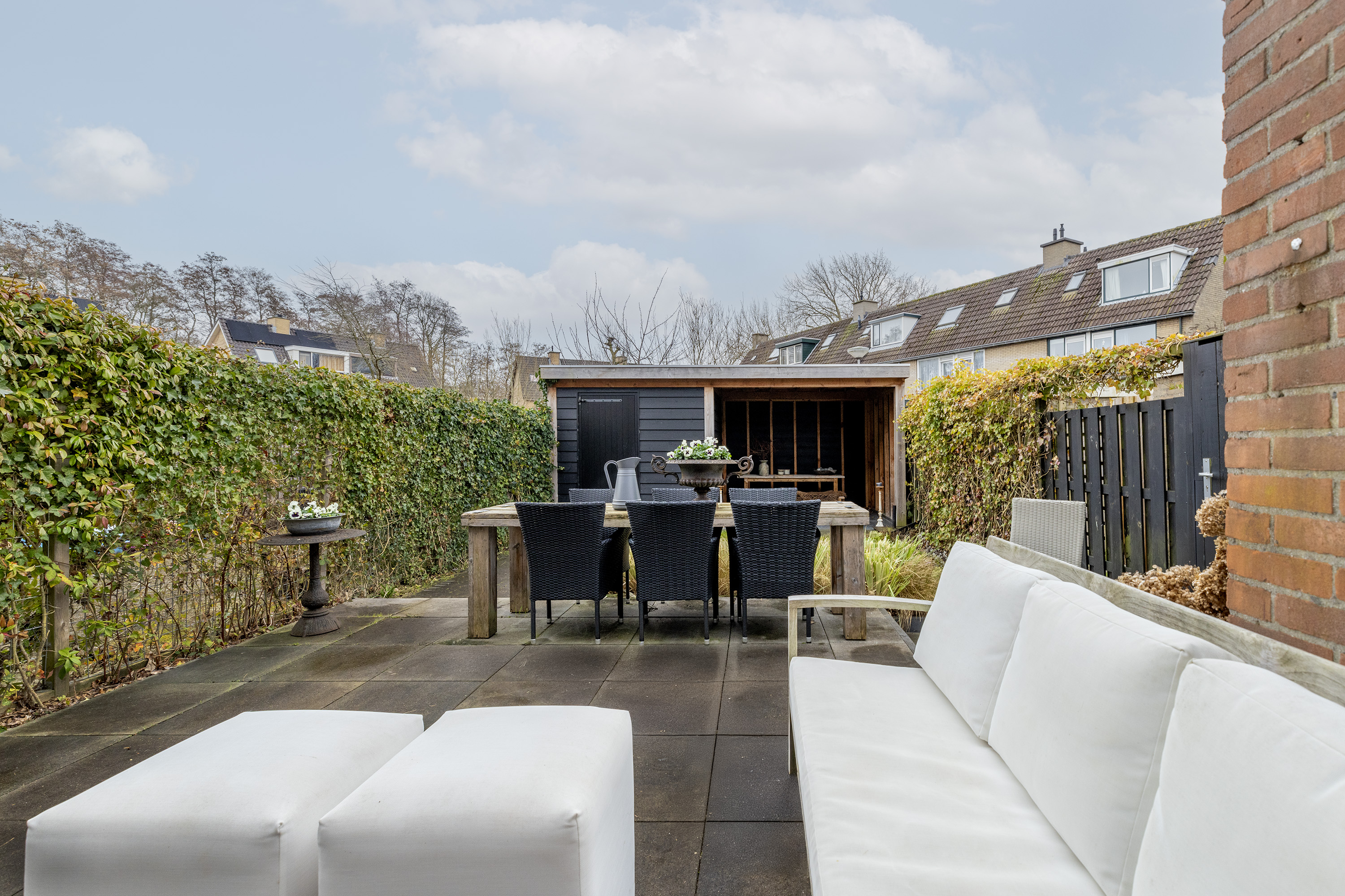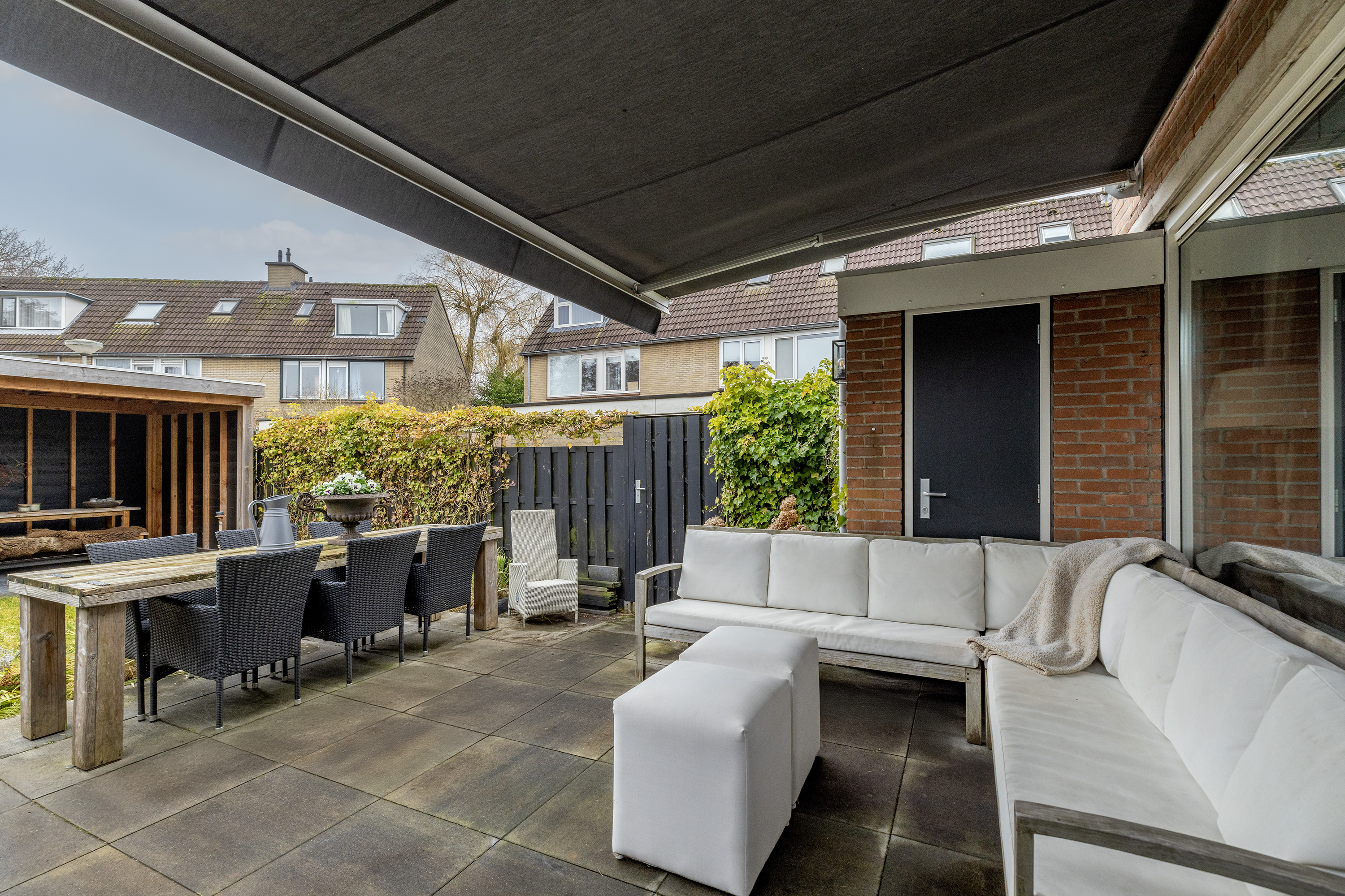 De achtertuin is gelegen op het zuidoosten en biedt volop zon. De tuin is verzorgd aangelegd met sierbeplanting, gazon en een houten berging met aangebouwde veranda, uitgevoerd in Douglas hout met Zweeds rabat, een heerlijke plek om tot in de late uurtjes te genieten. Daarnaast is er een handmatig bedienbaar grijs zonnescherm aanwezig. Achter de woning bevindt zich nog een kleine aangebouwde stenen berging. De tuin is tevens bereikbaar via een zij-ingang en grenst aan een speelpleintje, ideaal voor gezinnen met kinderen.