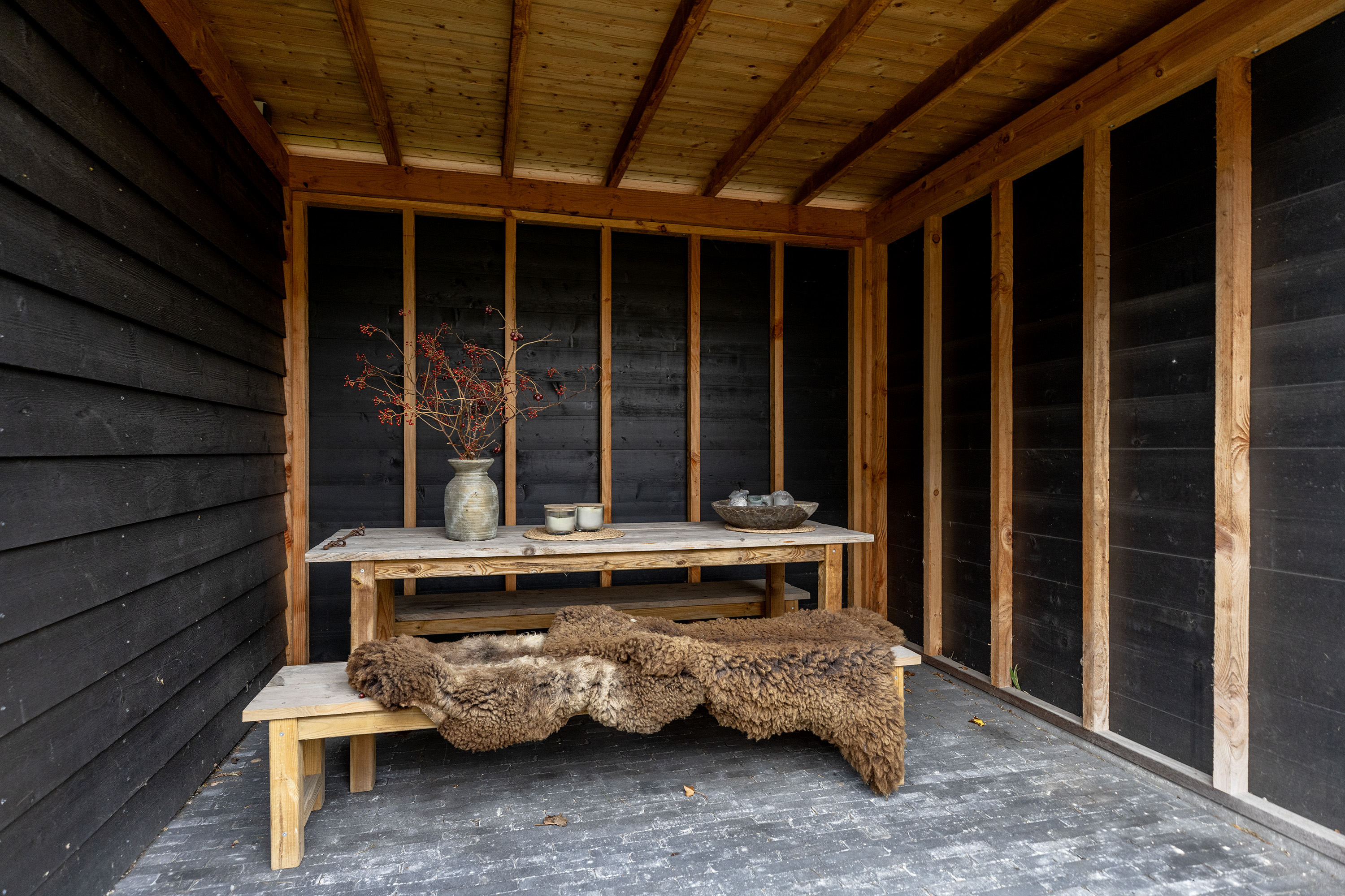 - Houten berging met aangebouwde veranda (Douglas hout, Zweeds rabat)