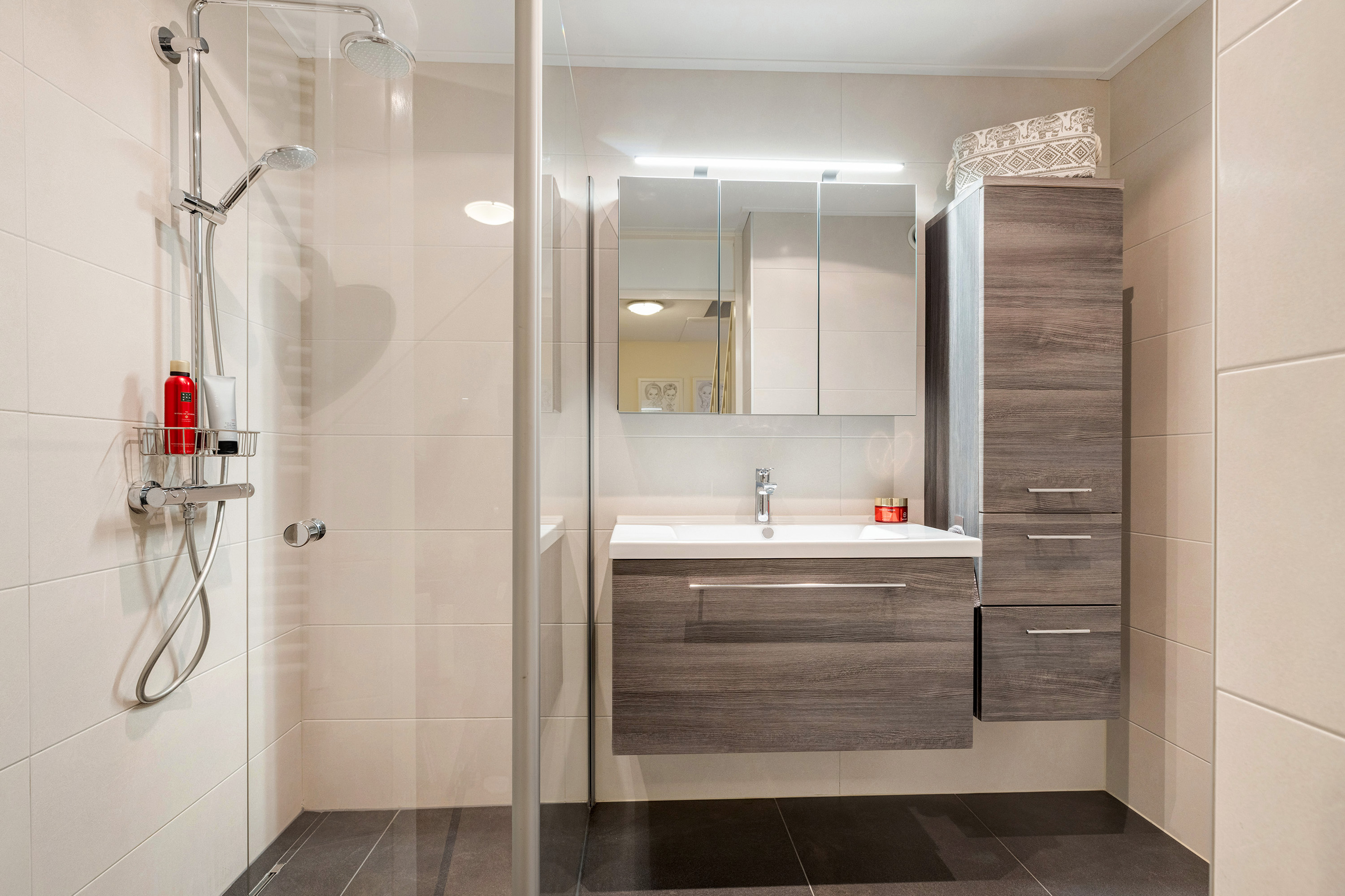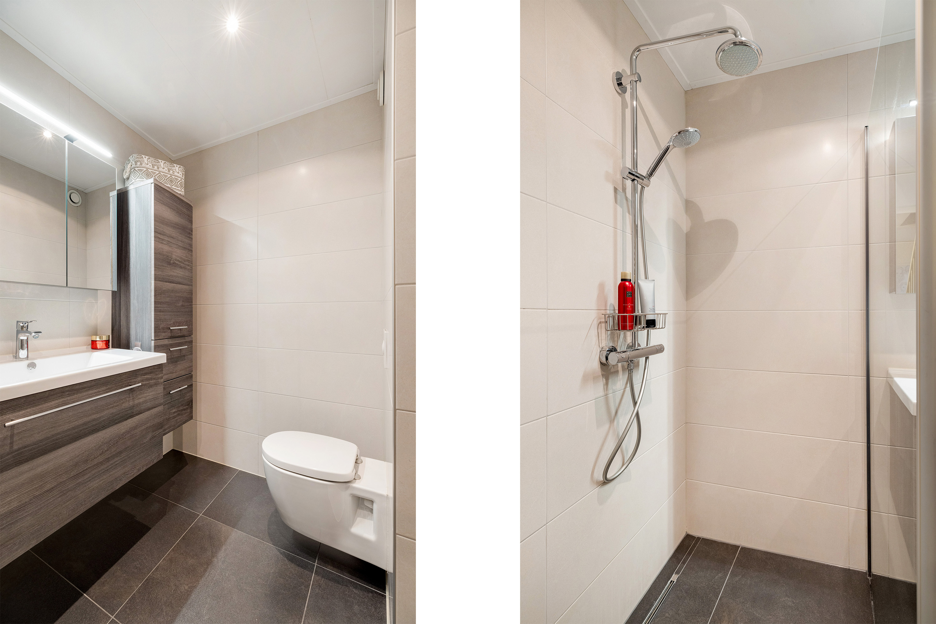 De luxe badkamer is volledig betegeld in moderne beige/grijstinten en uitgerust met een fraai wastafelmeubel met spiegelkast en verlichting, een tweede hangend toilet en een royale inloopdouche met glazen wand en regendouche.