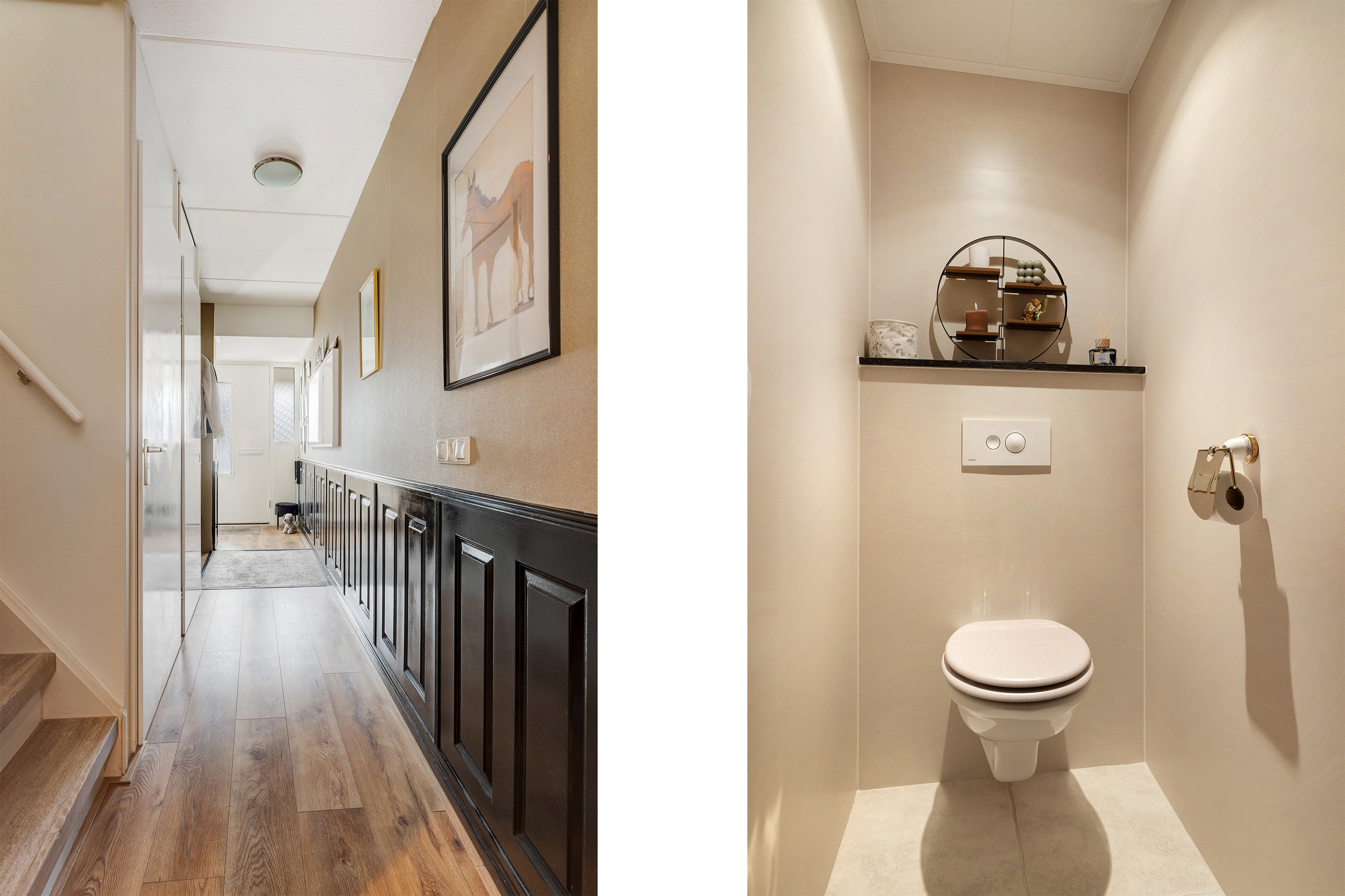 Een ruime, lichte entree verwelkomt u direct. De hal is voorzien van garderoberuimte, meterkast en een modern afgewerkte toiletruimte met stijlvolle lichte wandpanelen.