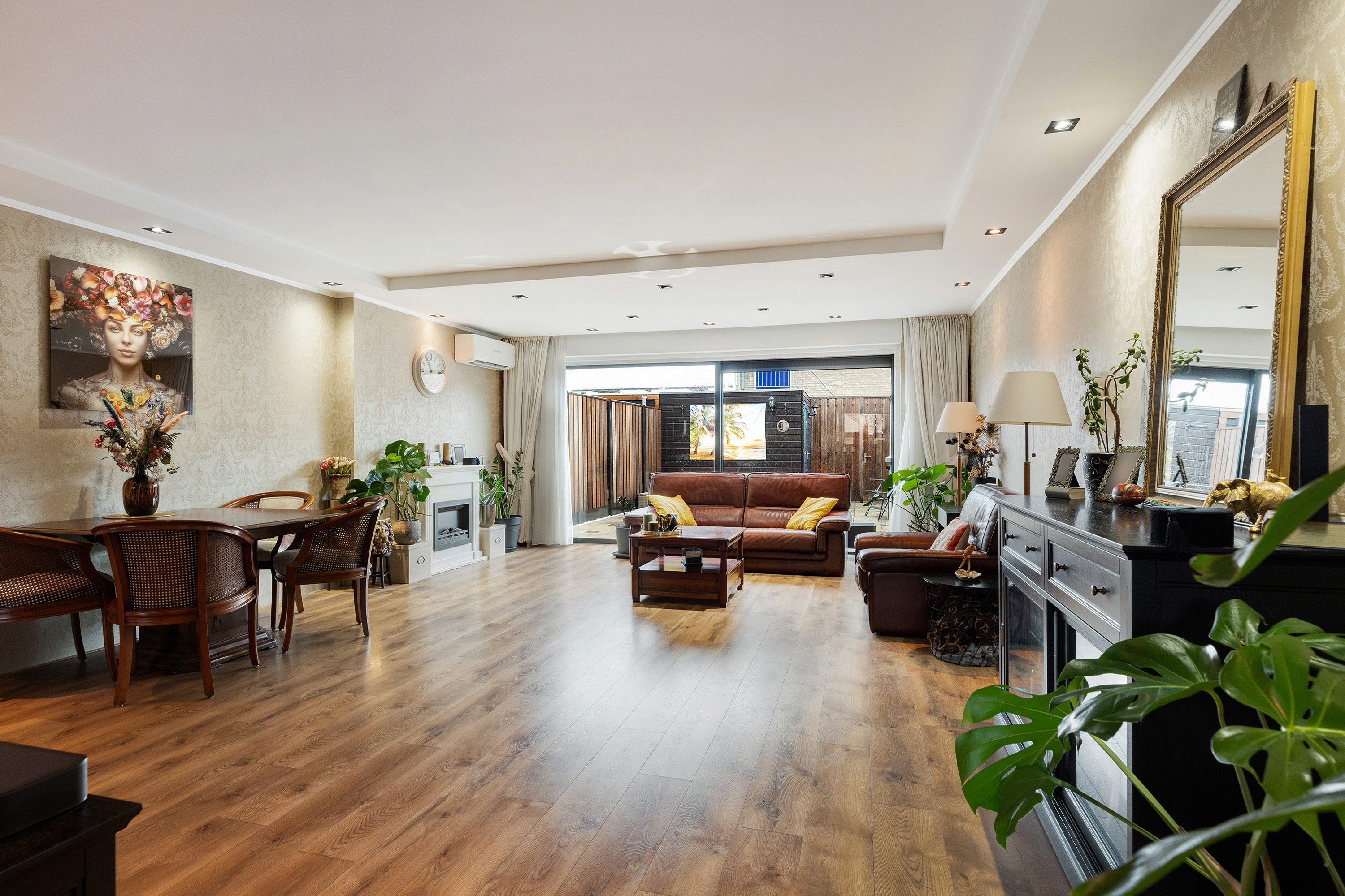 Via de zwarte glazen paneeldeur bereikt u de tuingerichte woonkamer – uitgebouwd, voorzien van grote schuifpui, waardoor daglicht rijkelijk naar binnen stroomt. De laminaatvloer met vloerverwarming zijn nieuw aangelegd in 2021. De spotverlichting in het plafond, convectorradiator en een sfeervolle elektrische haard zorgen voor sfeer én comfort. Daarnaast is er airconditioning (2020) aanwezig voor zowel koeling als verwarming.