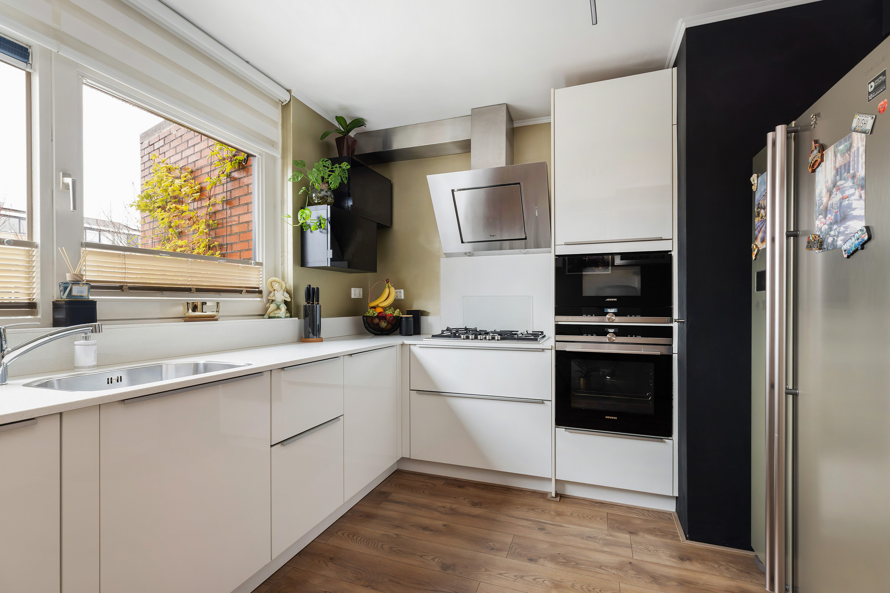 De moderne halfopen keuken aan de voorzijde is strak uitgevoerd in hoekopstelling met uitgebreide inbouwapparatuur zoals een 5-pits gaskookplaat met RVS afzuigkap, oven, magnetron, vaatwasser en een royale Amerikaanse koel-vriescombinatie. Deze laatste is zelfs verrijdbaar, waardoor de praktische trapkast altijd eenvoudig bereikbaar blijft.