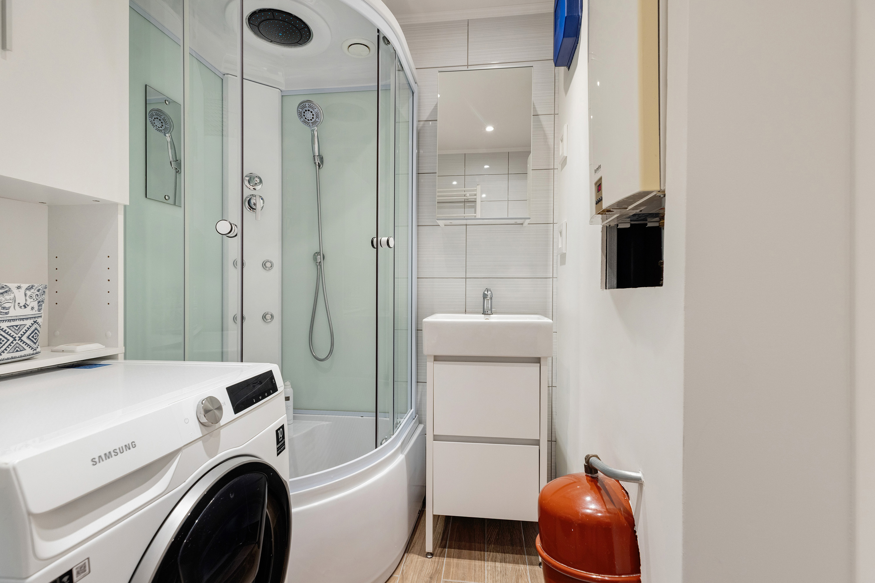 Op de overloop bevindt zich een afgesloten technische ruimte met opstelplaats voor de wasmachine en droger, de CV-installatie, een extra douchecabine met massagejets en een wastafelmeubel – ideaal voor een groot gezin.