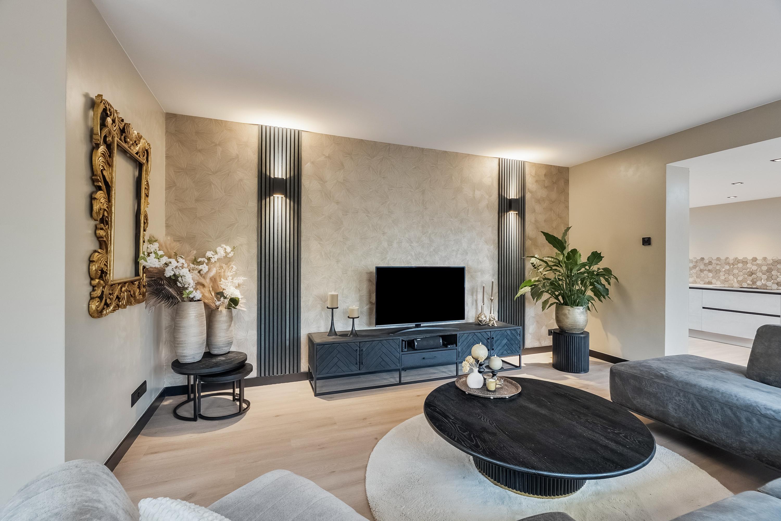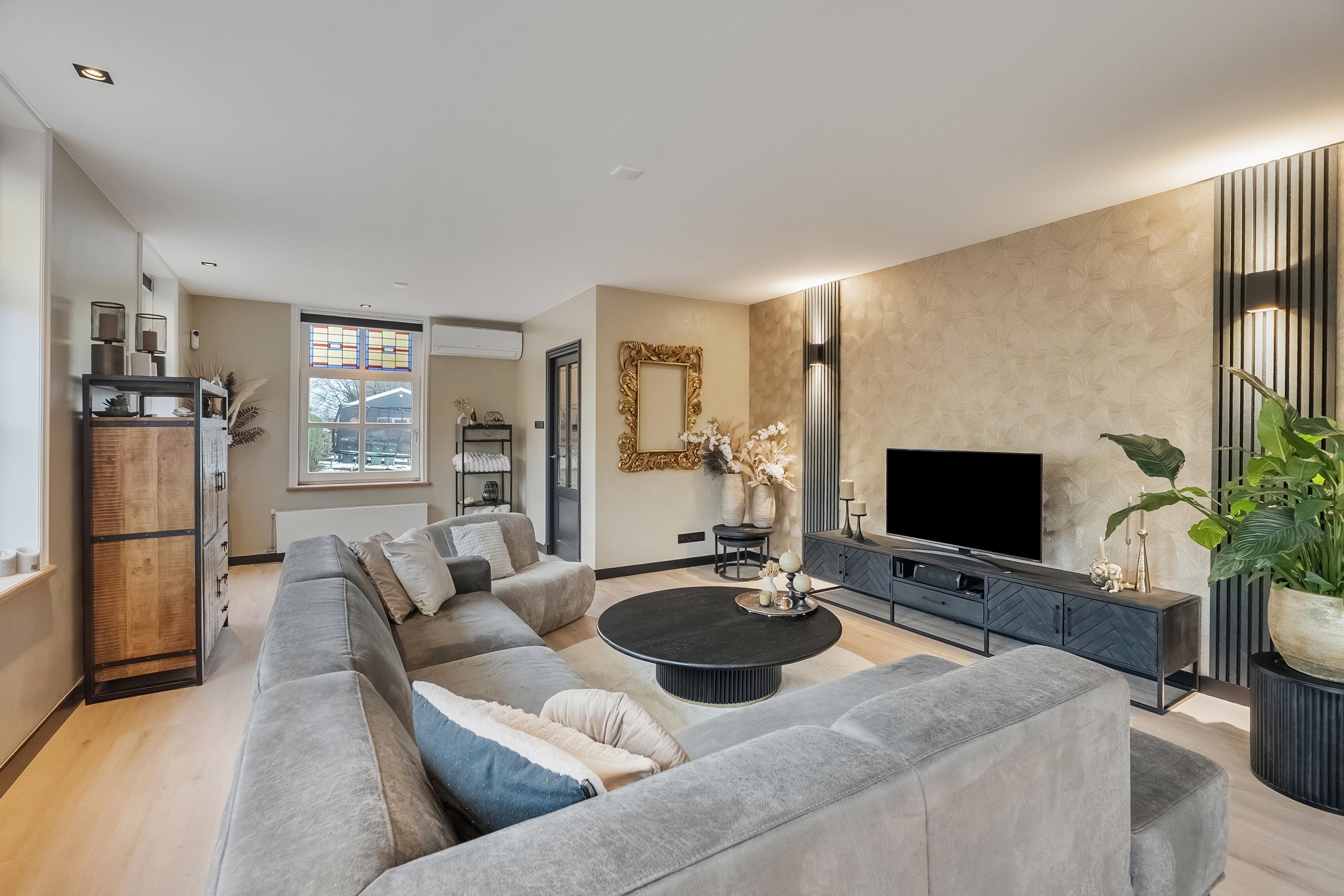 De sfeervolle living biedt uitzicht op de dijk en is afgewerkt met een nieuwe laminaatvloer (2023) met vloerverwarming, glad gestucte wanden en deels luxe behang. De vele ramen met glas-in-lood zorgen voor een prachtige lichtinval. Tevens is hier airconditioning aanwezig. Via een speels niveauverschil bereikt u de keuken en eetkamer.