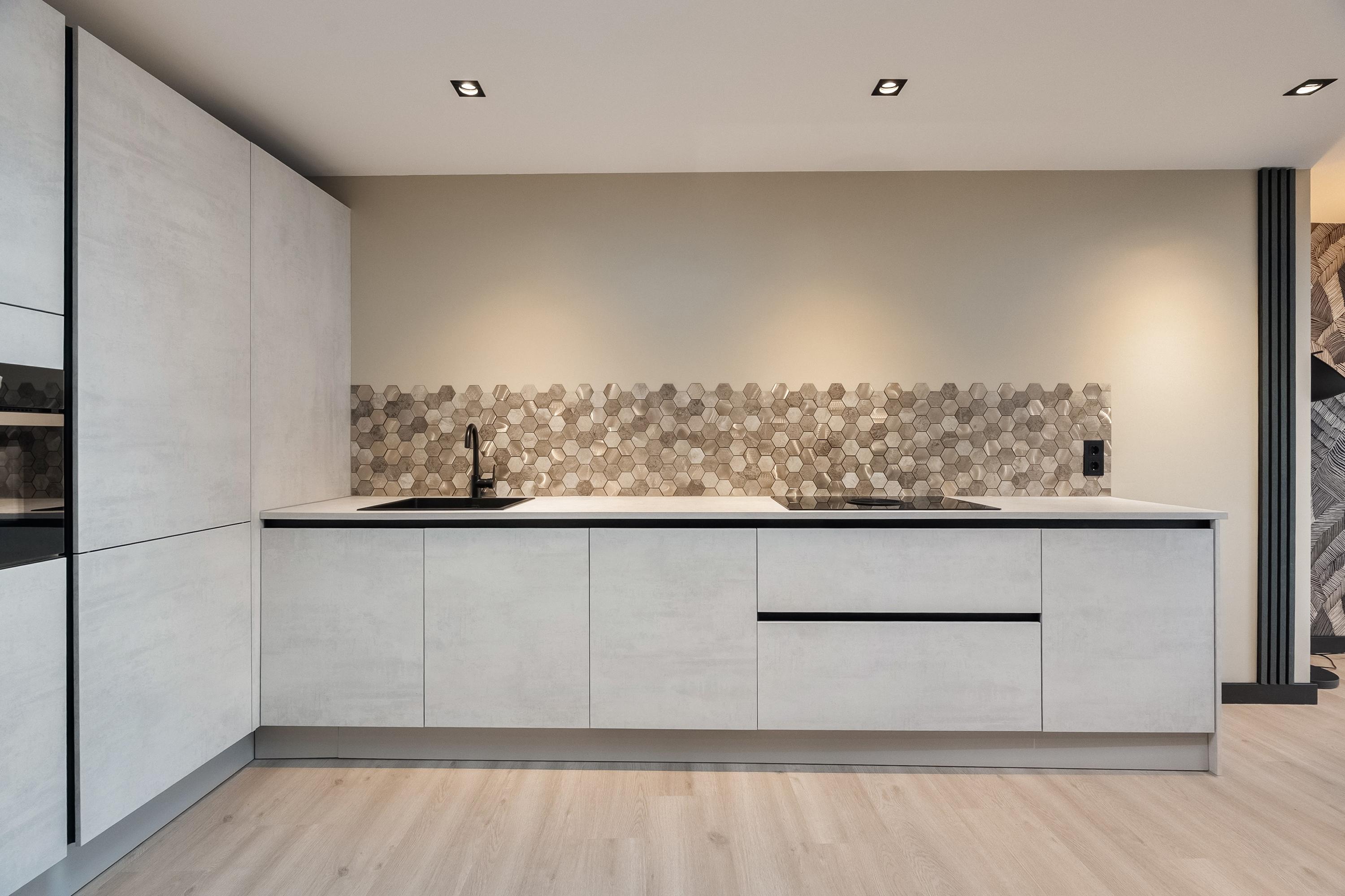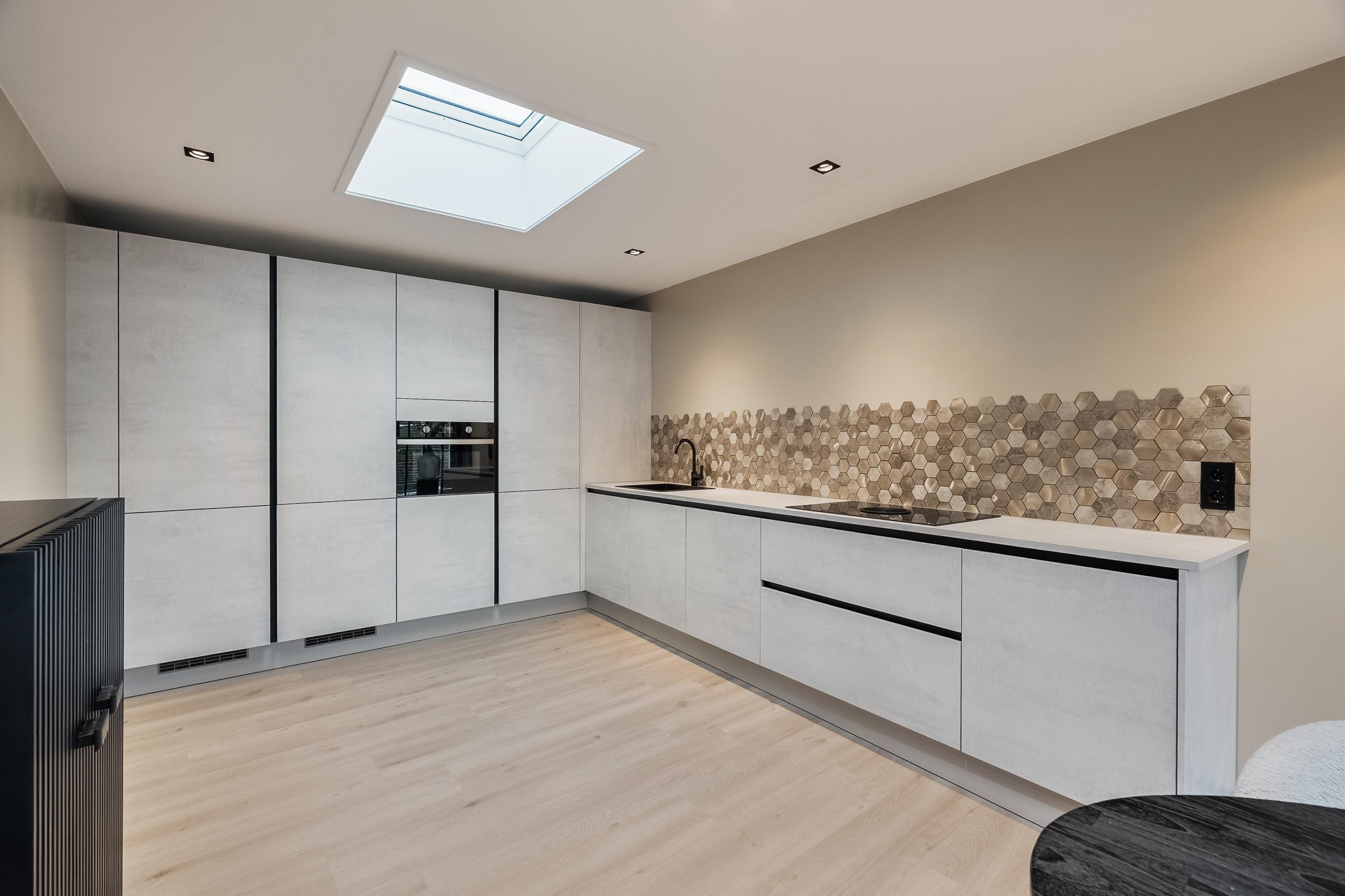 De keuken is in 2023 volledig vernieuwd en uitgevoerd in een moderne lichtgrijze hoekopstelling. Voorzien van twee koel-/vriescombinaties, vaatwasser, combi-oven en een Bora inductiekookplaat met geïntegreerde afzuiging. Inbouwspots in het plafond, twee dakramen (waarvan één elektrisch bedienbaar) en een sfeervolle erker met brede vensterbank maken dit een heerlijke leefruimte. Vanuit de keuken is de voorraadkast bereikbaar, waar zich ook de elektrameter bevindt.