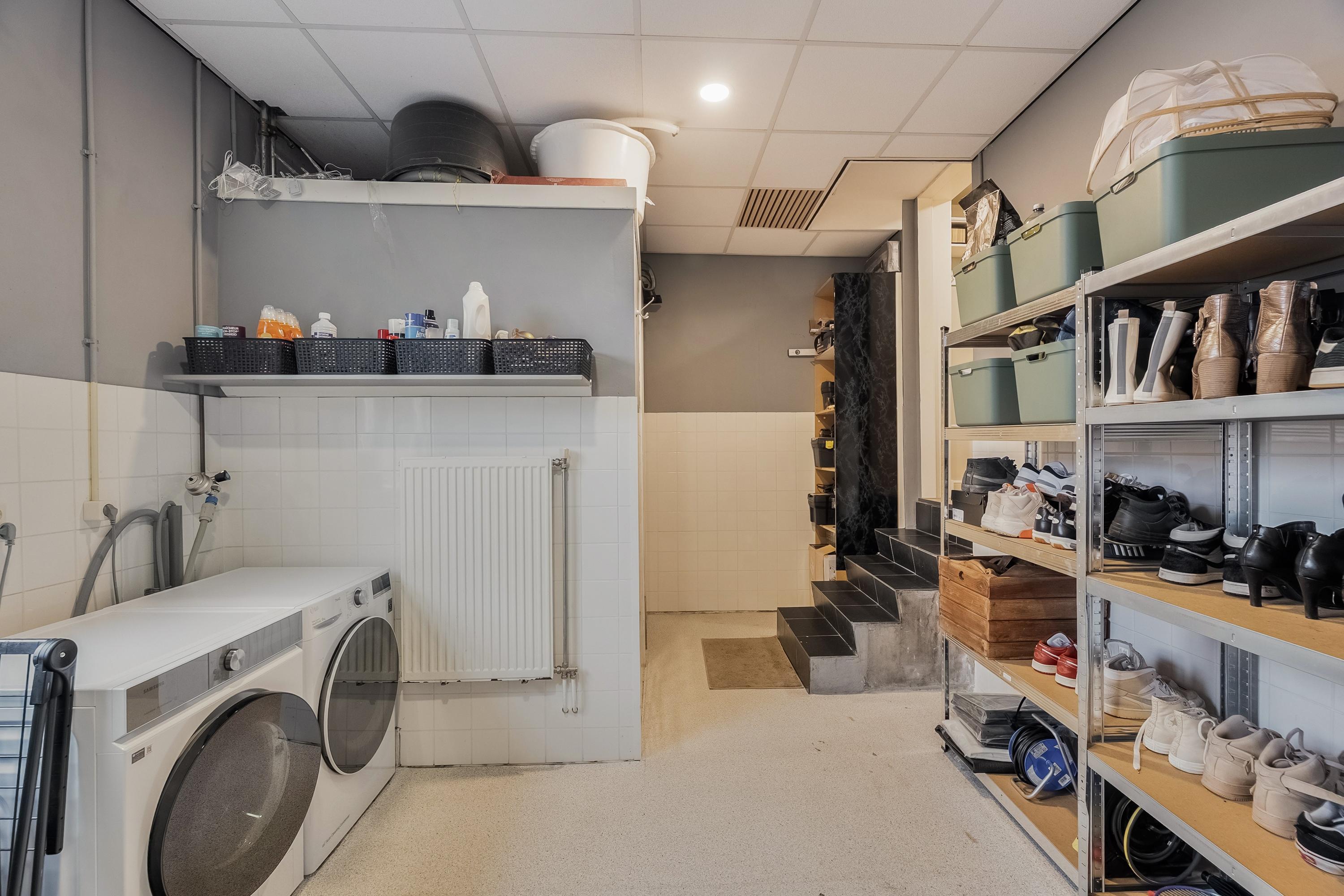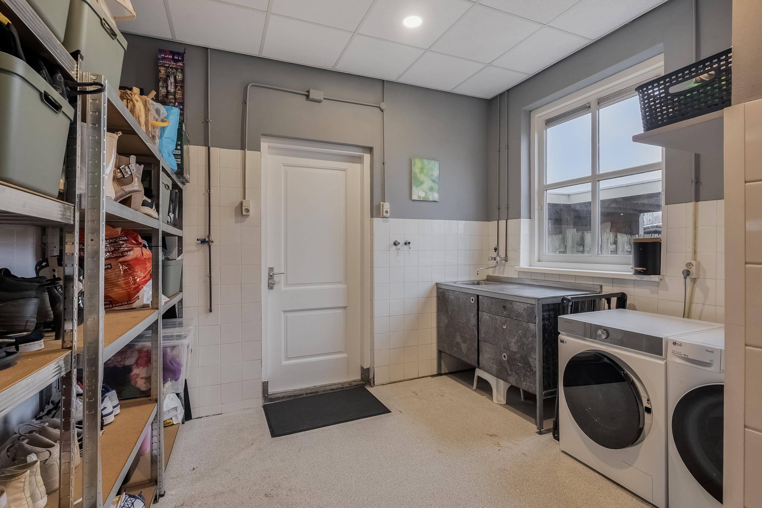 De lager gelegen bijkeuken is bereikbaar vanuit de binnenhal en beschikt over aansluitingen voor wasmachine en droger, een aparte ruimte voor de CV-combiketel (Intergas, 2023), de verdeler van de vloerverwarming en de gas- en watermeter. De ruimte is deels betegeld en voorzien van een aanrechtblad met spoelbak en warm/koud water. Vanuit hier heeft u direct toegang tot de tuin.