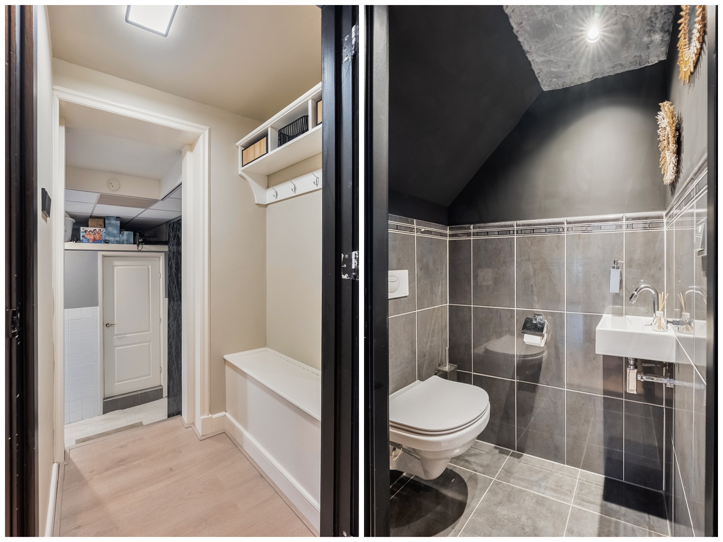 Via de entree komt u in de hal met toegang tot de living. Vanuit deze hal bereikt u de binnenhal. Hier vindt u de trap naar de eerste verdieping, een vaste kelderkast, de bijkeuken, een slaapkamer op de begane grond en een fraai afgewerkte toiletruimte met hangend toilet en fonteintje. De toiletruimte is gedeeltelijk betegeld in grijstinten en voorzien van inbouwspotjes. Middels een stijlvolle zwart glazen paneeldeur bereikt u de woonkamer.