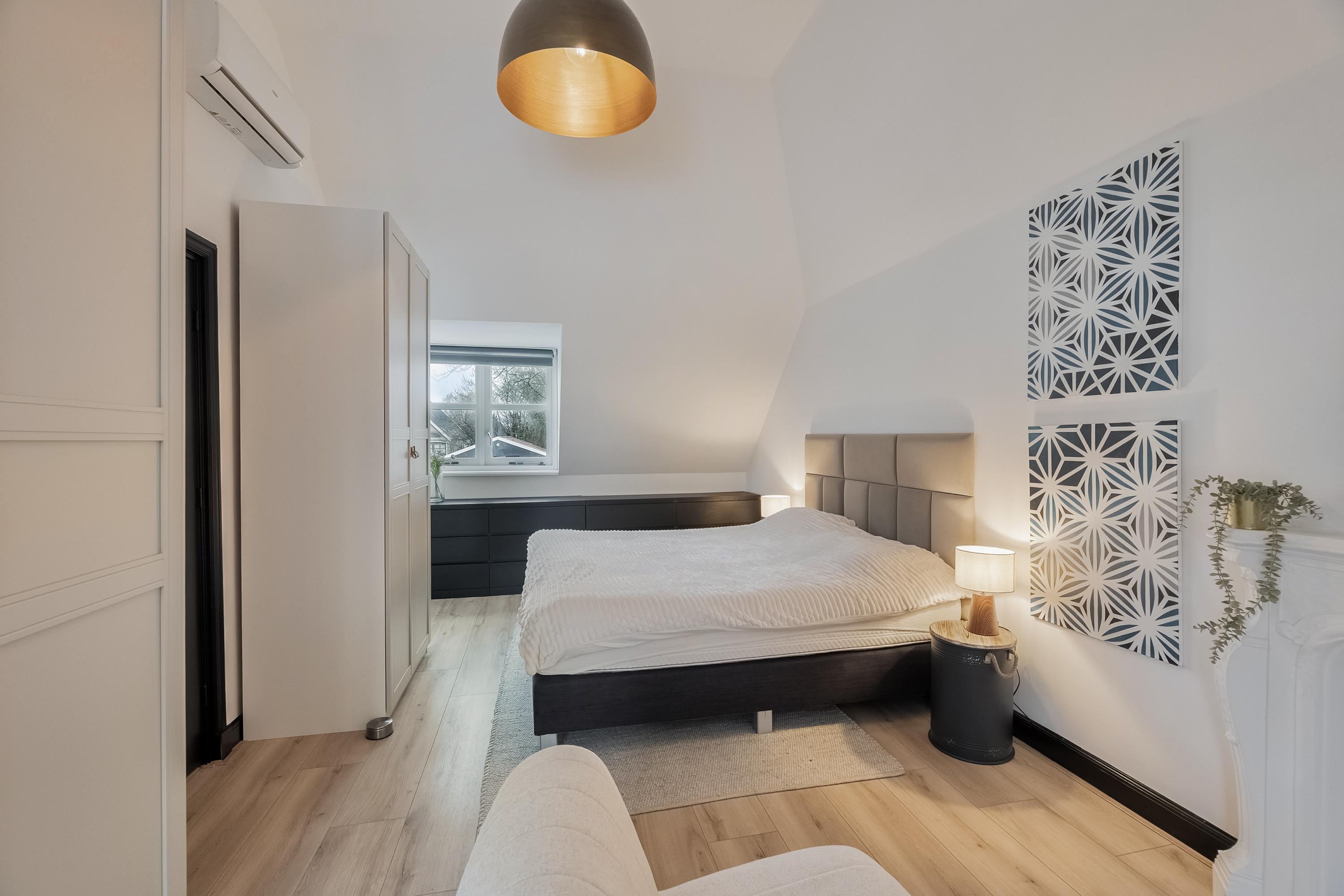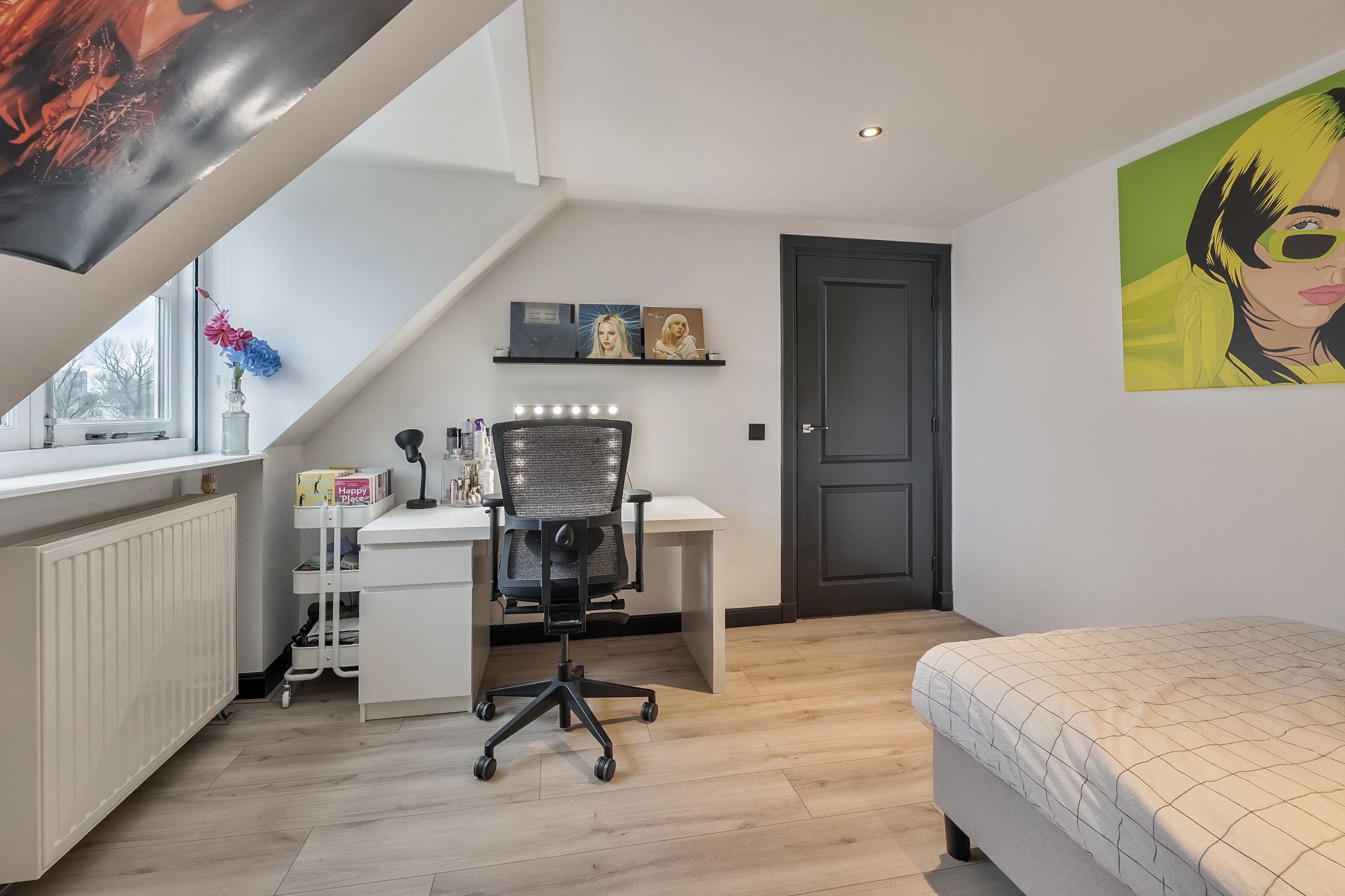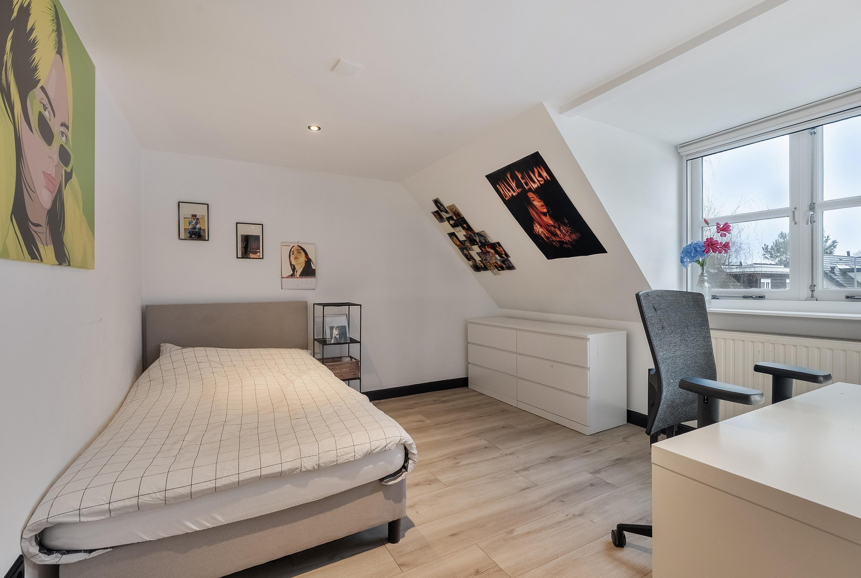 Slaapkamer 4 beschikt eveneens over een dakkapel en is strak afgewerkt met glad gestucte wanden en plafond en inbouwspotjes.