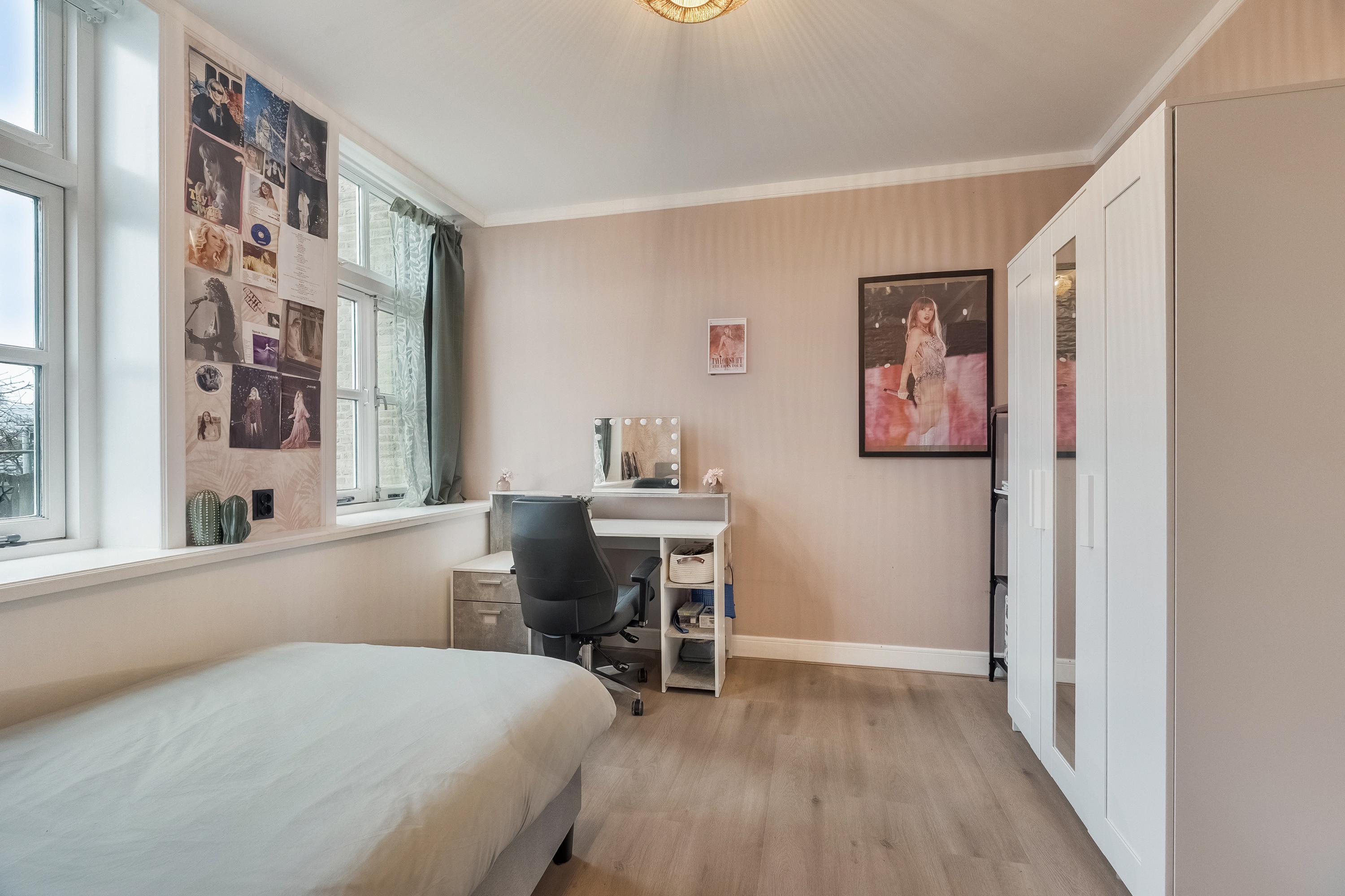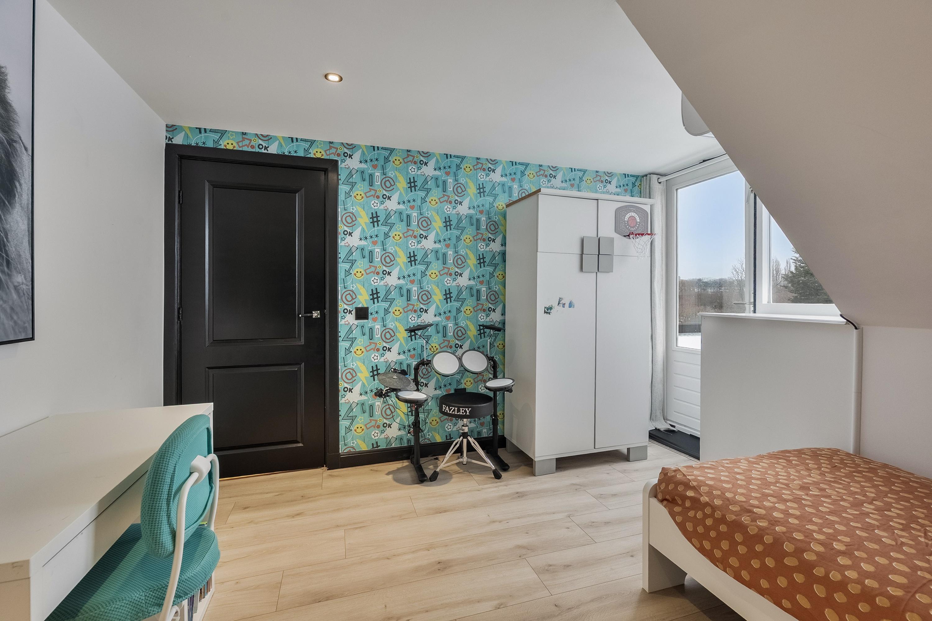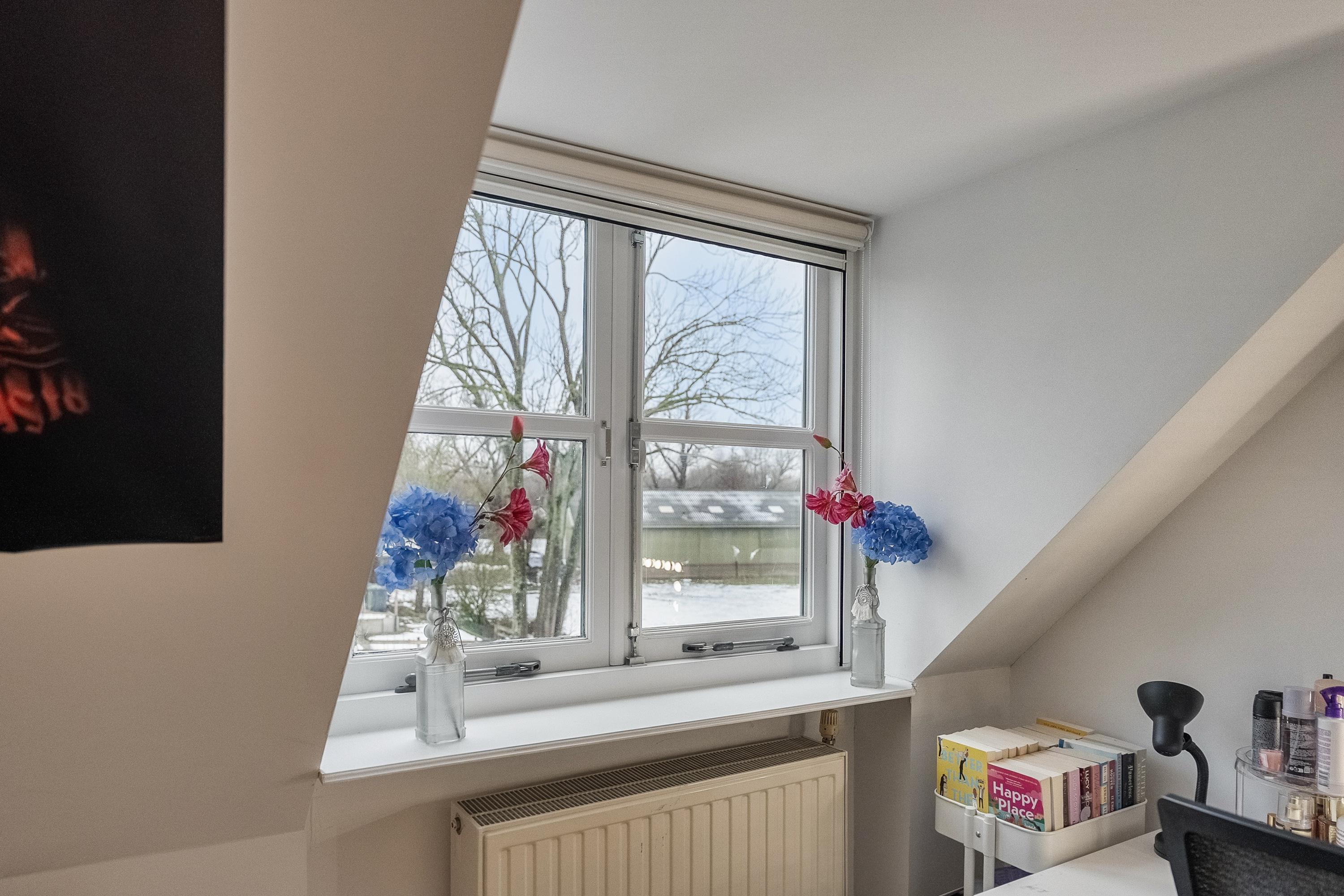 Slaapkamer 4 beschikt eveneens over een dakkapel en is strak afgewerkt met glad gestucte wanden en plafond en inbouwspotjes.