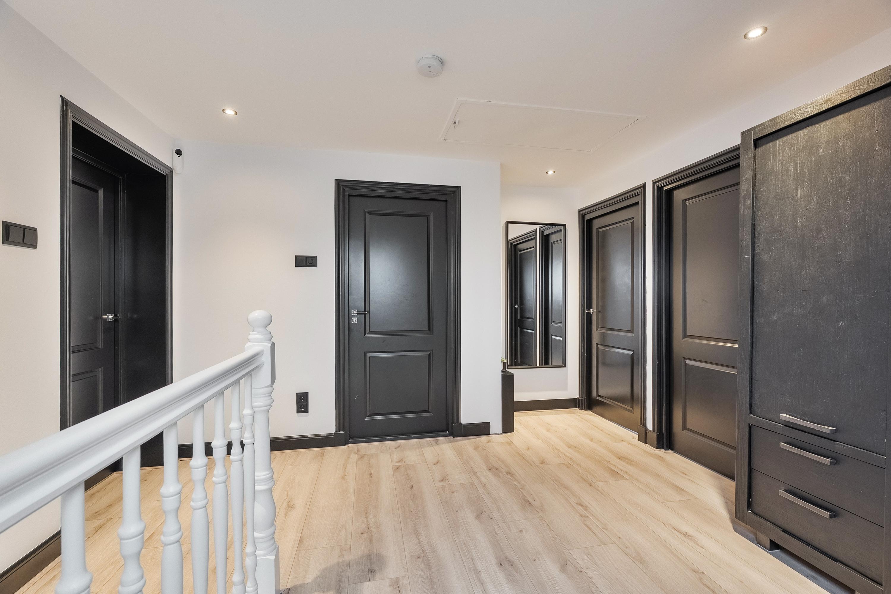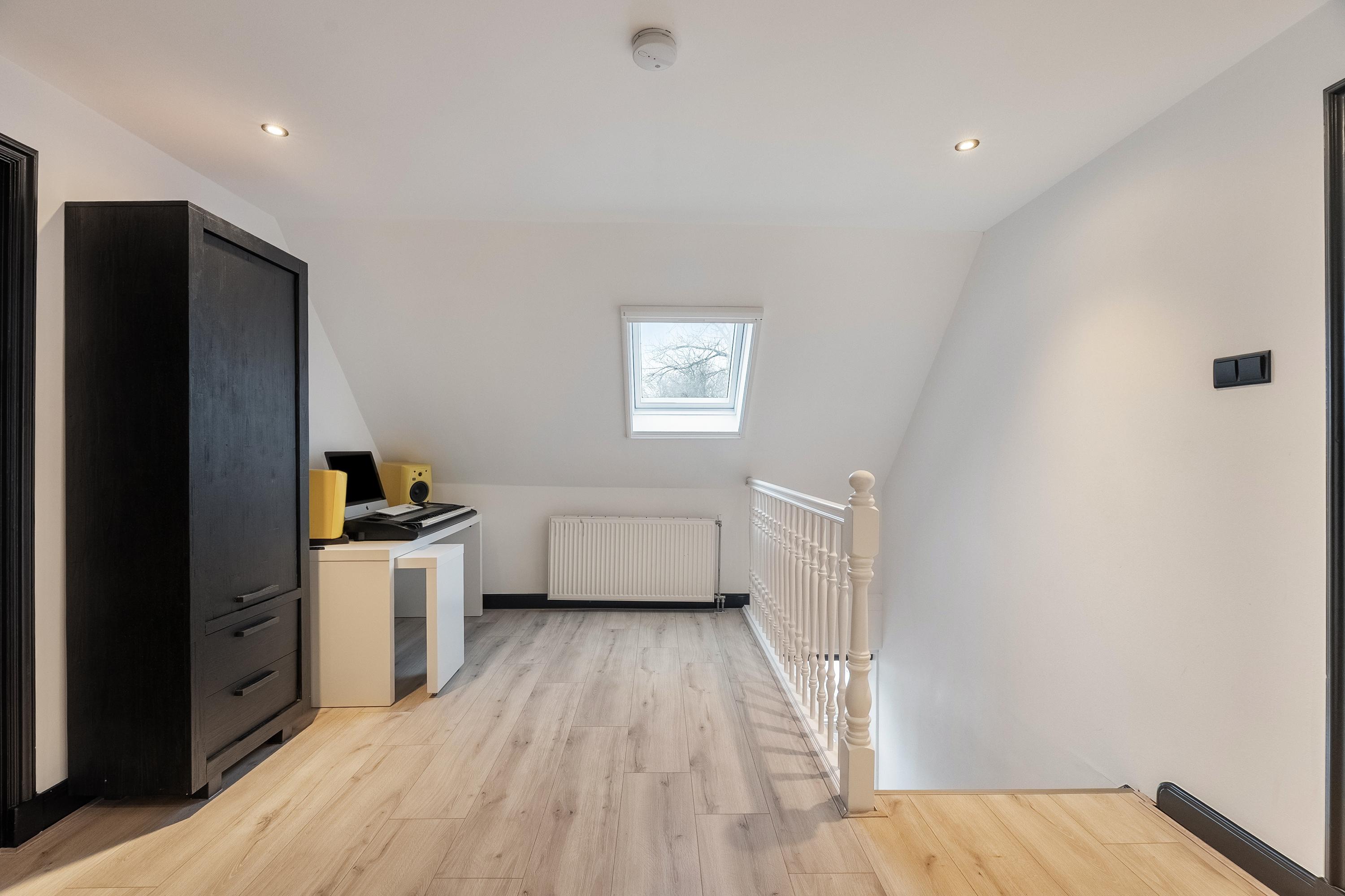 De ruime overloop geeft toegang tot alle vertrekken en is voorzien van een Velux dakraam, inbouwspotjes en een laminaatvloer. Via een vlizotrap is de bergvliering bereikbaar.
