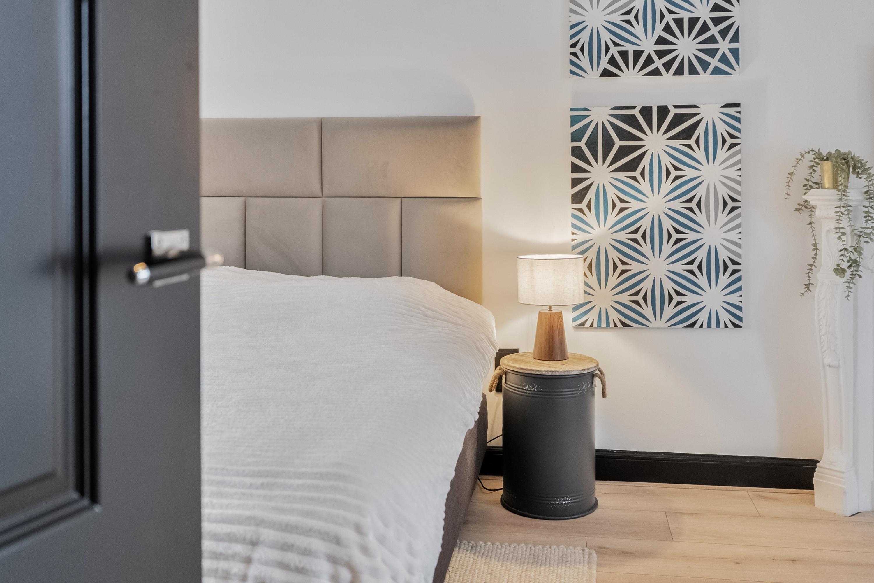 Slaapkamer 1 bevindt zich aan de achterzijde van de woning en is bereikbaar vanuit de binnenhal. Deze kamer is voorzien van een laminaatvloer met vloerverwarming, glad gestucte wanden en grote raampartijen met uitzicht op de omgeving.