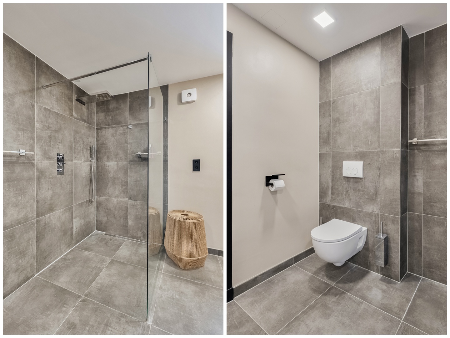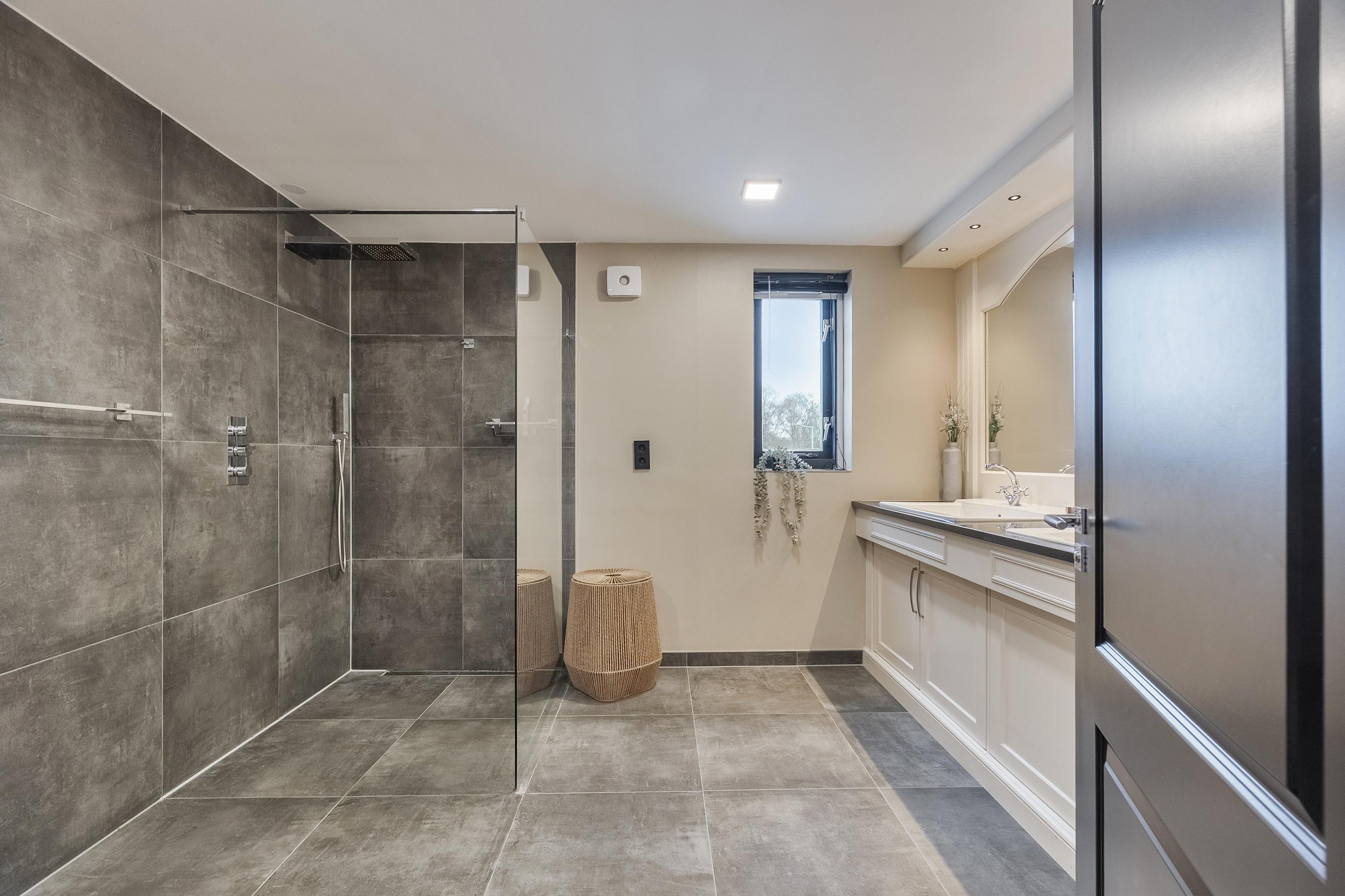 De moderne badkamer is luxe uitgevoerd met een dubbele wastafel met wandmeubel, spiegel en verlichting, een hangend tweede toilet en een ruime inloopdouche met regendouche. De badkamer is volledig betegeld in een stijlvolle grijze kleurstelling. De ventilatie is aangelegd in 2023.
