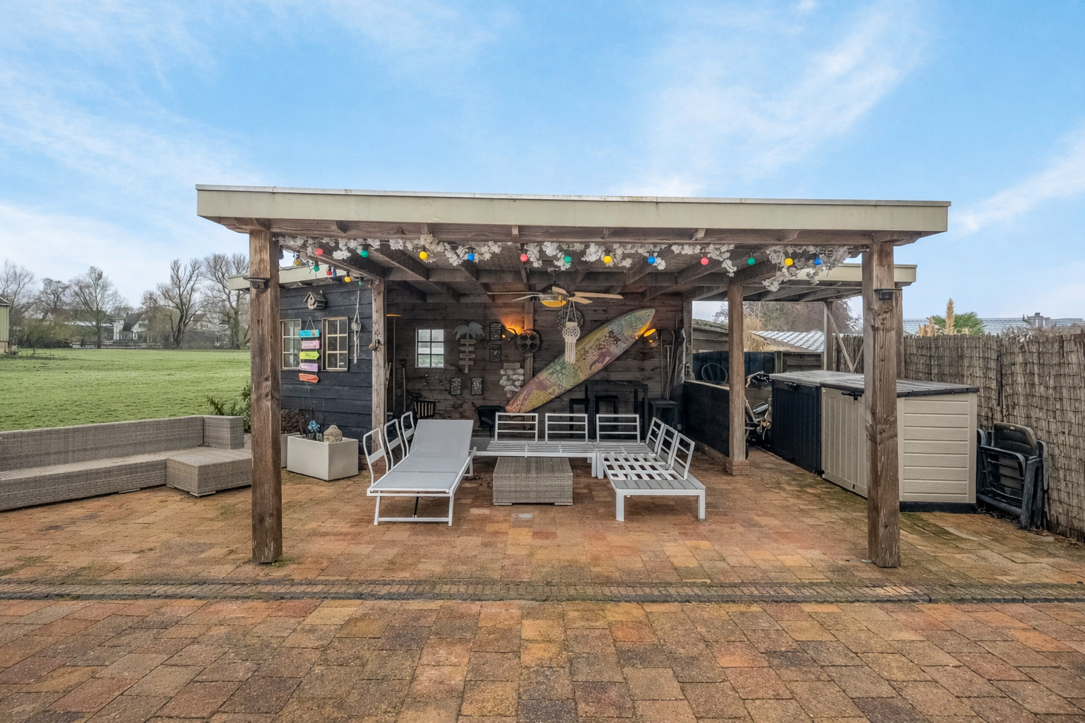 De tuin is fraai en speels aangelegd met sierbestrating, echt gras, sierbeplanting en fruitbomen (appel en peer). Er is een achterom, een buitenkraan en een gezellige overkapping met verlichting. Het vrije uitzicht over het weiland en het water aan de achterzijde, gecombineerd met de privacy vanaf de dijk, maken dit een uitzonderlijk fijne buitenruimte.