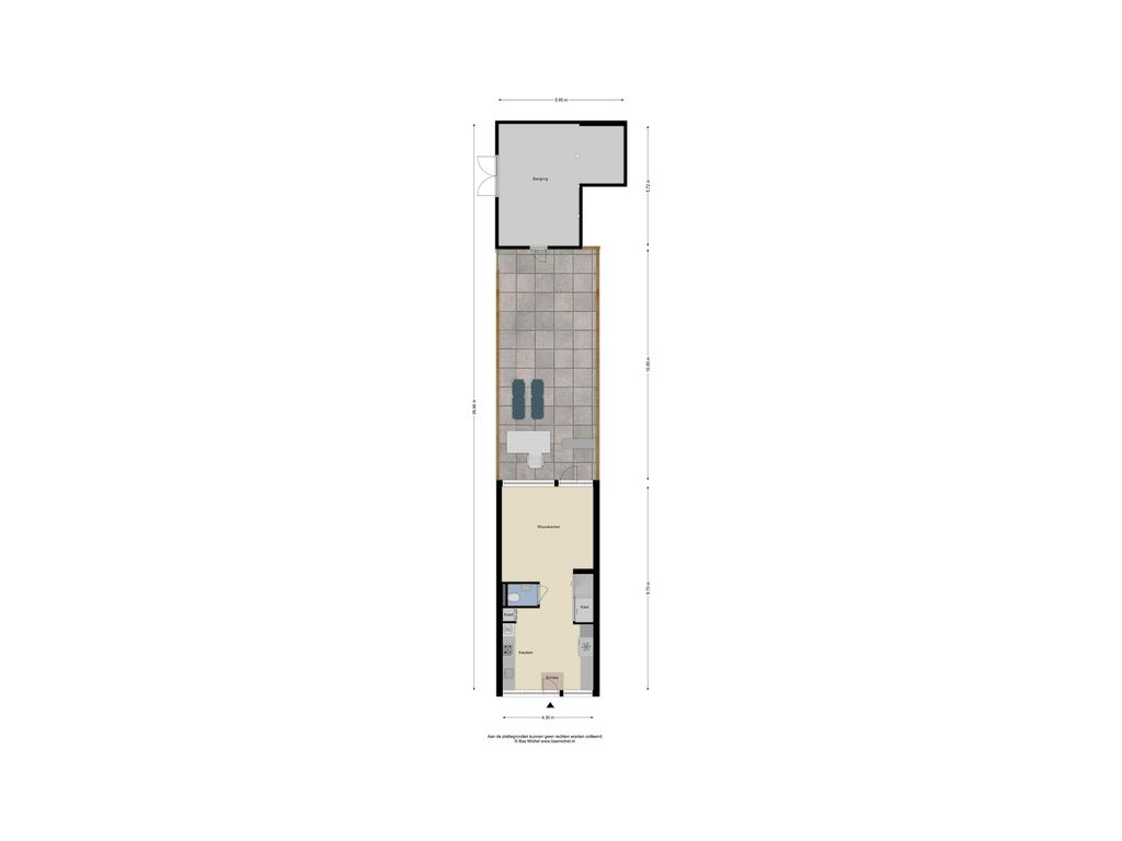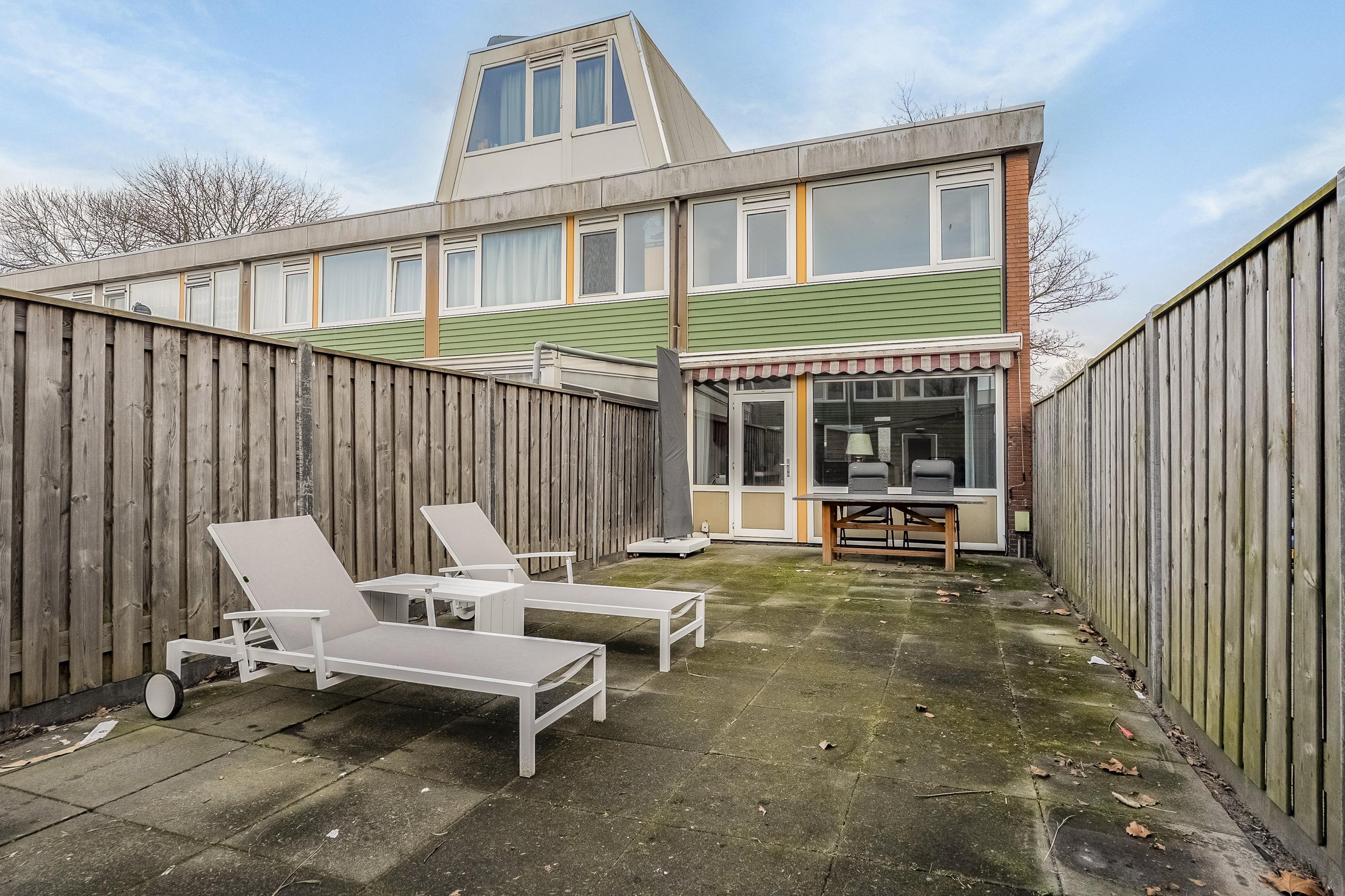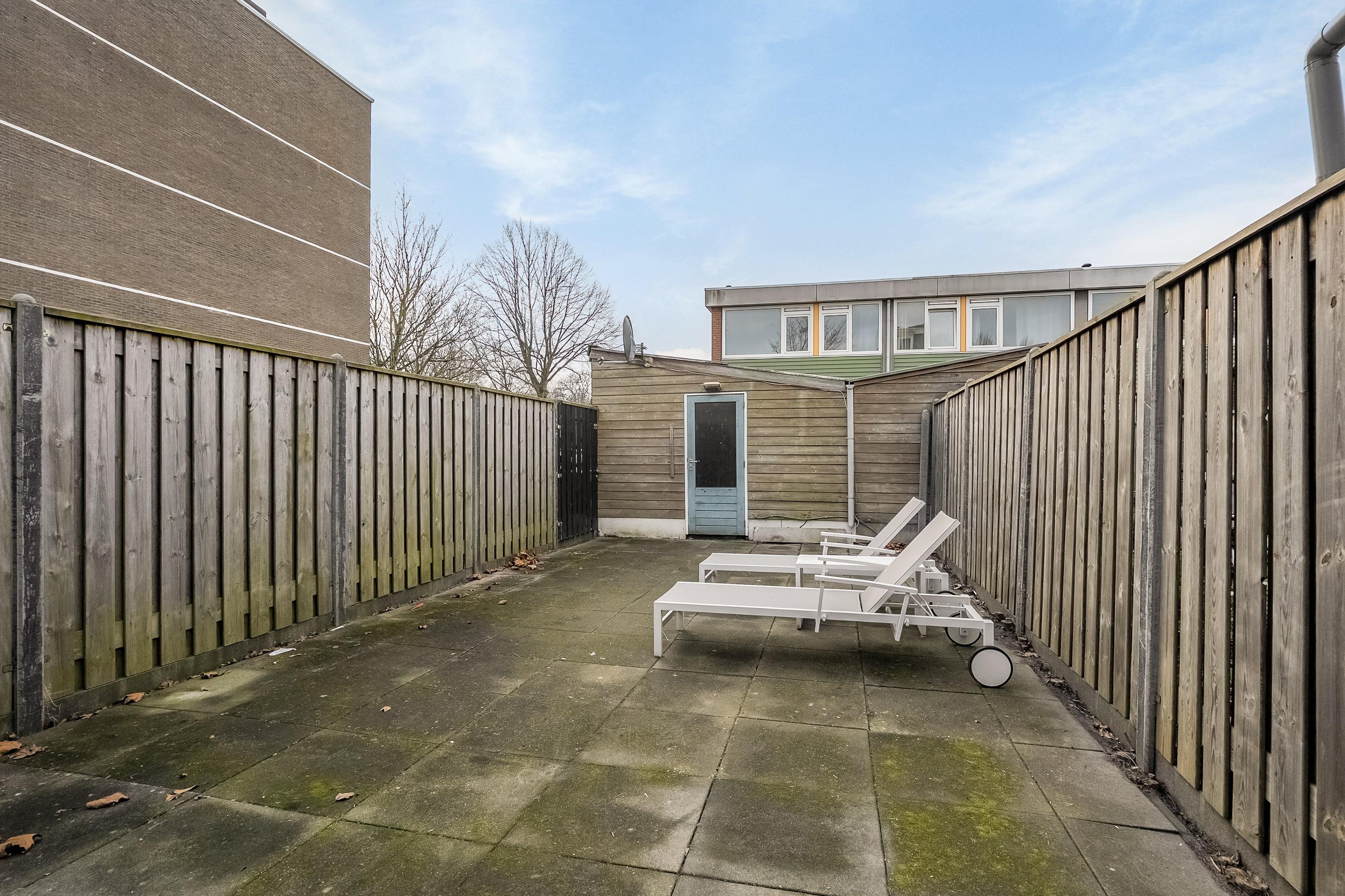 Via de achterdeur stap je de tuin in. De ligging op het westen valt meteen op: middag- en avondzon, een plek om na een lange dag nog buiten te zitten. De tuin heeft een overzichtelijk formaat en is prettig te onderhouden. Achterin staat een riante vrijstaande houten berging van 28 m², met dubbele deuren die direct uitkomen op de straat – fietsen, gereedschap en tuinspullen hebben hier makkelijk een plek. Via het achterom verlaat je de tuin zonder door het huis te hoeven.