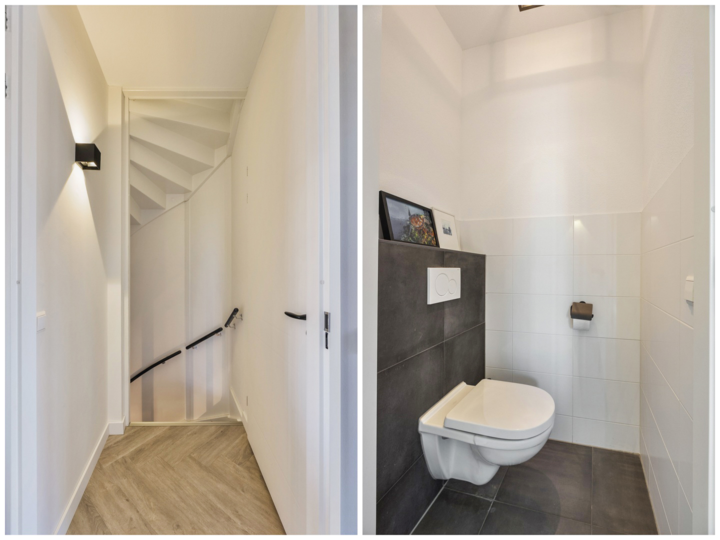 Overloop met trap naar de 2e verdieping en toegang tot de living en de toiletruimte. De overloop is verder afgewerkt met een duurzame PVC vloer. Toiletruimte voorzien van een hangcloset. De toiletruimte is gedeeltelijk betegeld in een wit/grijs kleurstelling.