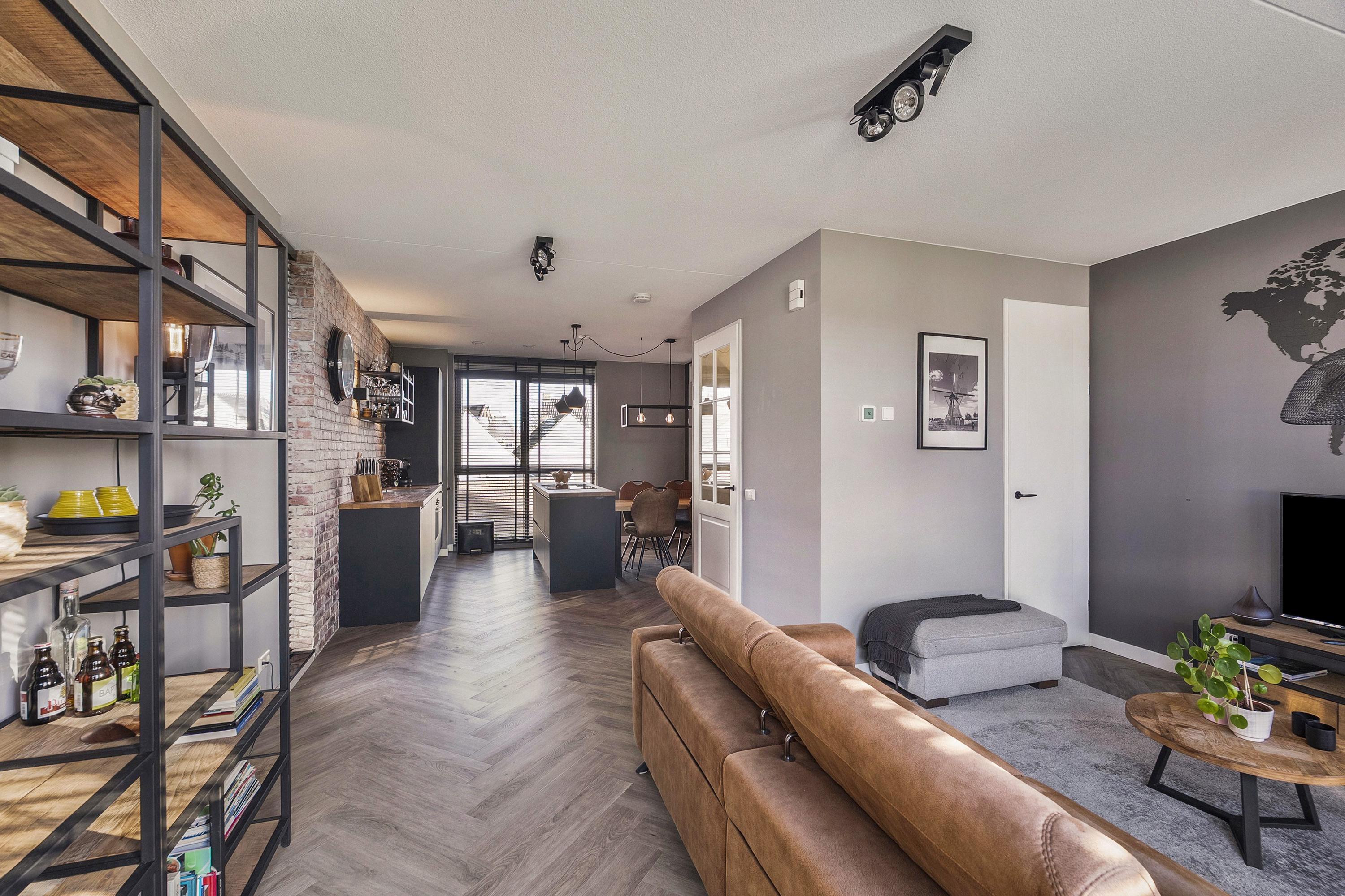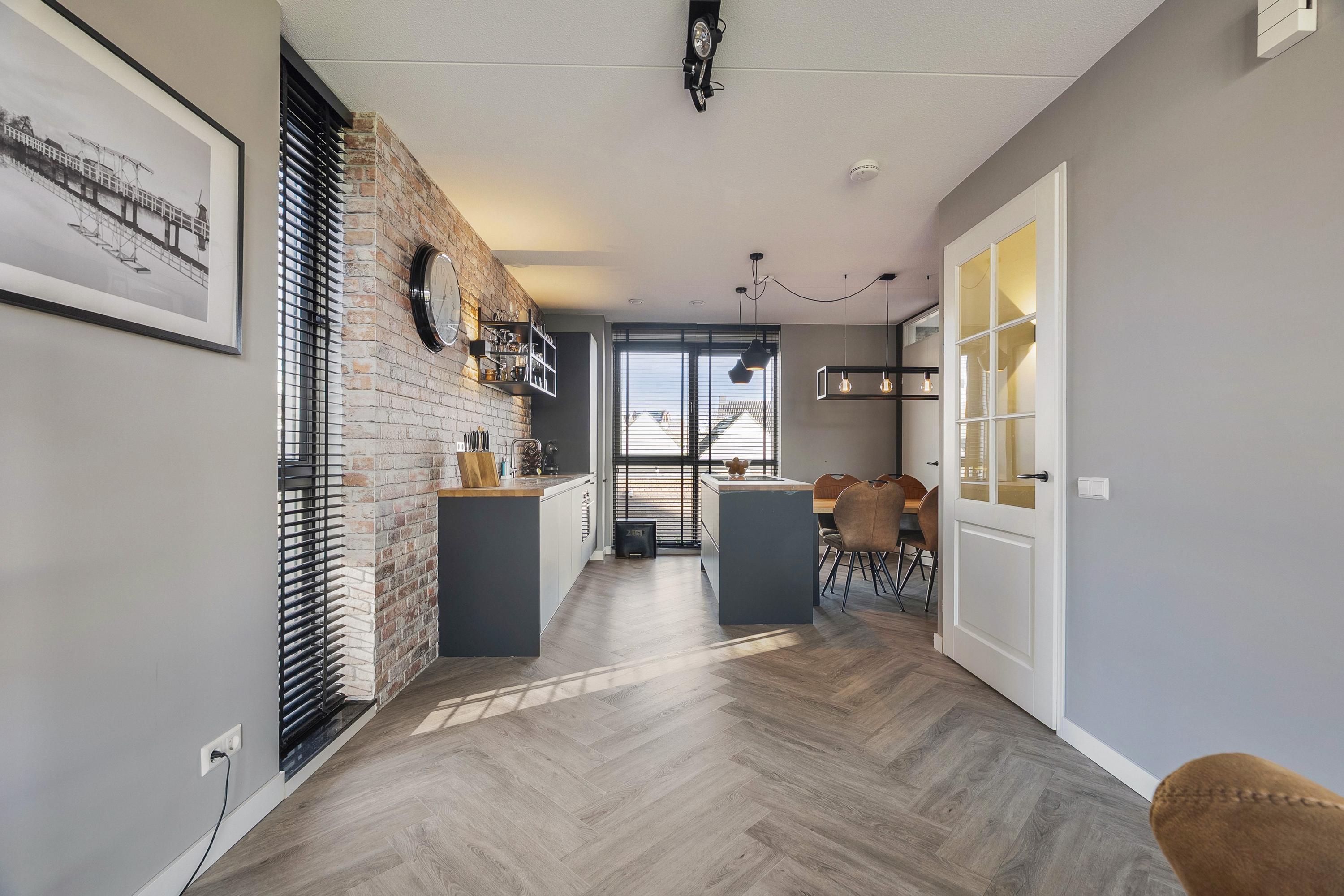 - De woonkamer en keuken zijn afgewerkt met een duurzame PVC vloer in visgraat motief met vloerverwarming;