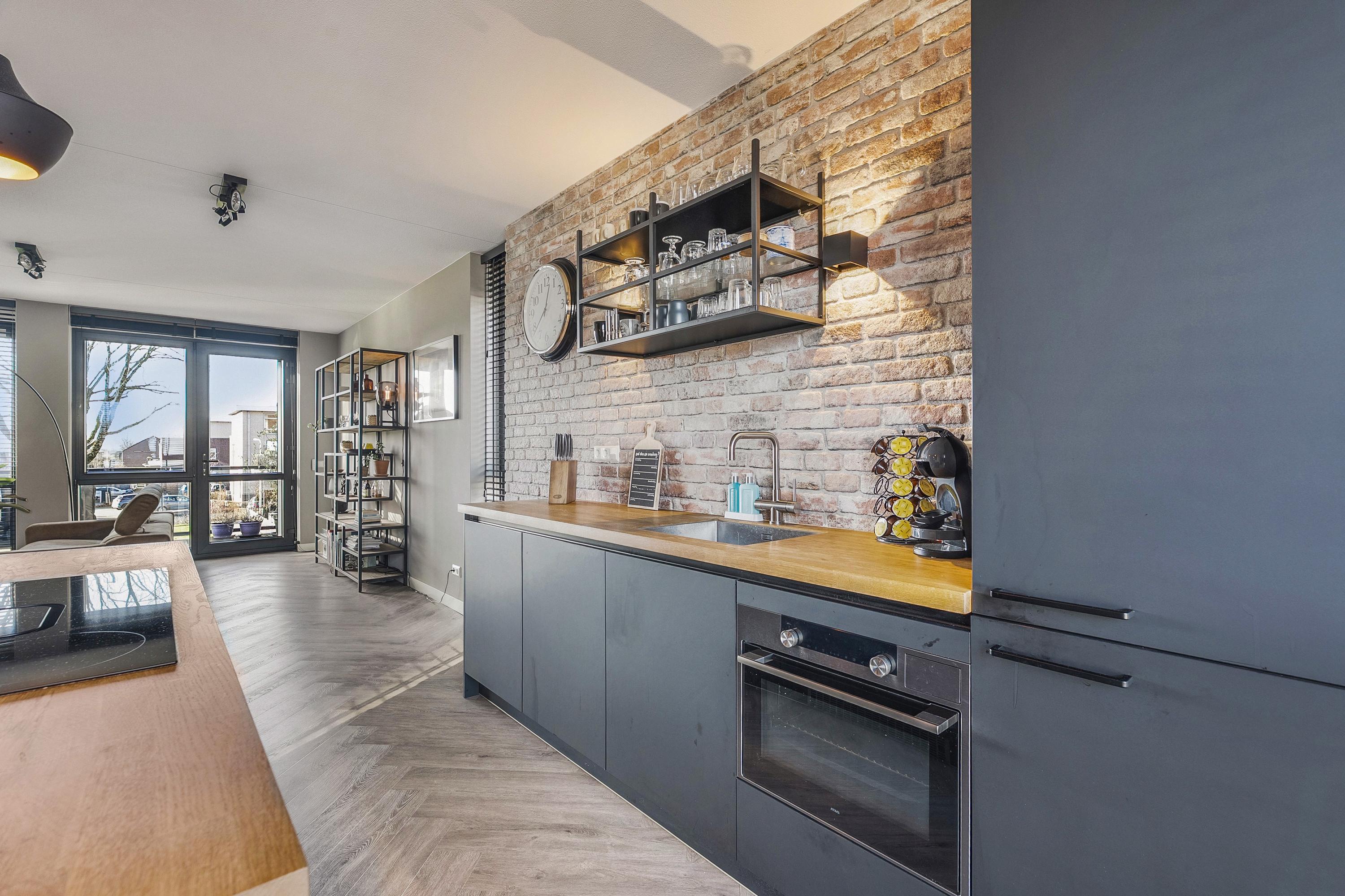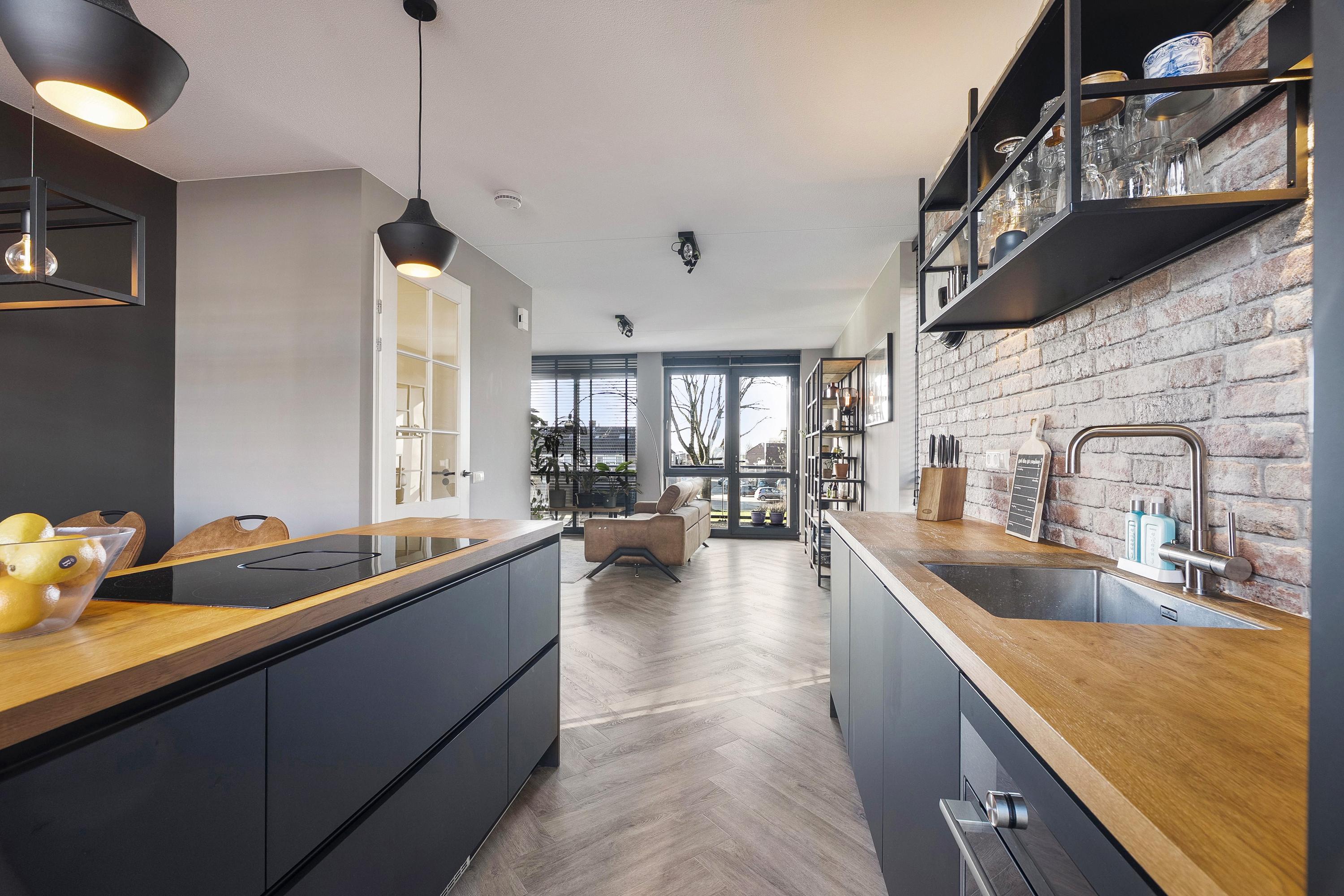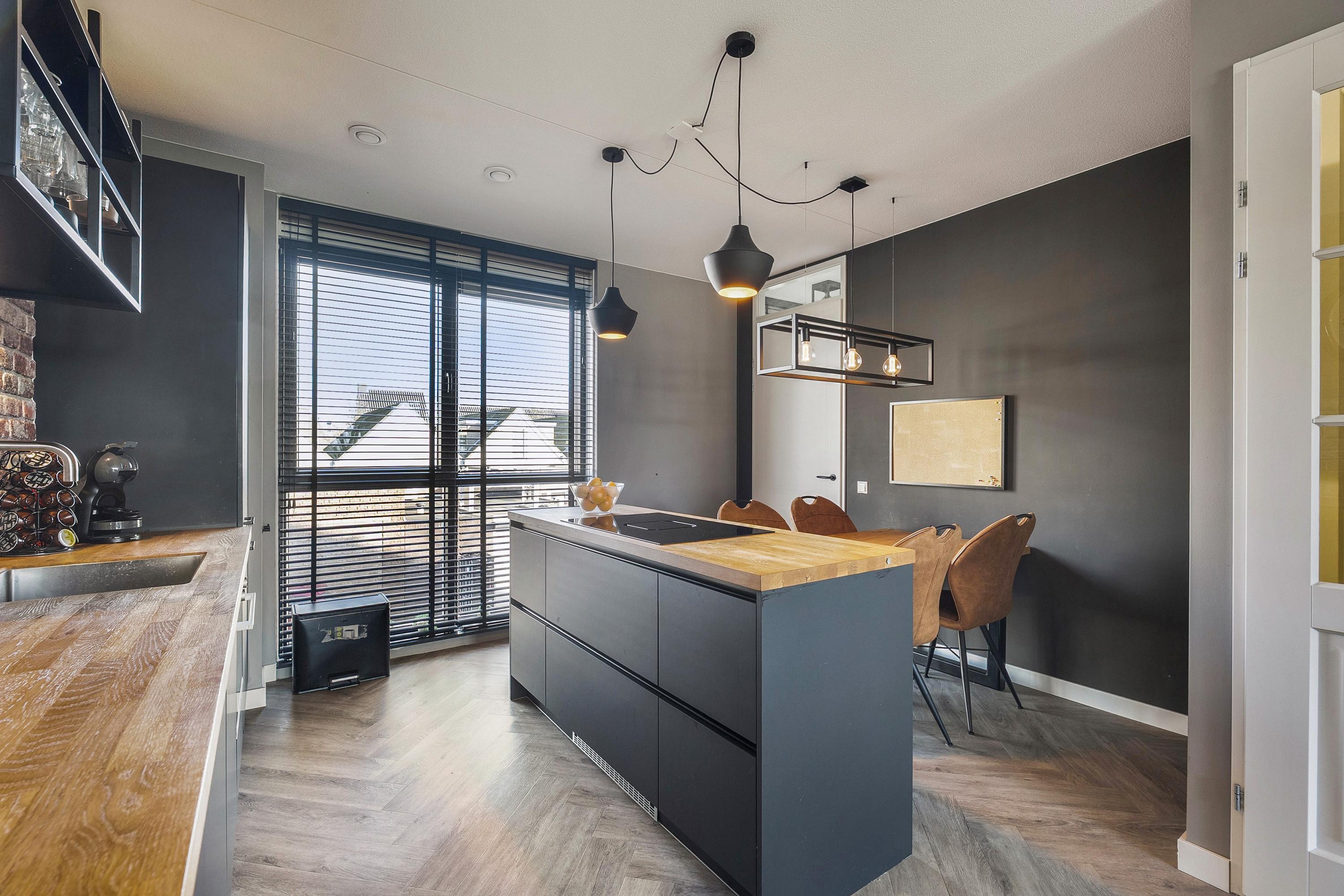 De moderne open keuken is gelegen aan de voorzijde van de woning en is uitgevoerd in een rechte opstelling met een apart sfeervol kookeiland. De keuken is voorzien van diverse inbouwapparatuur zoals een koelkast, vrieskast, oven, combi-stoomoven, een vaatwasser en een enkele spoelbak met een heetwaterkraan. Het rechte deel van de keuken is afgewerkt met Isodeco wandpaneel in baksteen motief. Het kookeiland is voorzien van een inductie kookplaat met ingebouwde afzuigsystemen en is afgewerkt met een houten aanrechtblad. De keuken is uitgevoerd in zwart/hout kleurstelling en is afgewerkt met een duurzame PVC vloer in visgraat motief met vloerverwarming.