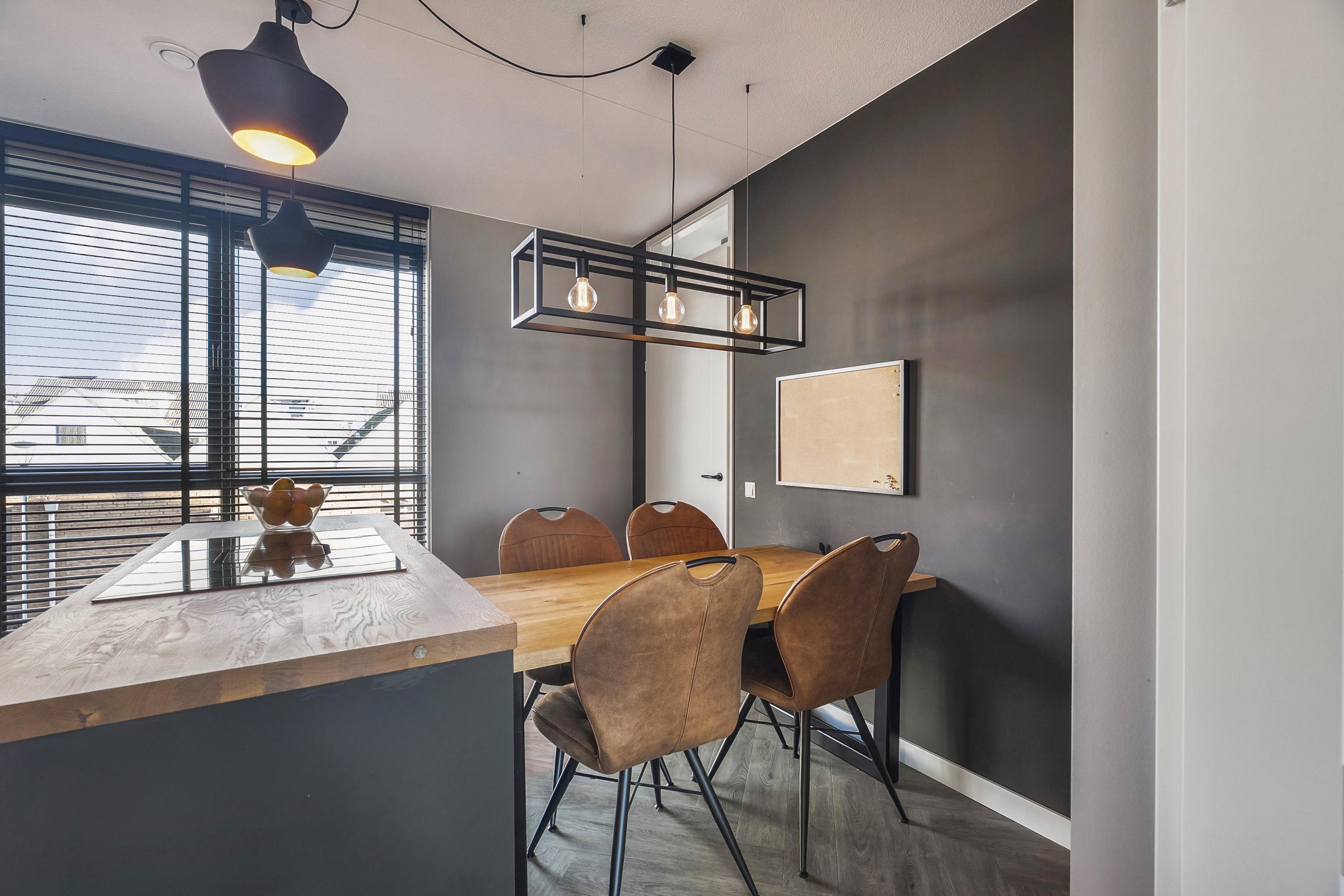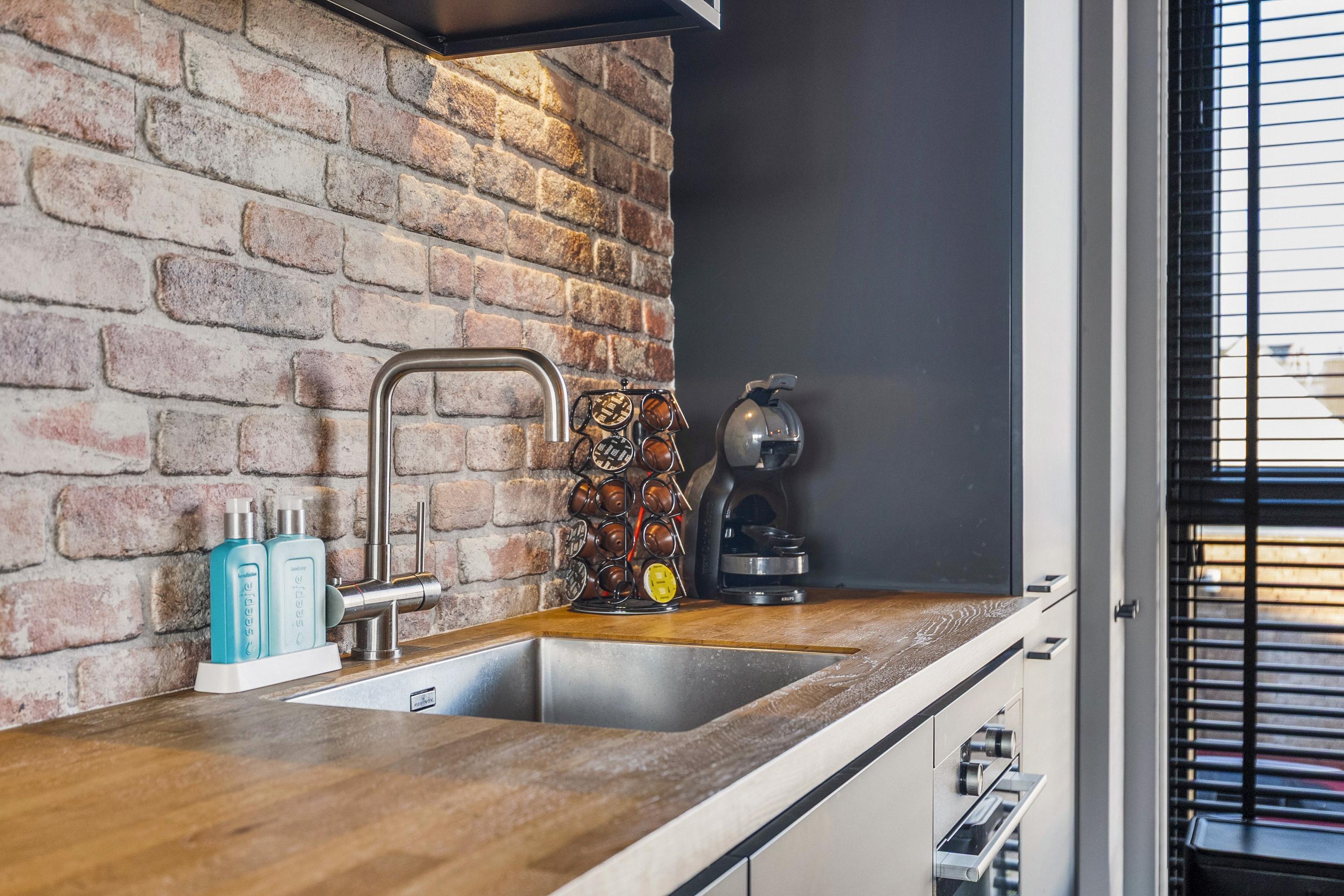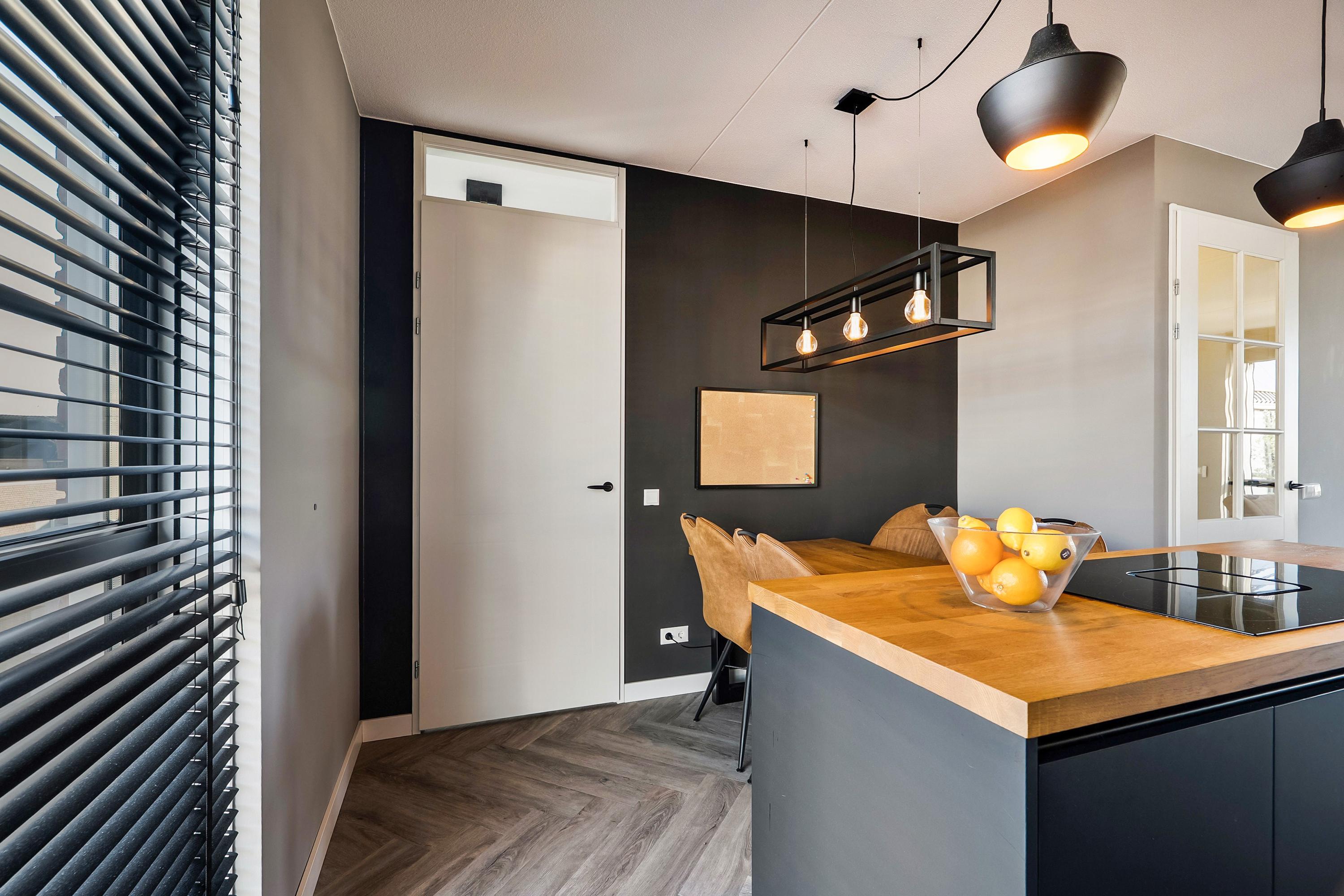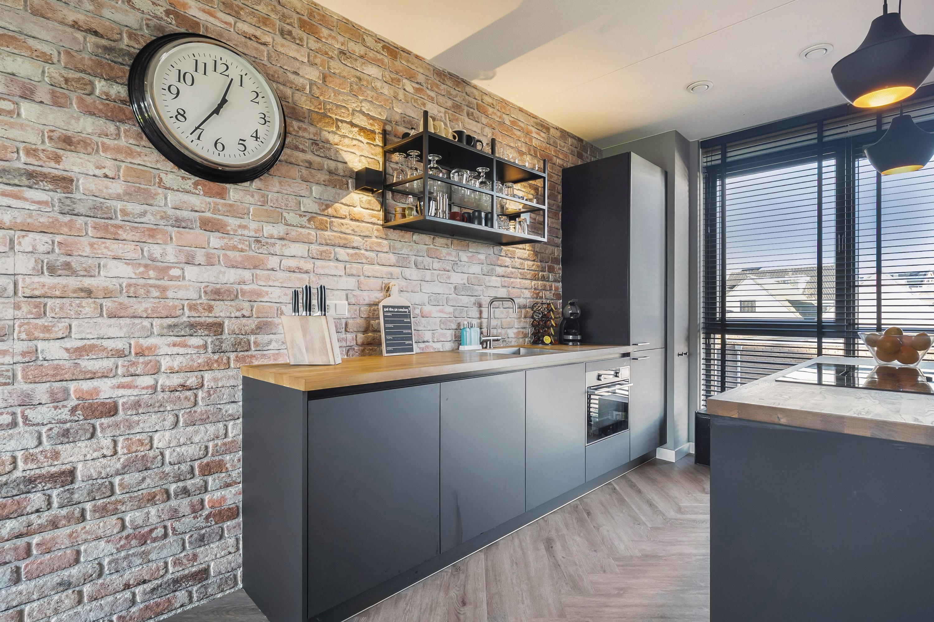 De moderne open keuken is gelegen aan de voorzijde van de woning en is uitgevoerd in een rechte opstelling met een apart sfeervol kookeiland. De keuken is voorzien van diverse inbouwapparatuur zoals een koelkast, vrieskast, oven, combi-stoomoven, een vaatwasser en een enkele spoelbak met een heetwaterkraan. Het rechte deel van de keuken is afgewerkt met Isodeco wandpaneel in baksteen motief. Het kookeiland is voorzien van een inductie kookplaat met ingebouwde afzuigsystemen en is afgewerkt met een houten aanrechtblad. De keuken is uitgevoerd in zwart/hout kleurstelling en is afgewerkt met een duurzame PVC vloer in visgraat motief met vloerverwarming.