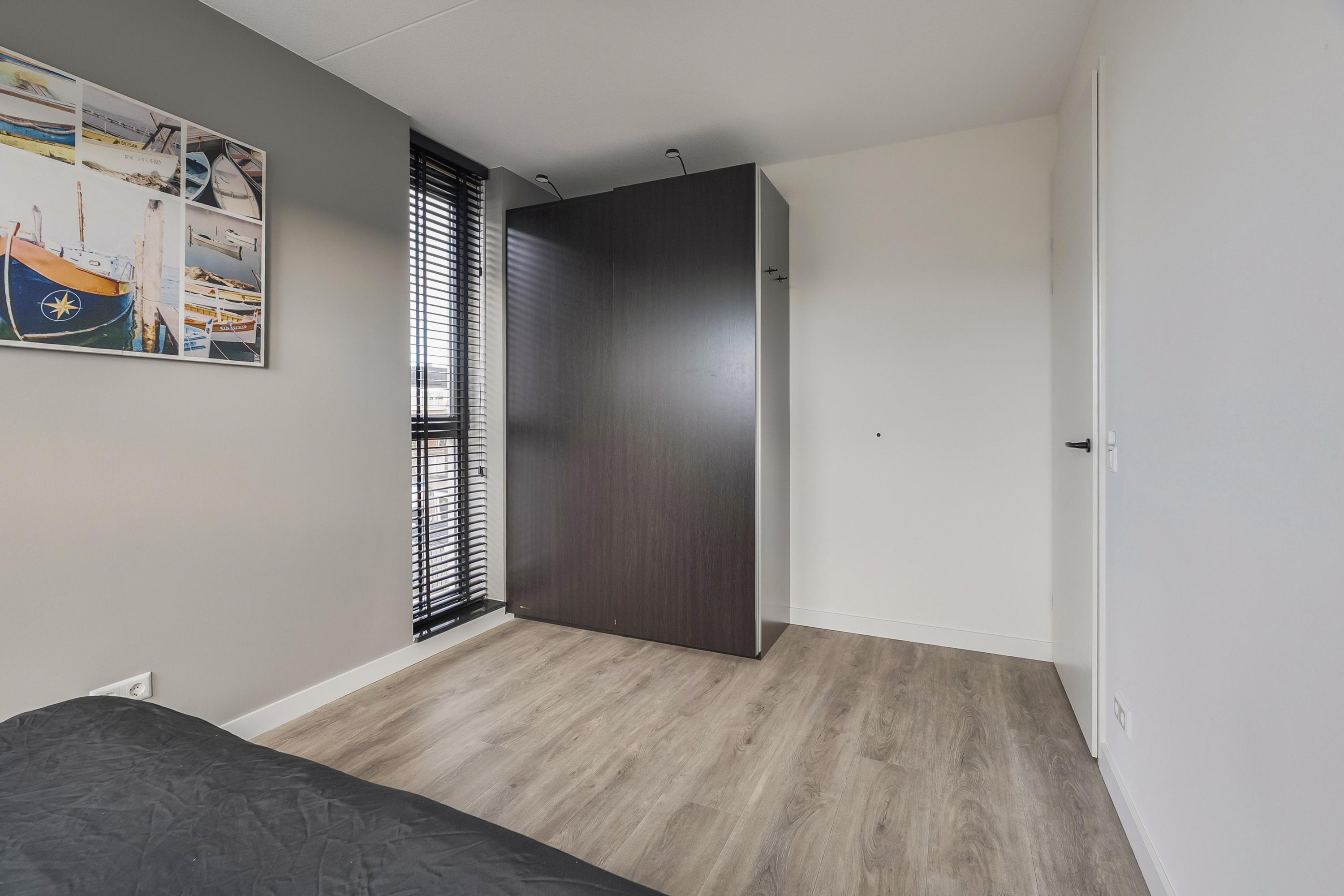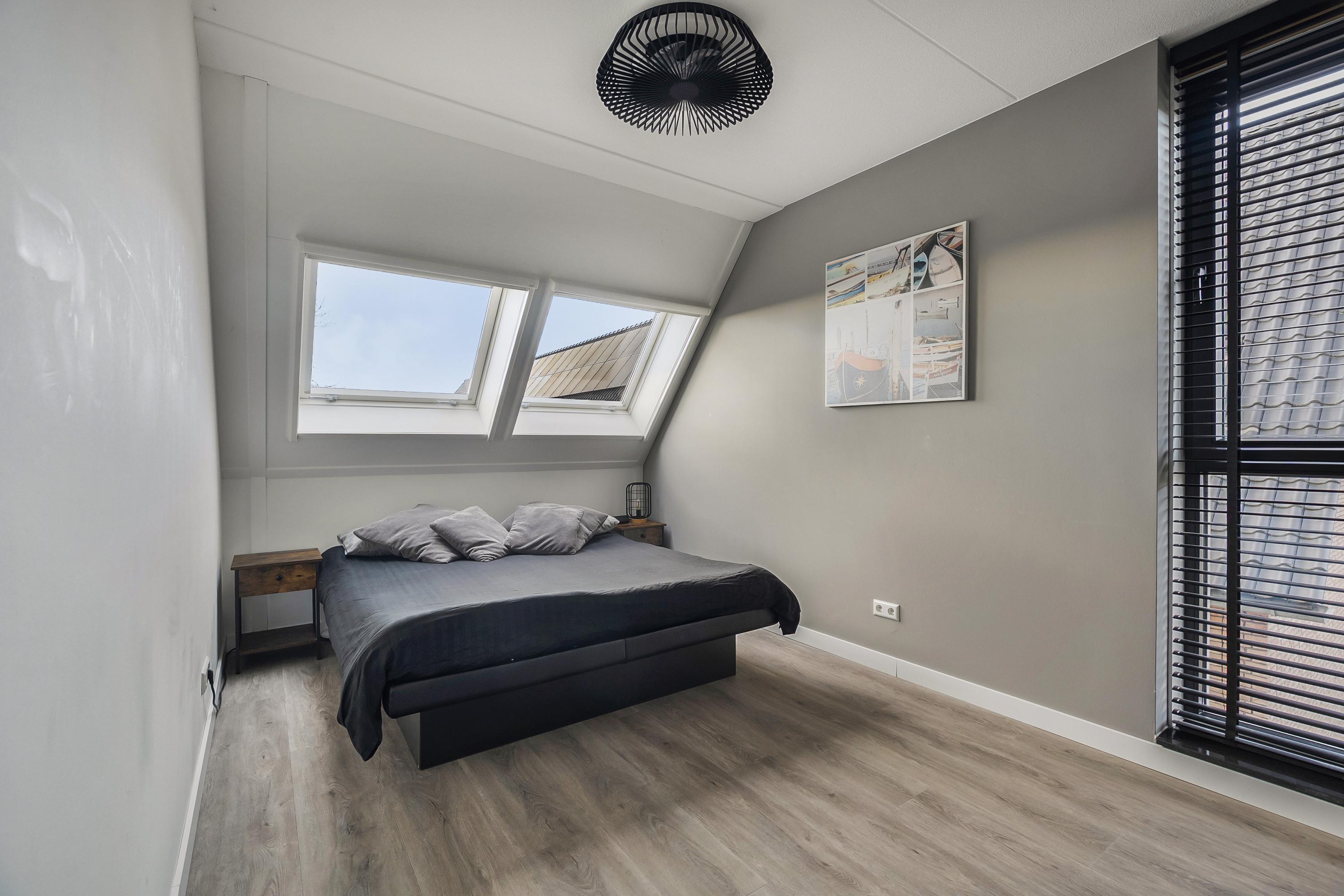 Slaapkamer 1 (ca. 13 m2) is gelegen aan de achterzijde van de woning en voorzien van een 2-deuren kledingkast met verlichting en twee dakramen met hor en verduisterend gordijn.