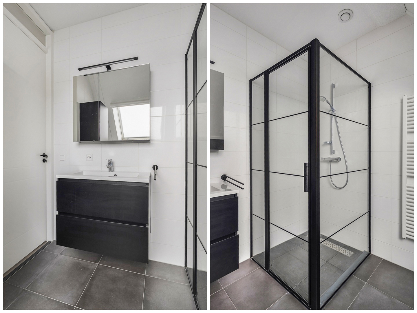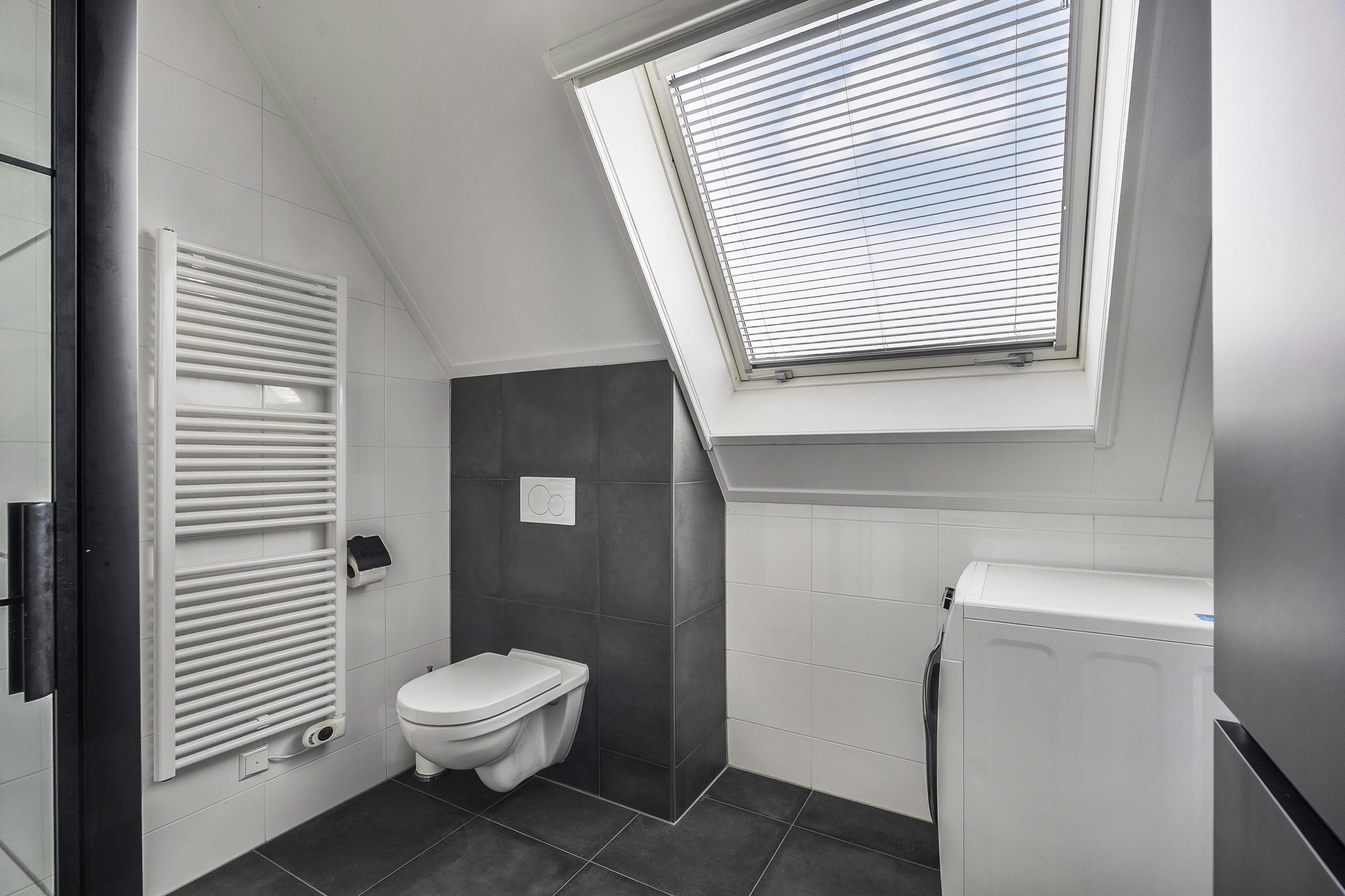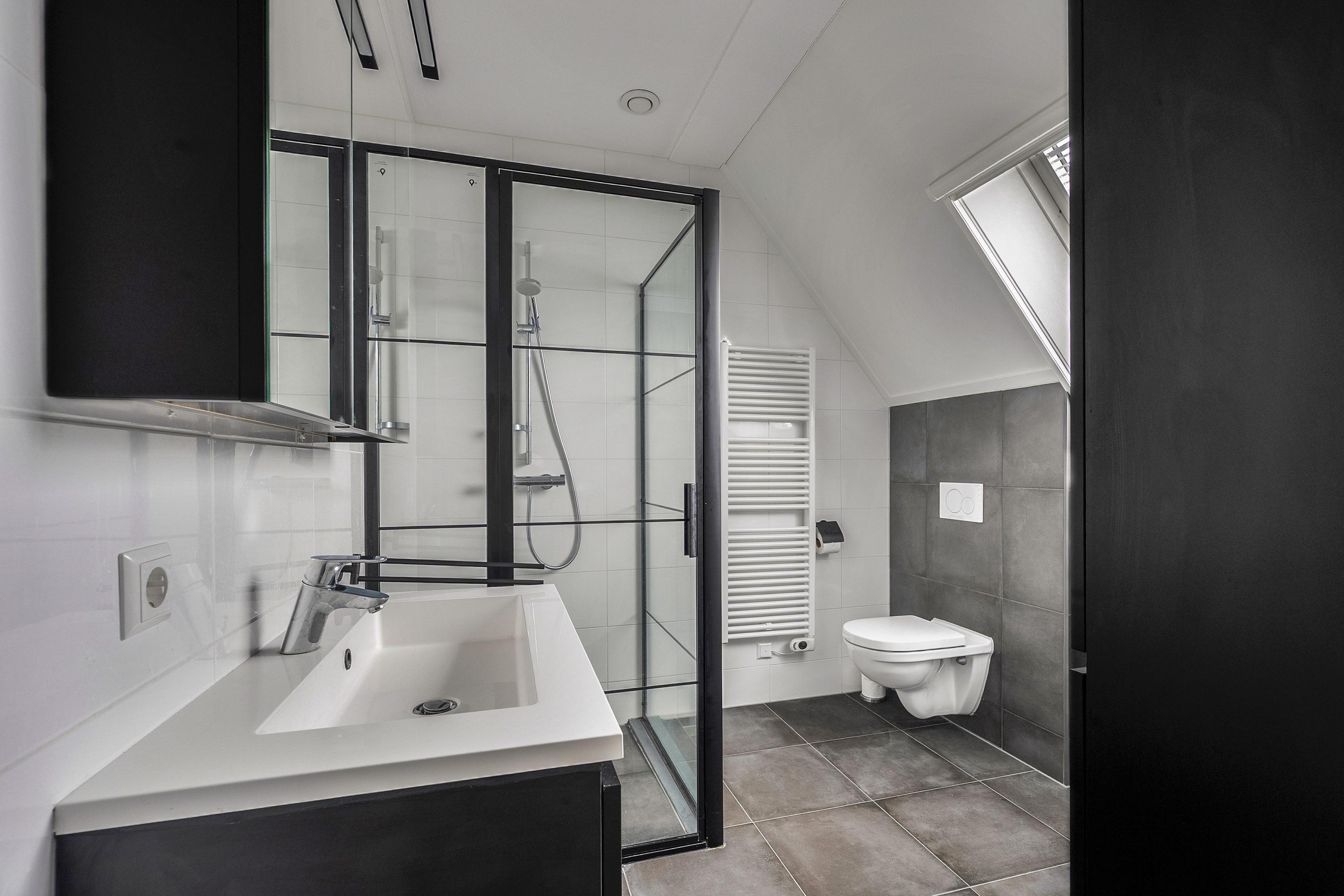 Moderne badkamer (ca. 7 m2) met sanitaire voorzieningen zoals een wastafel met wastafelmeubel, spiegel met spiegelkast en verlichting, een extra wandmeubel voor de handdoeken, het tweede toilet, een inloopdouche, designradiator en de aansluiting voor de wasmachine. Het dakraam met hor biedt een aangename natuurlijke lichtinval. Verder is de badkamer geheel betegeld in een wit/grijs kleurstelling.
