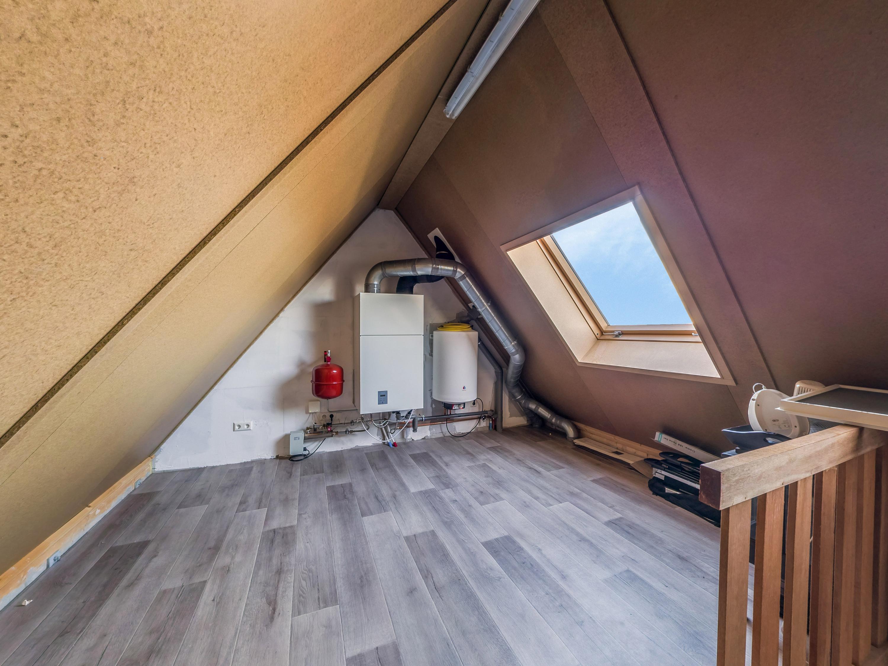 Geïsoleerde bergvliering voorzien van twee grote dakramen. In deze ruimte bevinden zich de warmtepompboiler en de omvormer voor de 12 zonnepanelen.