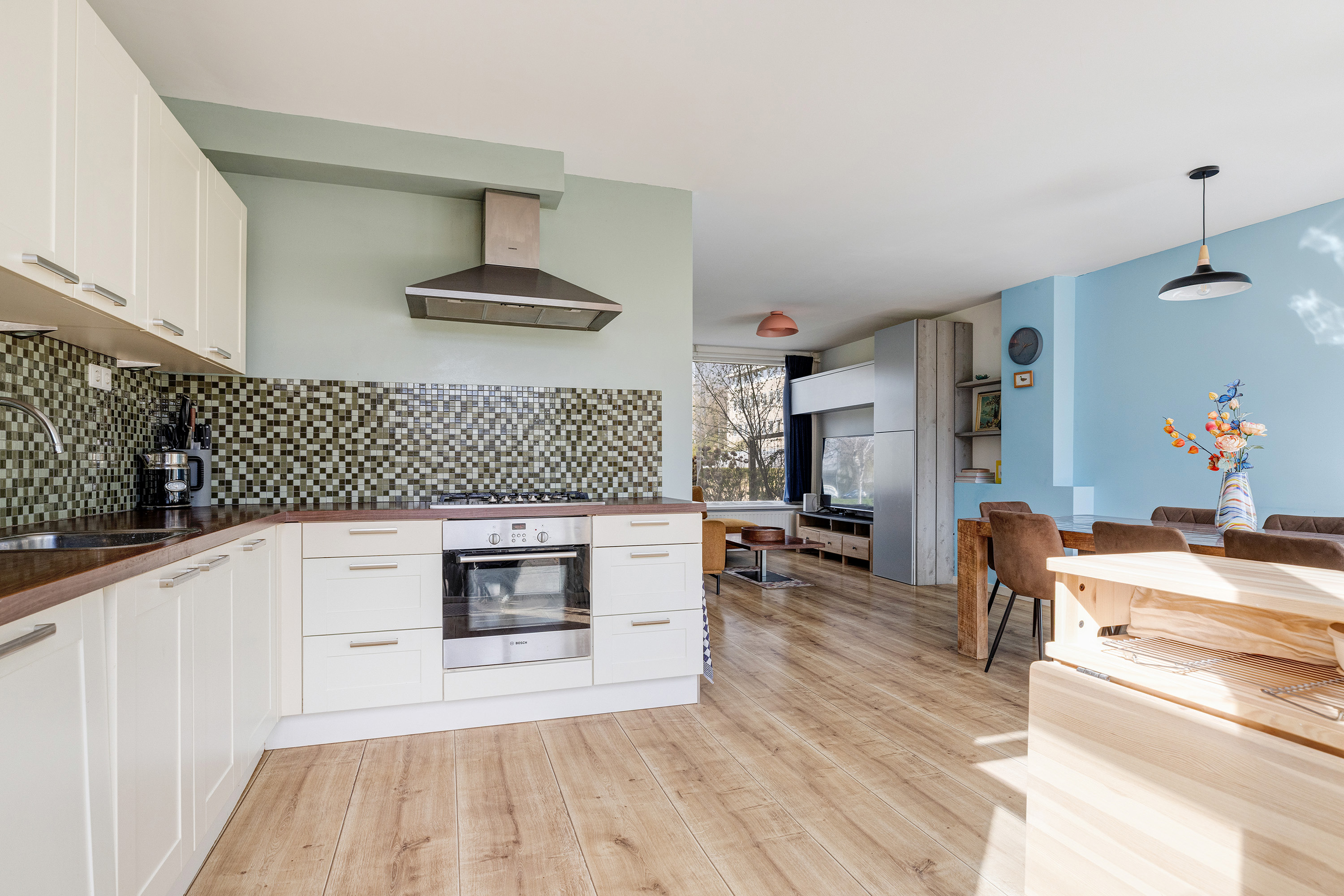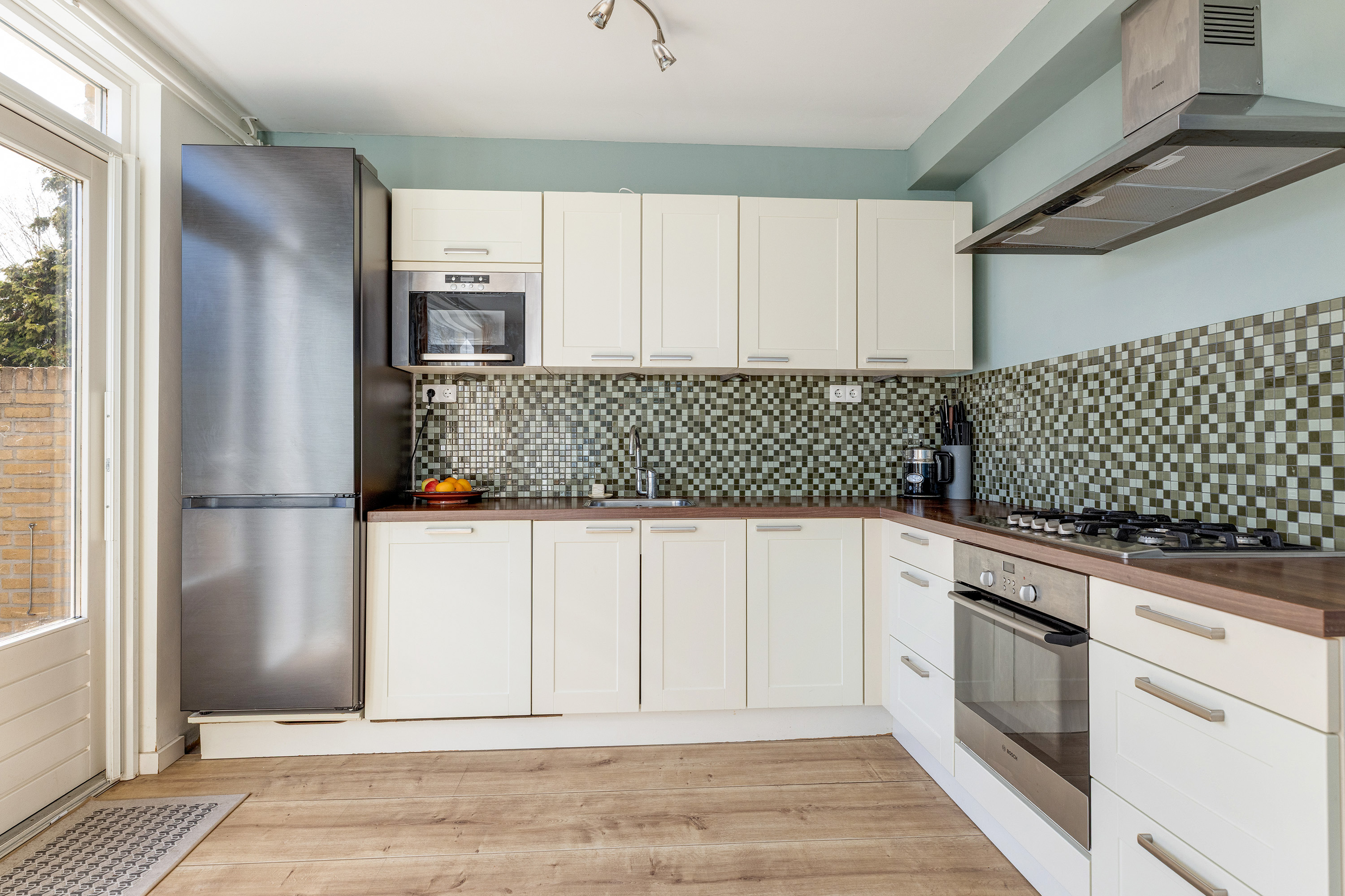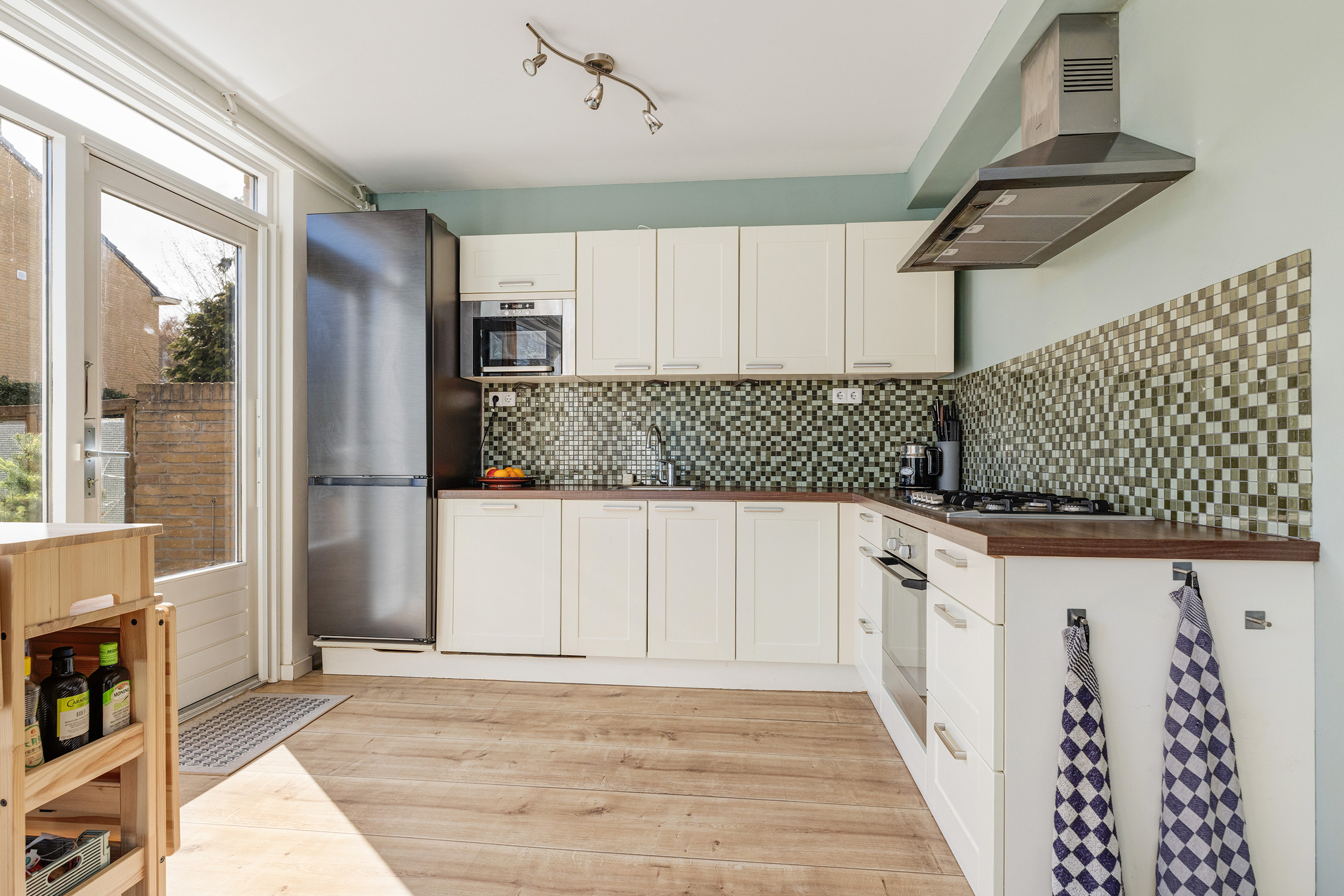 De open keuken bevindt zich aan de tuinzijde en is uitgevoerd in een praktische hoekopstelling in een crème kleurstelling. Hier beschikt u over diverse inbouwapparatuur zoals een oven, magnetron, 5-pits gaskookplaat, RVS afzuigkap en vaatwasser, aangevuld met een vrijstaande koelkast. Vanuit de keuken heeft u direct toegang tot de zonnige achtertuin.