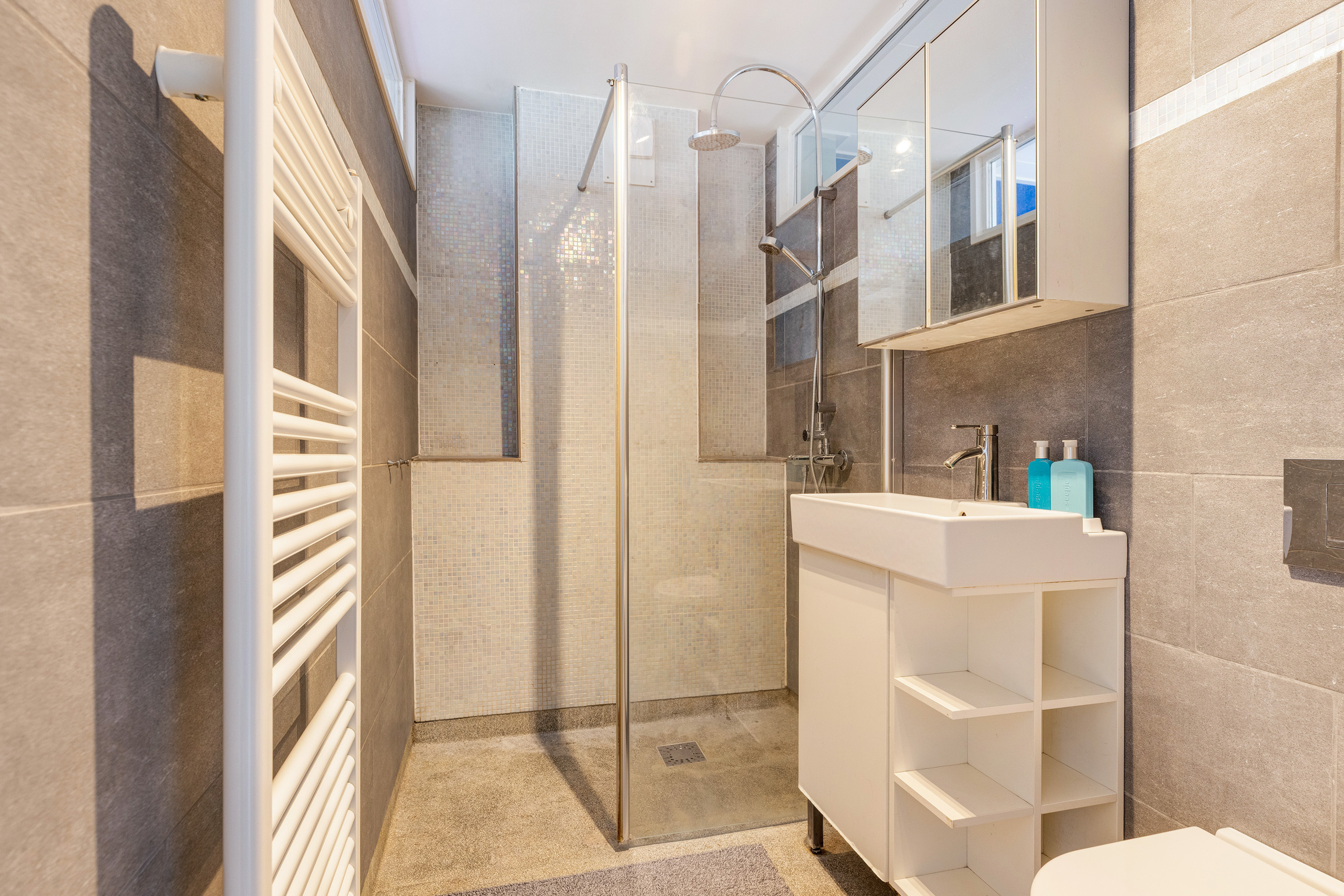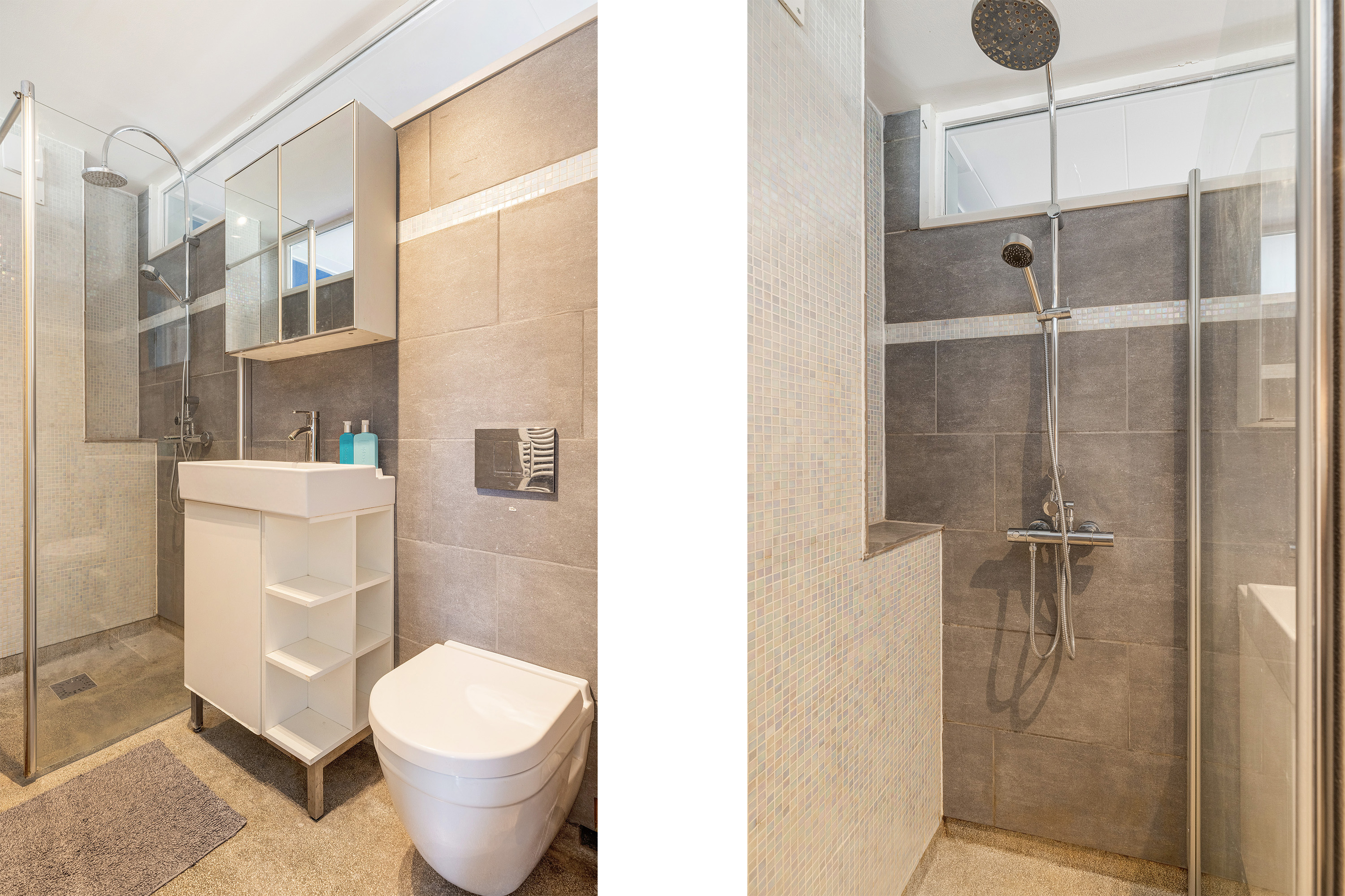 De badkamer is volledig betegeld met grijze wandtegels en een karaktervolle granieten vloer. De ruimte is ingericht met een inloopdouche, een wastafelmeubel met spiegelkast en een tweede hangend toilet.